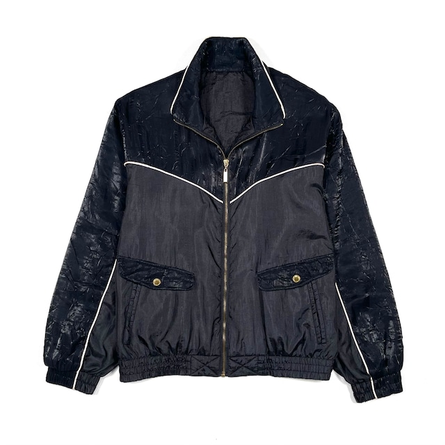 サイズ : about S-M サイズ実寸 肩幅46cm 身幅57.5cm 着丈61cm 袖丈58cm ※平置き寸法 ※多少の誤差はご了承ください。 価格10800円+TAX ナイロンブルゾン ナイロン素材 ショルダーと袖は、レーヨン×ポリエステル系の光沢があるワッシャー加工 色味はブラック ホワイトパイピング フロントジップ スタンドカラー 袖口と裾はゴムシャーリング サイドにポケット フラップポケットはデザインのみでフェイク モダンなデザインのナイロンブルゾン ・撮影環境により色味が異なる場合がございます。予めご了承ください。 ・古着(ユーズド、ヴィンテージ商品)の為 返品、返金、交換はお断りさせていただいております。 ・ユーズド、ヴィンテージ商品の為、文章に記載がないダメージや汚れ等ある場合がございます。 ・古着にご理解の上、ご購入お願いいたします。 ・古着に対して神経質な方は購入をご遠慮ください。 ・商品で気になることがありましたら、電話またはインスタグラムのDM、メールにてお問合せください。 International shipping is available, but the price varies depending on the country and the weight of the package, so please contact us for more details.