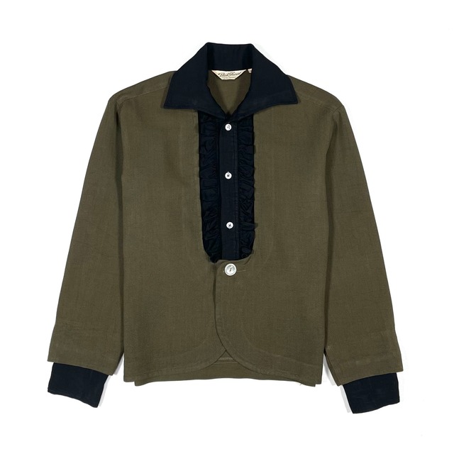 サイズ表記S サイズ実寸 肩幅46cm 身幅57cm 裾幅44.5cm 着丈58.5cm 袖丈57cm ※平置き寸法 ※多少の誤差はご了承ください。 価格12800円+TAX クラシックシャツ ウール系の素材かと思われます 落ち感があるレーヨンのような素材感 色味はカーキ×ブラック イタリアンカラー フロントはフリルのデザイン シャツの上からジャケットを羽織ったようなレイヤード風の作り 1960sフリルデザインシャツ ・撮影環境により色味が異なる場合がございます。予めご了承ください。 ・古着(ユーズド、ヴィンテージ商品)の為 返品、返金、交換はお断りさせていただいております。 ・ユーズド、ヴィンテージ商品の為、文章に記載がないダメージや汚れ等ある場合がございます。 ・古着にご理解の上、ご購入お願いいたします。 ・古着に対して神経質な方は購入をご遠慮ください。 ・商品で気になることがありましたら、電話またはインスタグラムのDM、メールにてお問合せください。 International shipping is available, but the price varies depending on the country and the weight of the package, so please contact us for more details.