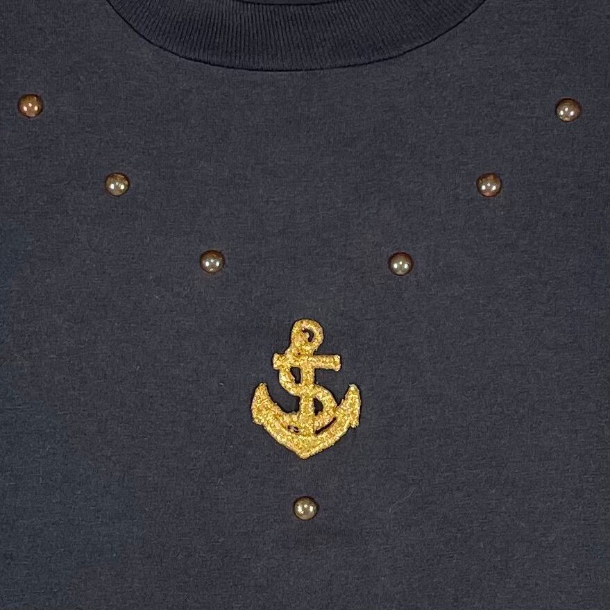 フロントとショルダーに、ラメのワッペンとブロンズのスタッズ