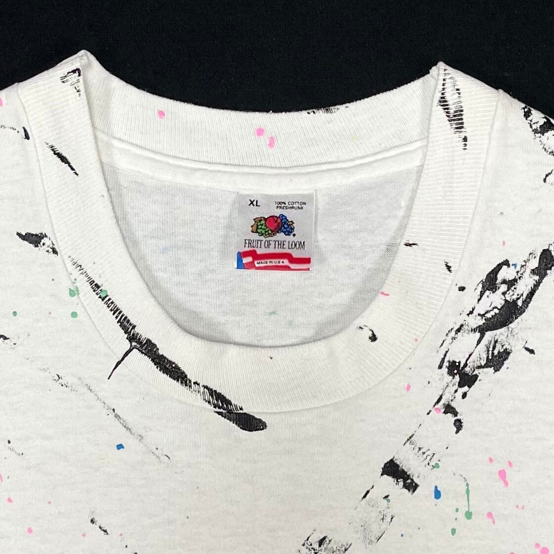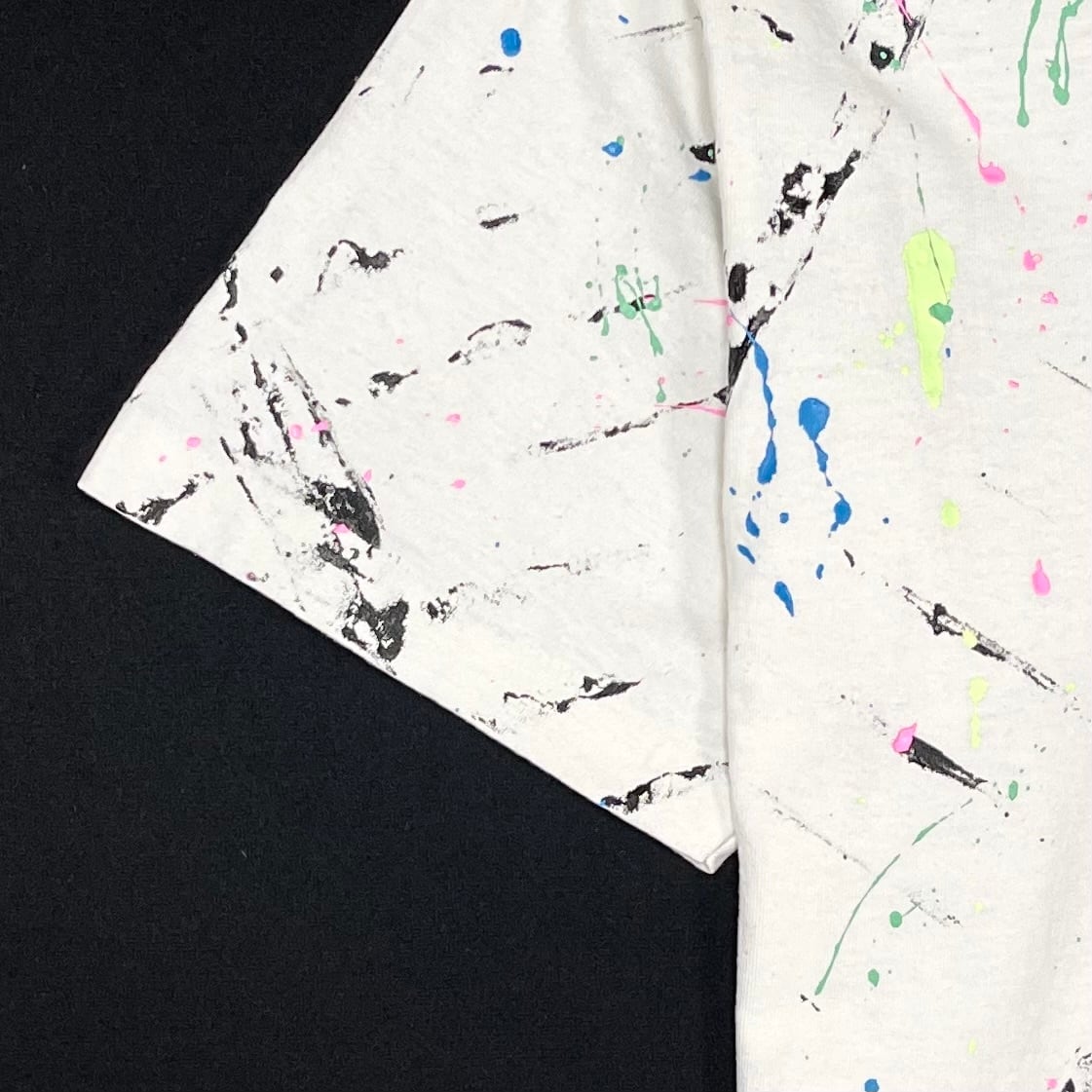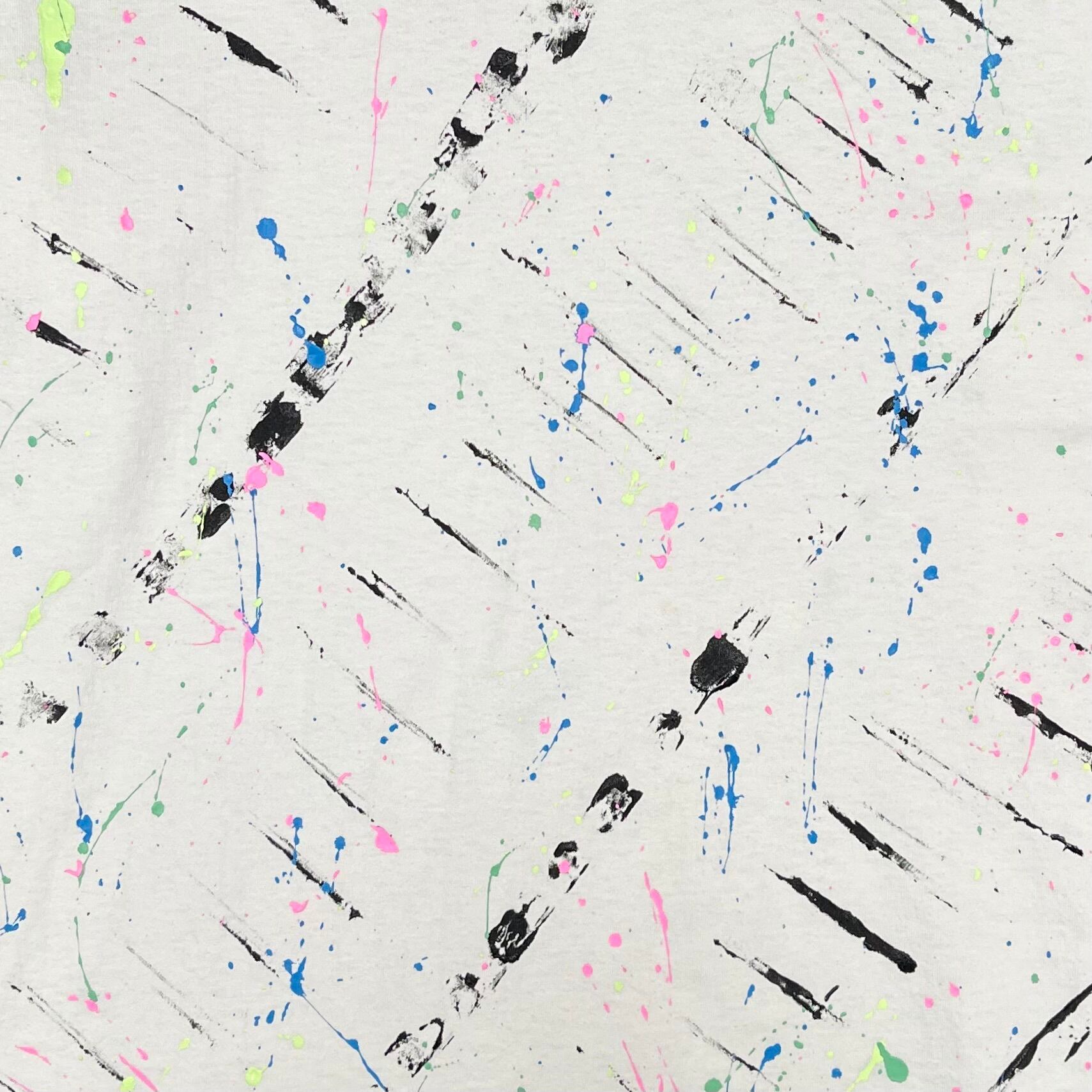 キャタピラのような黒いペンキ跡に、カラーペンキの飛び散りがモダンなデザインのルーズTシャツ
