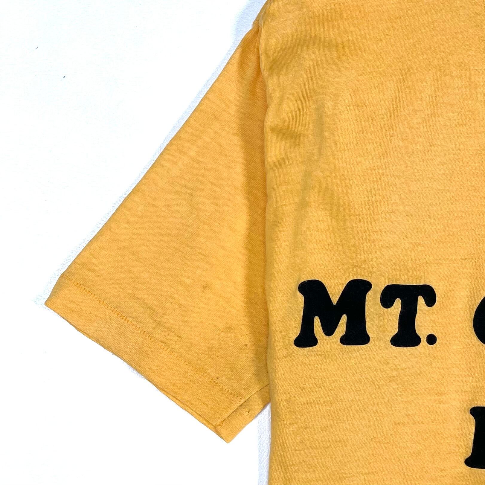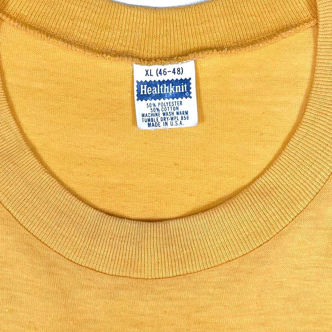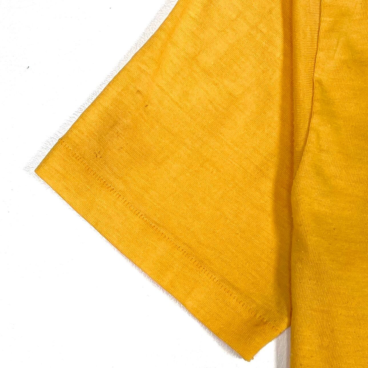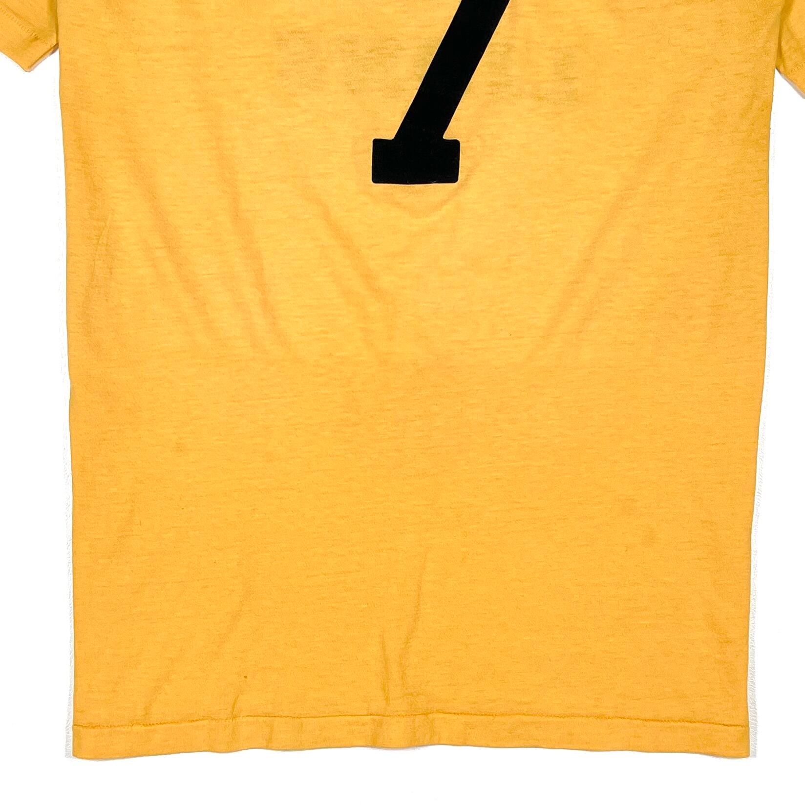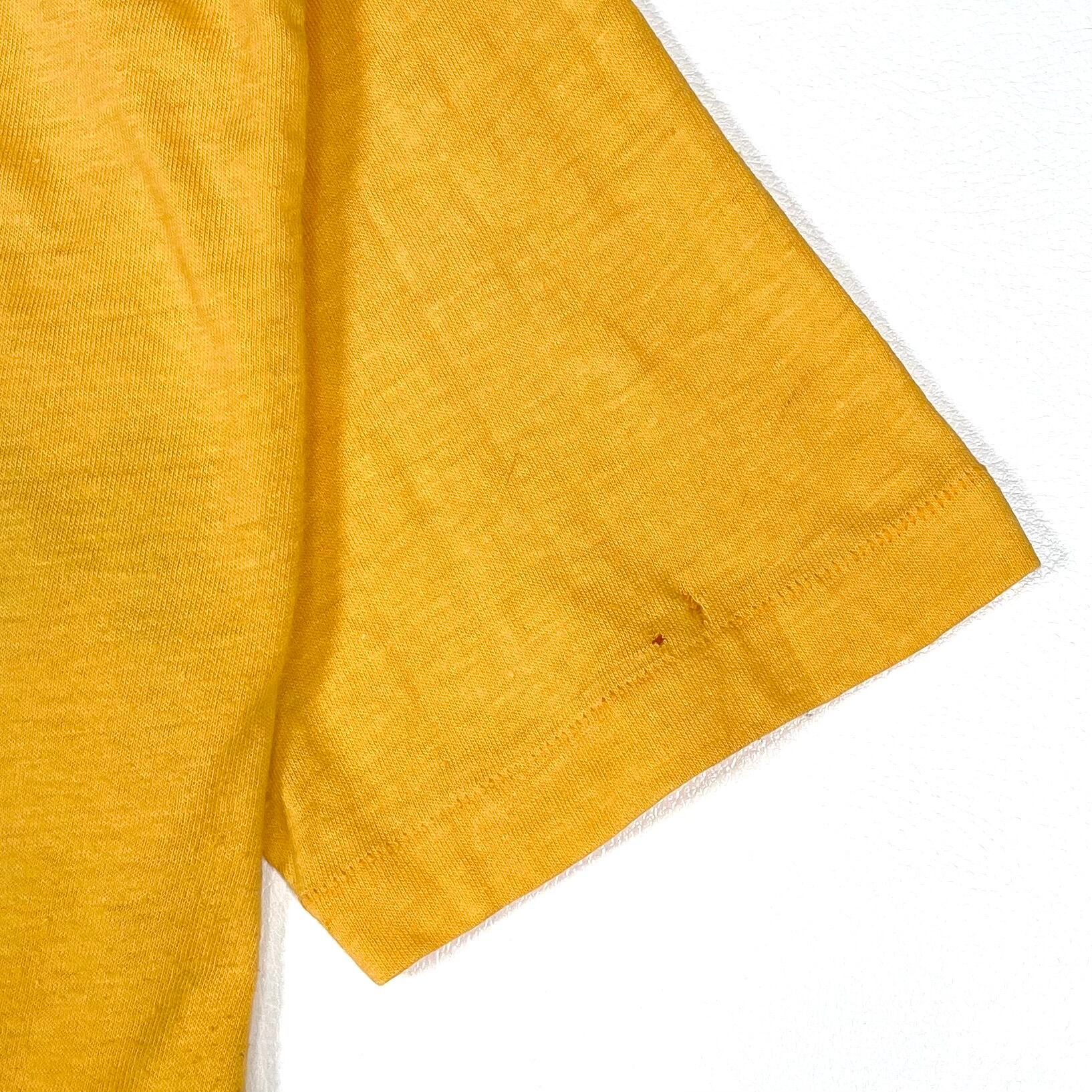 イエローボディにシングルなブラックプリントの70sフロッキープリントTシャツ