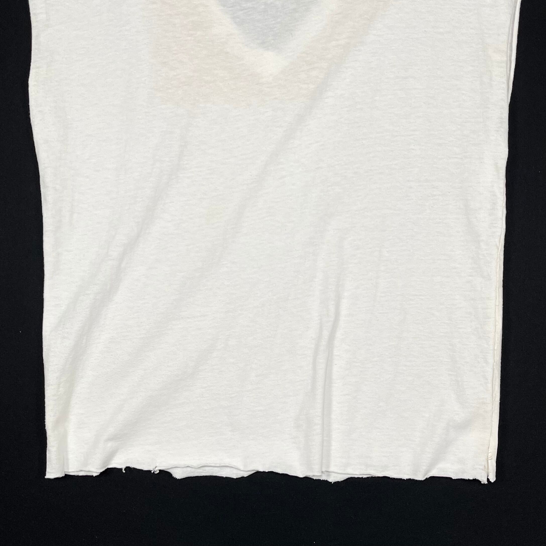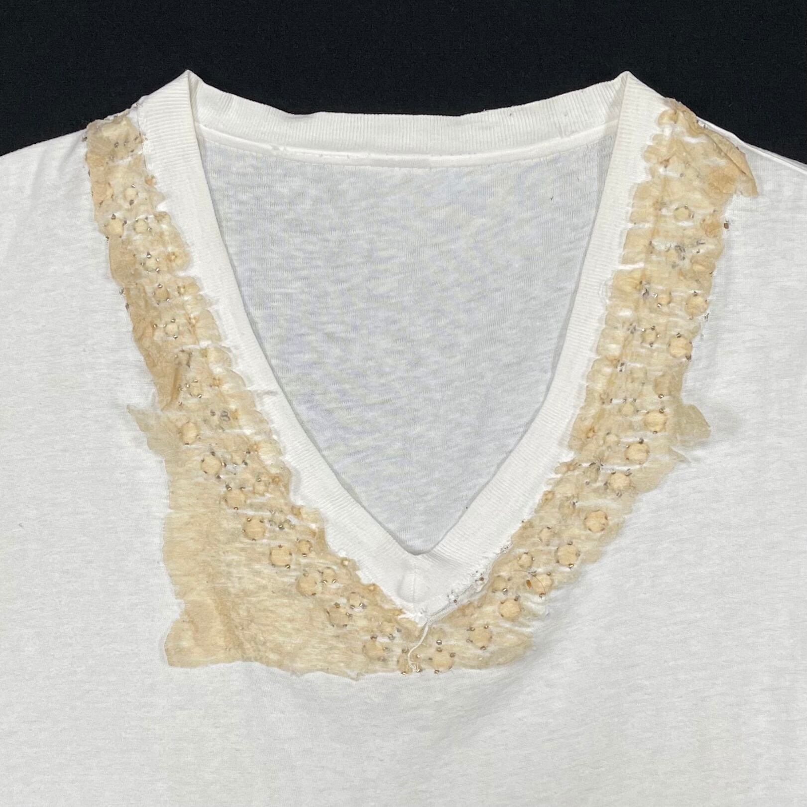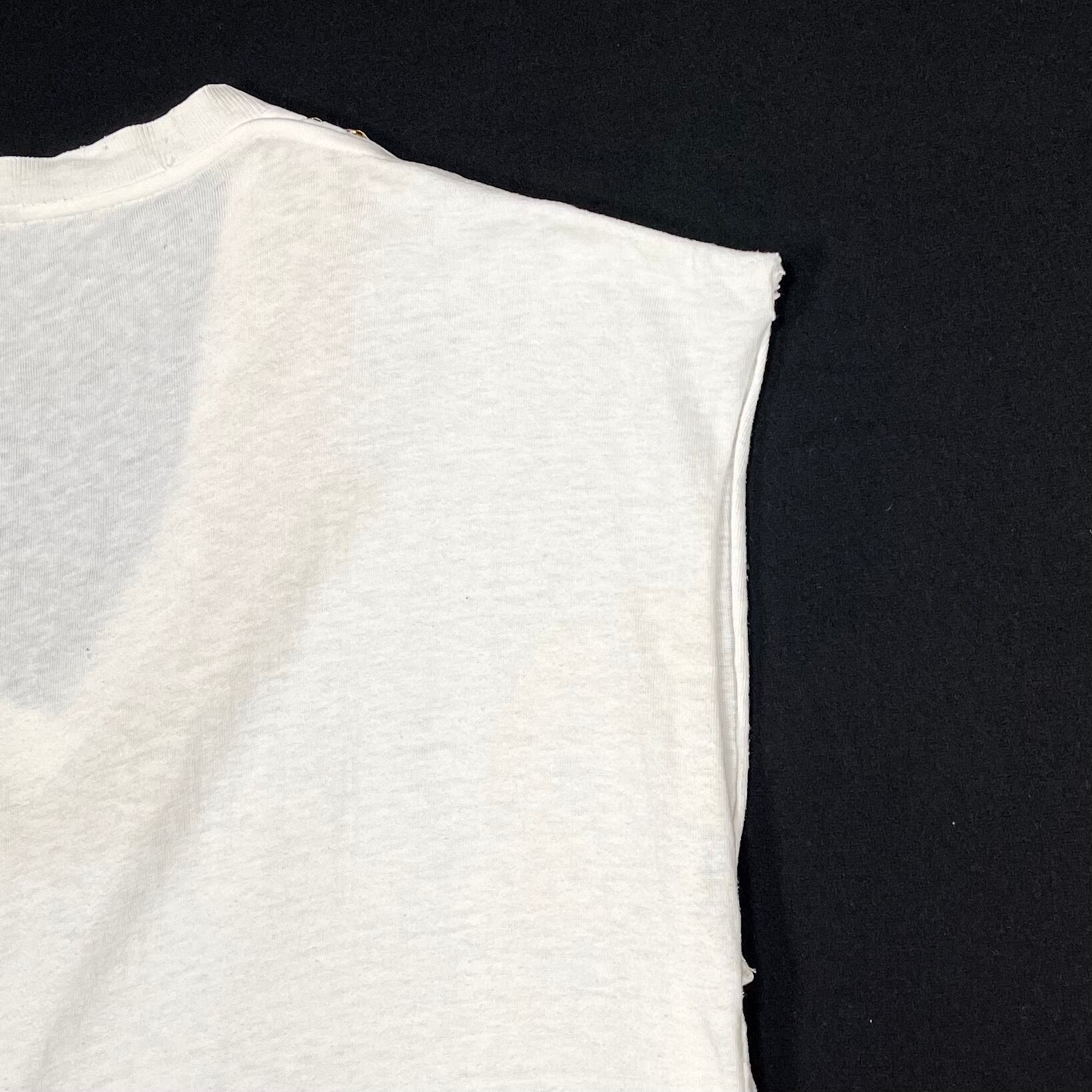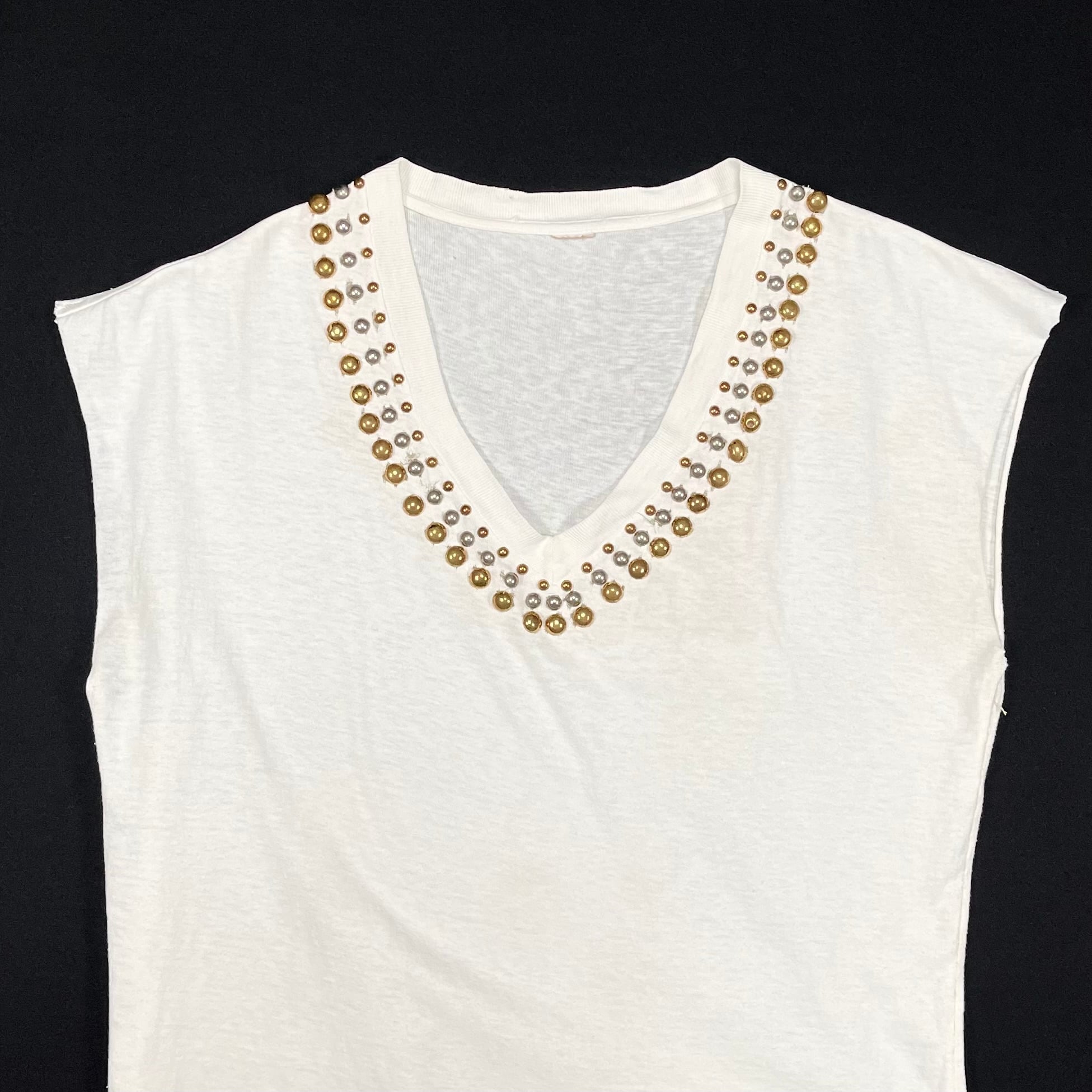 深めのVゾーンにスタッズが打ち込まれ、ダメージ具合と荒々しさが雰囲気あるノースリーブTシャツ