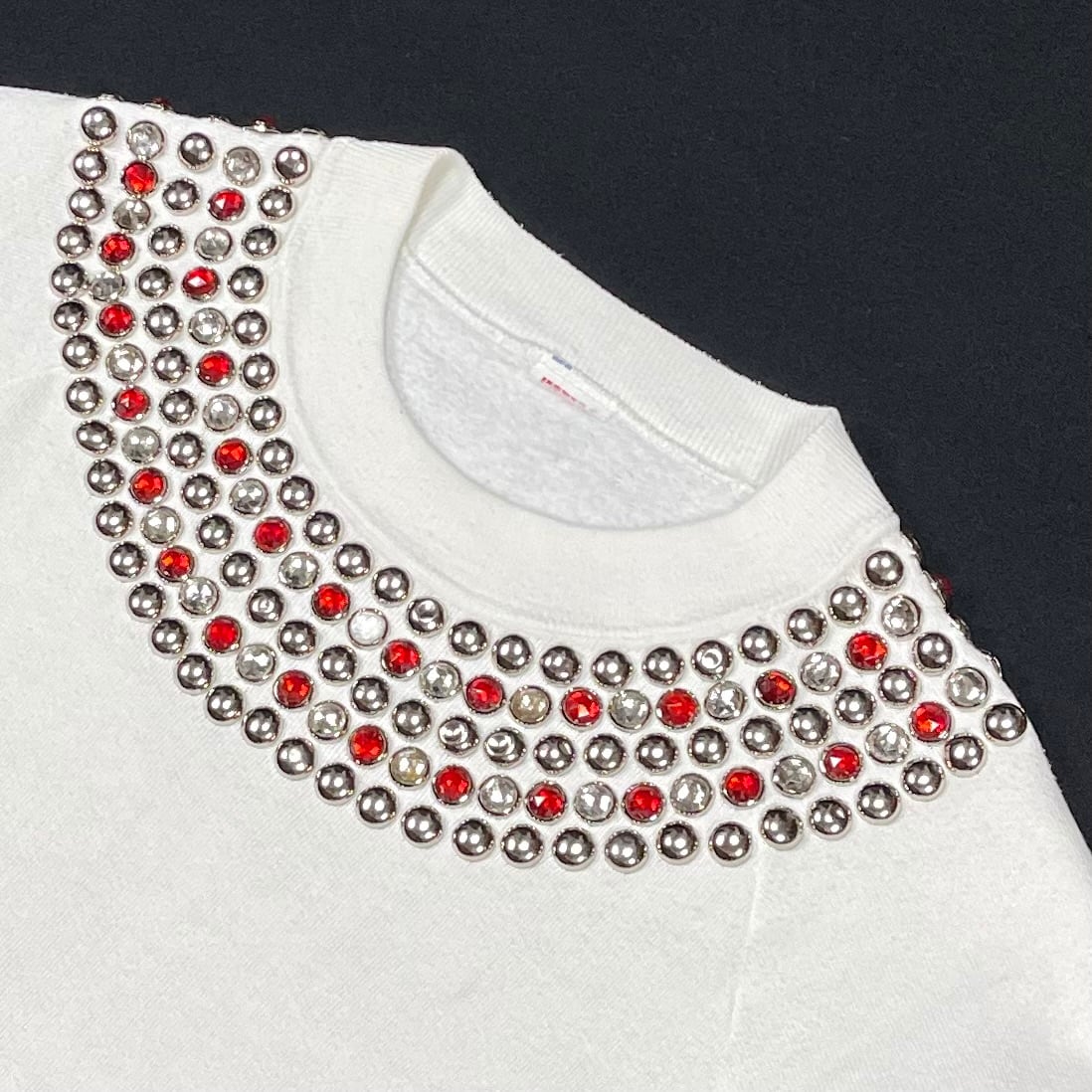 ネックにシルバースタッズと赤とクリアのストーンスタッズ