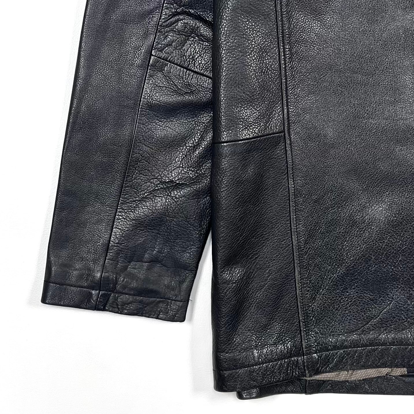 飽きがこないシンプルなデザインで、レザーのスレやシボ感が風合いあるルーズジャケット