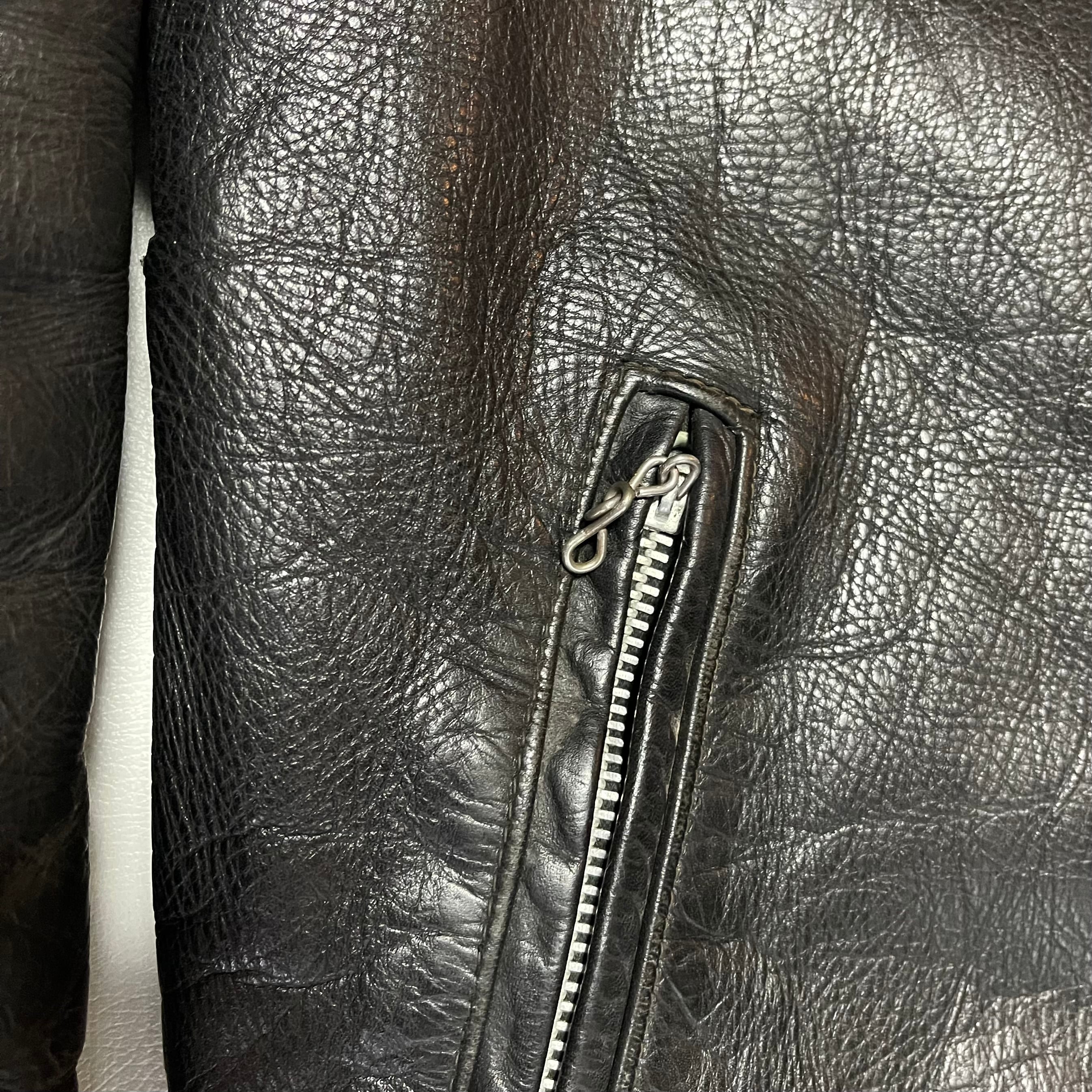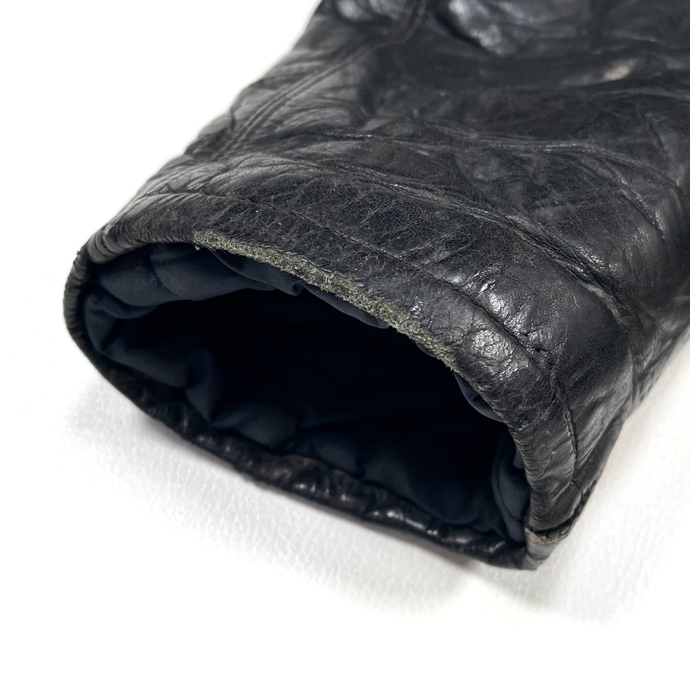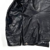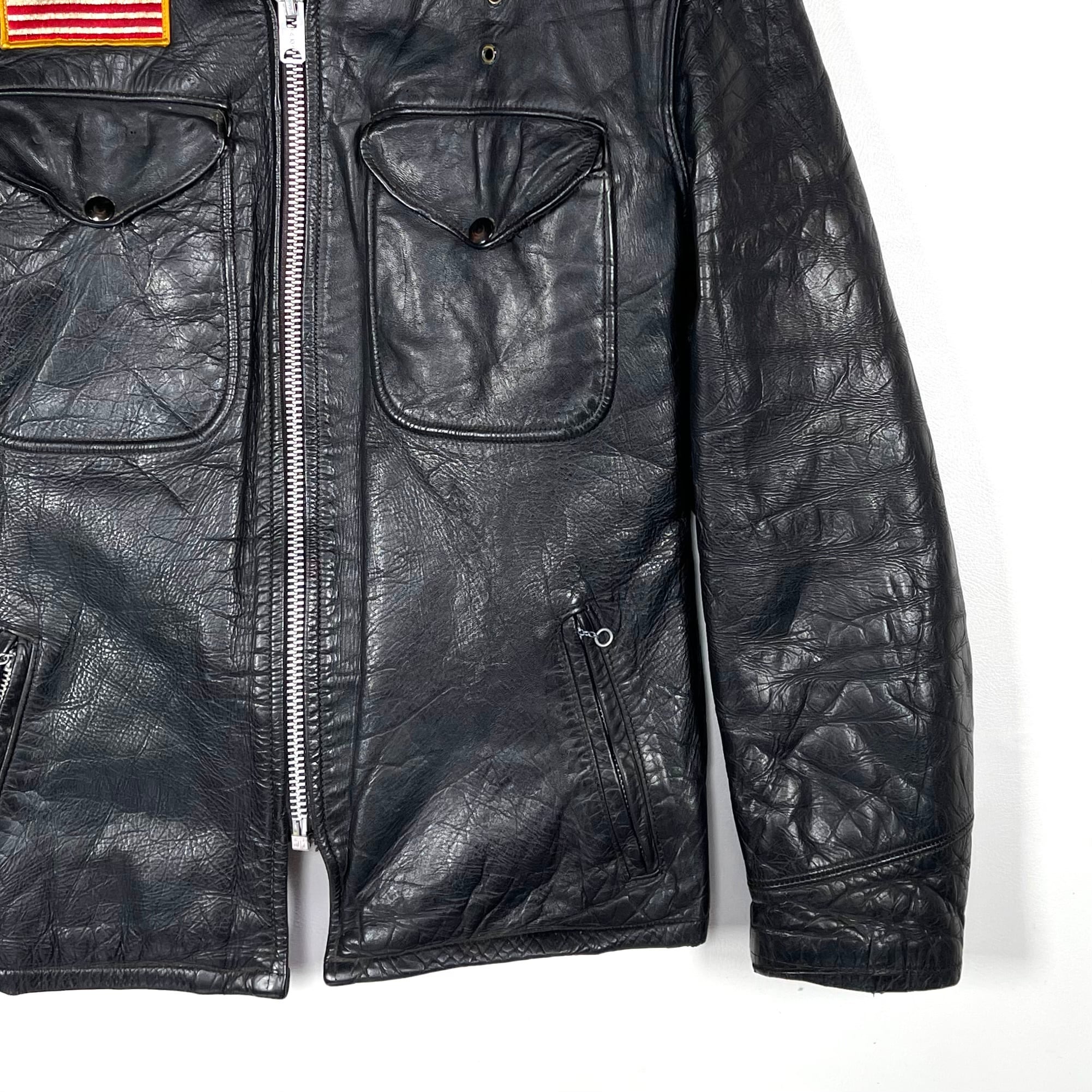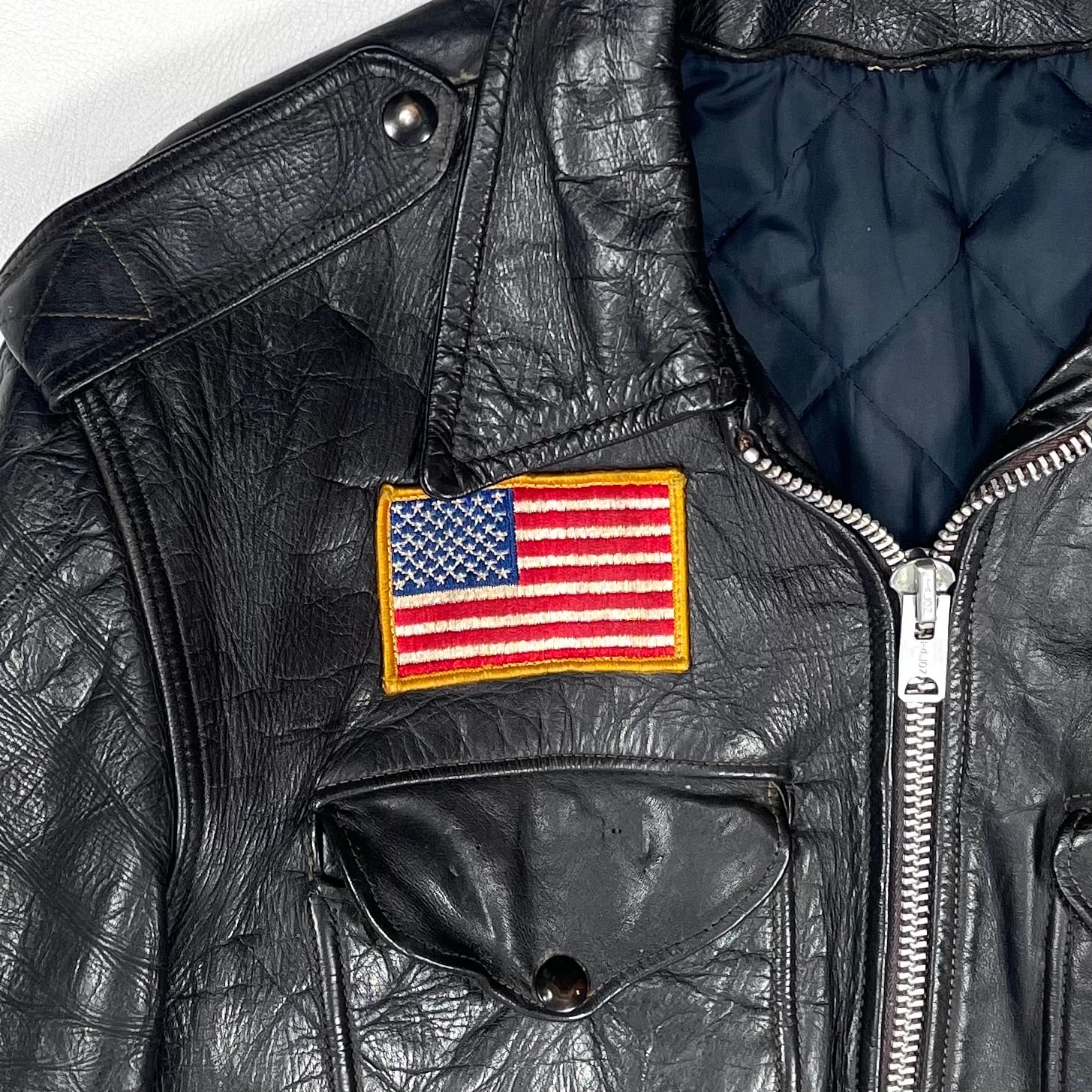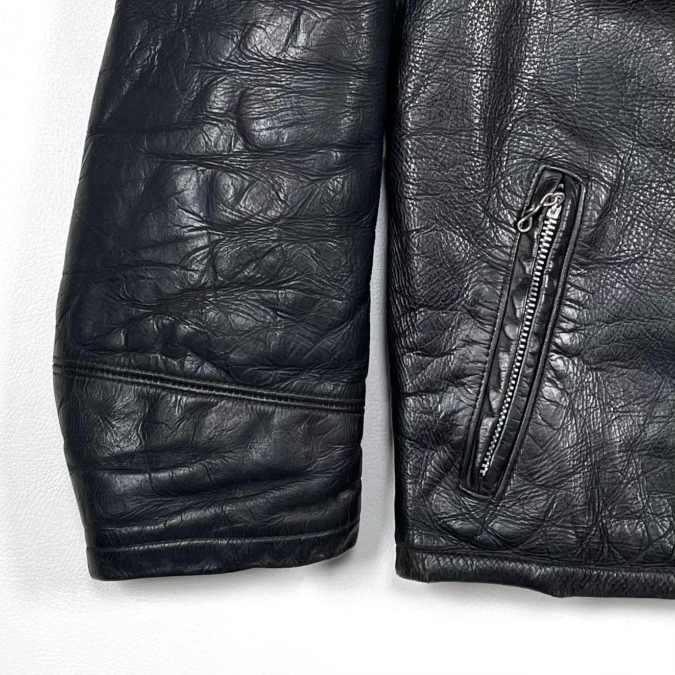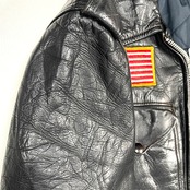 着用によるレザーのシワやスレ、左右にワッペンを外した跡、袖口のスレやレザーの割れがございます。