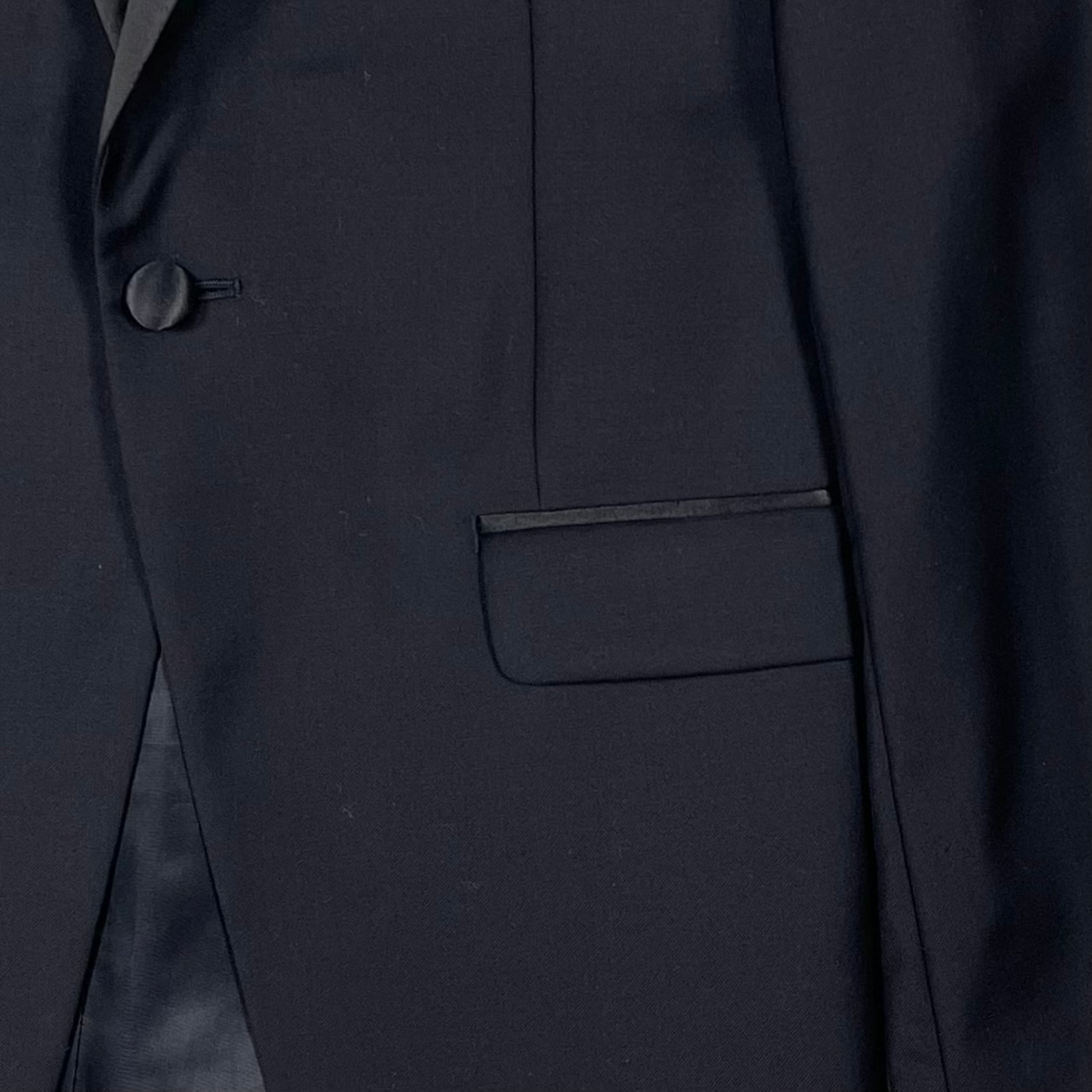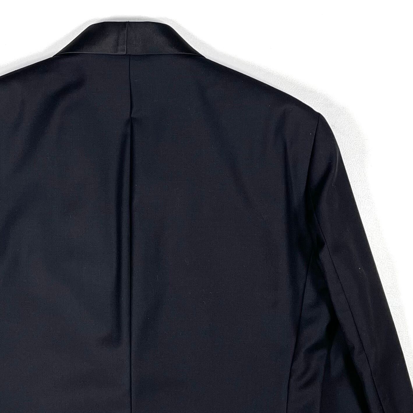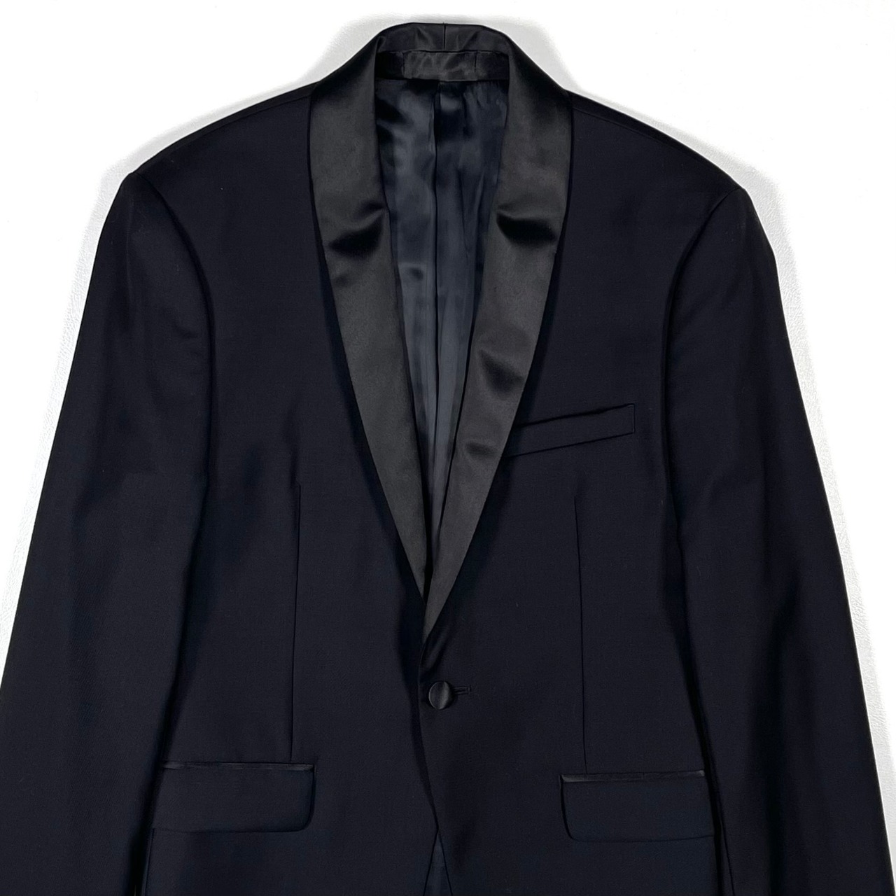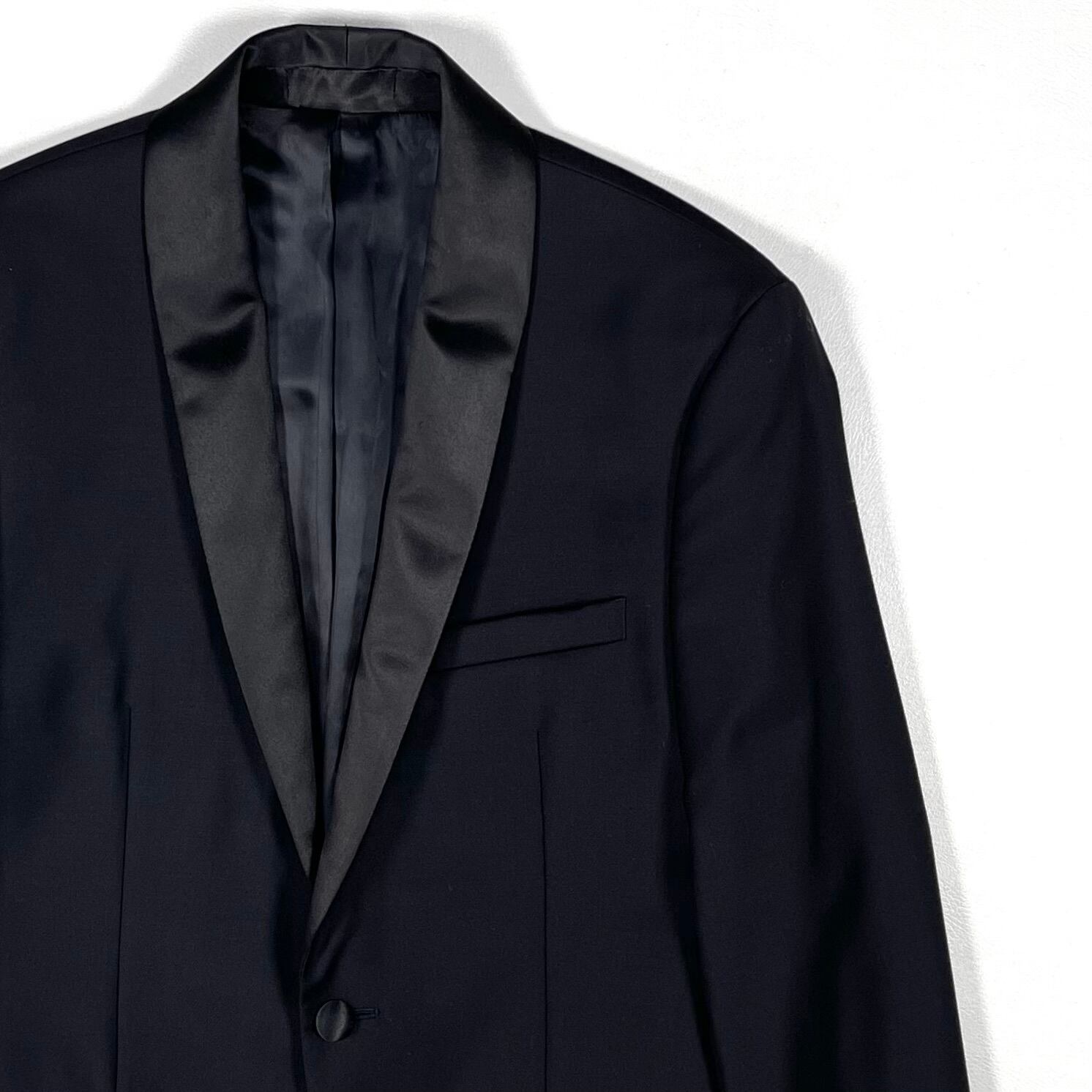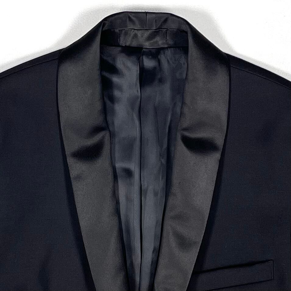 シャープなショールカラーのサテンラペル