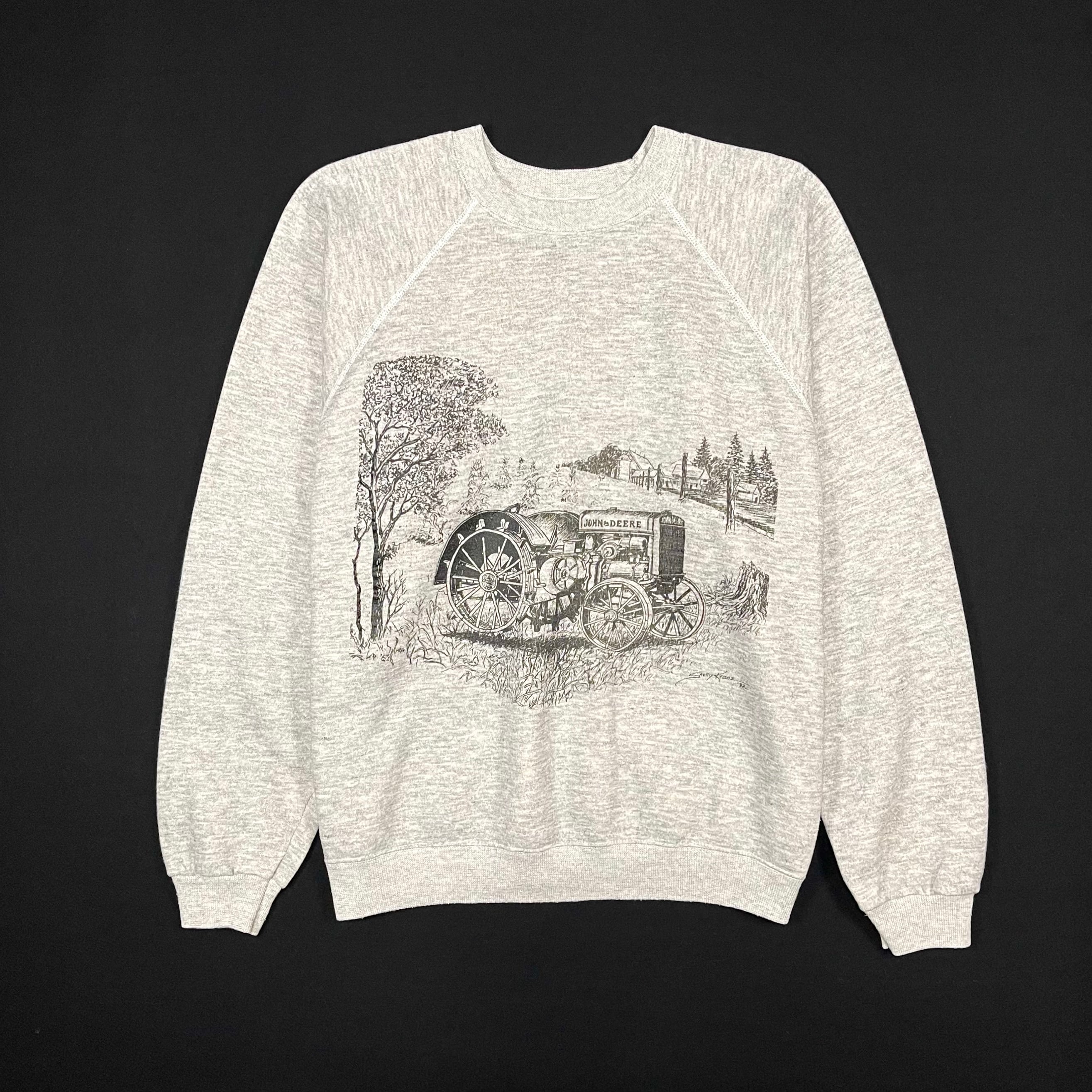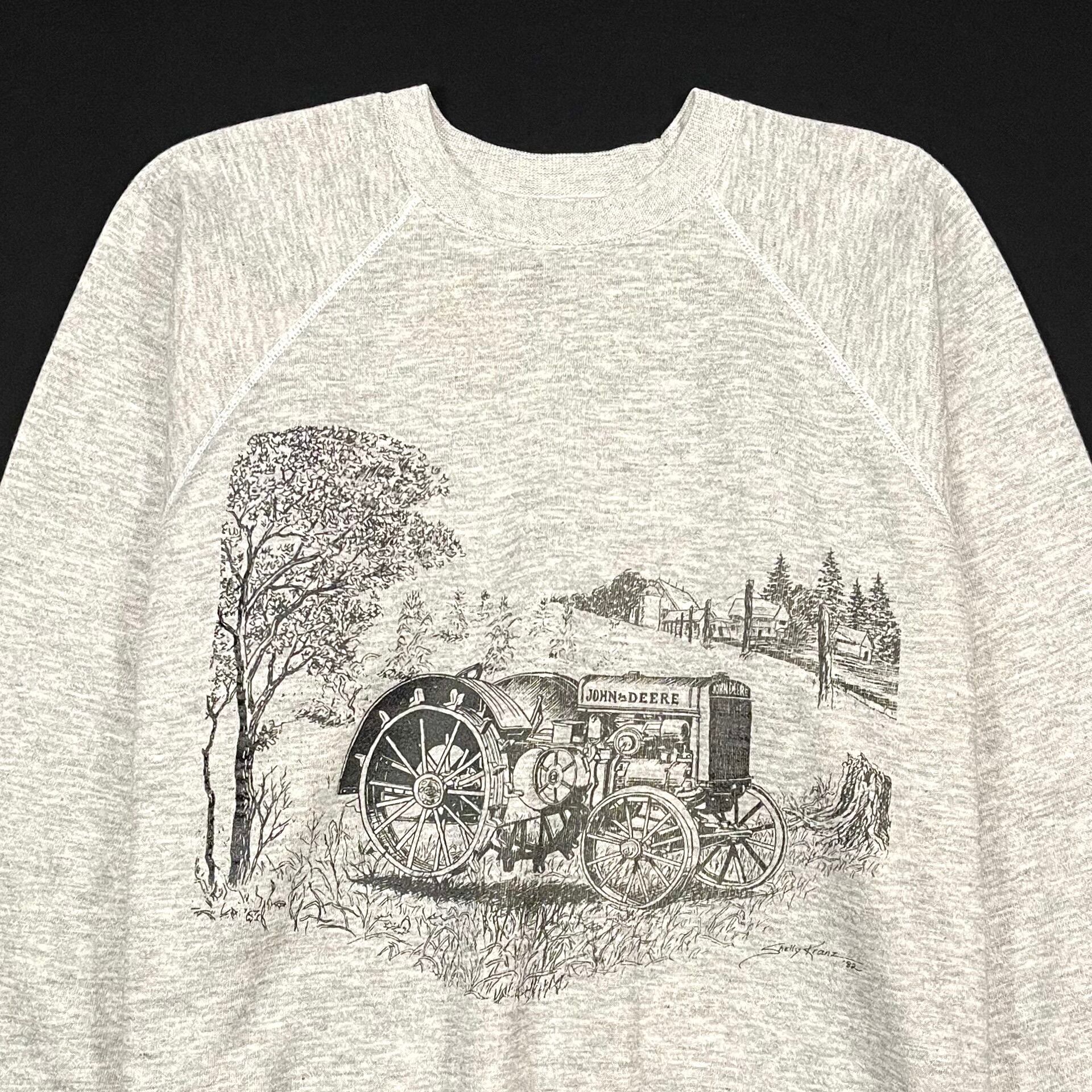 フロントにJOHN DEEREのヴィンテージトラクターのプリント