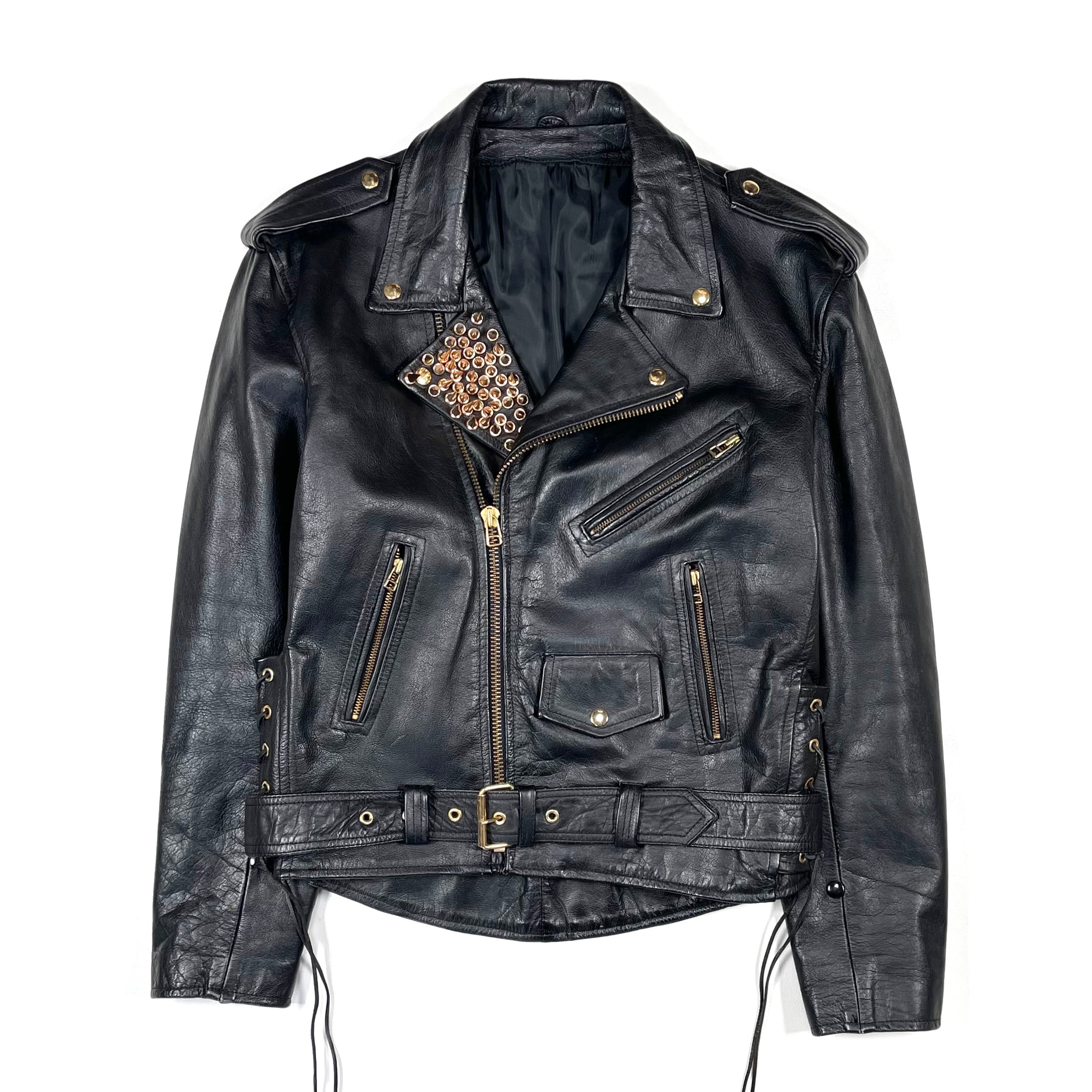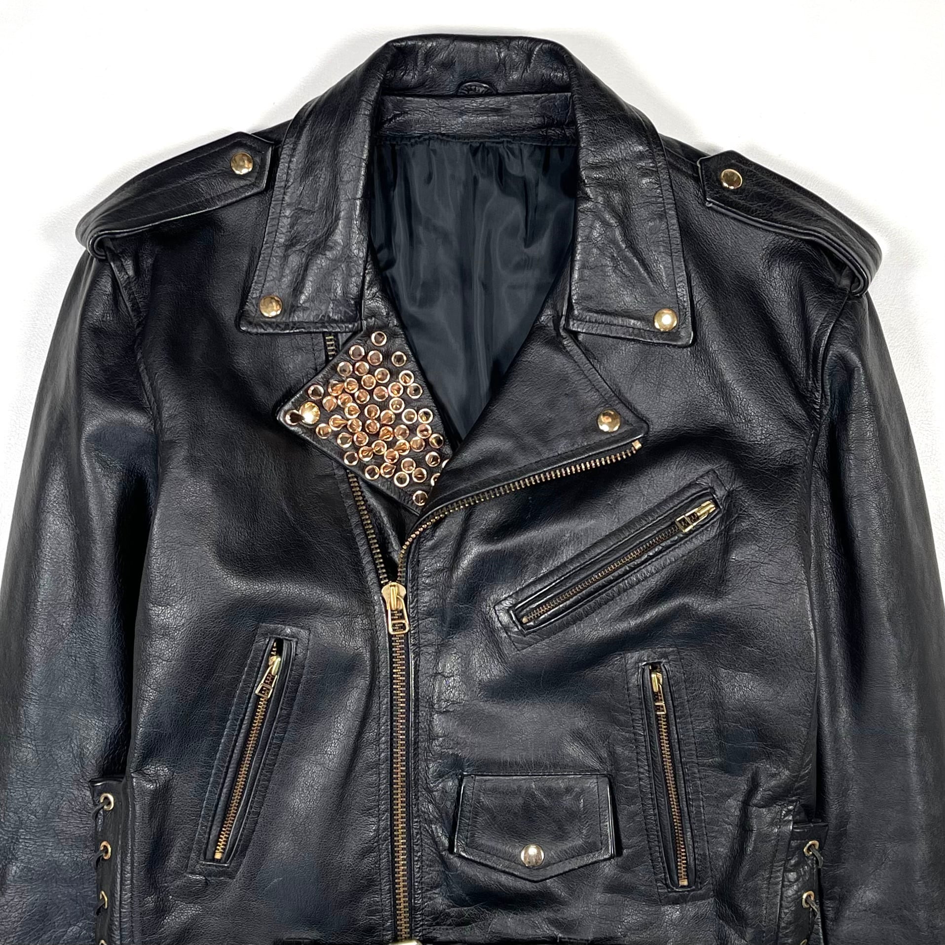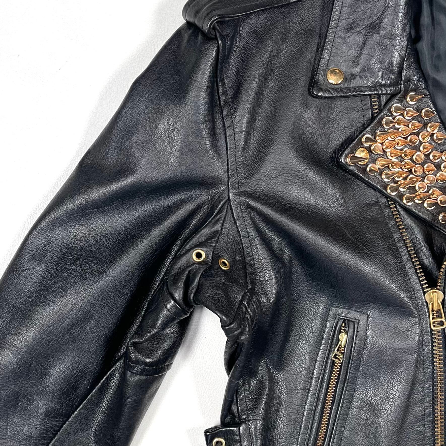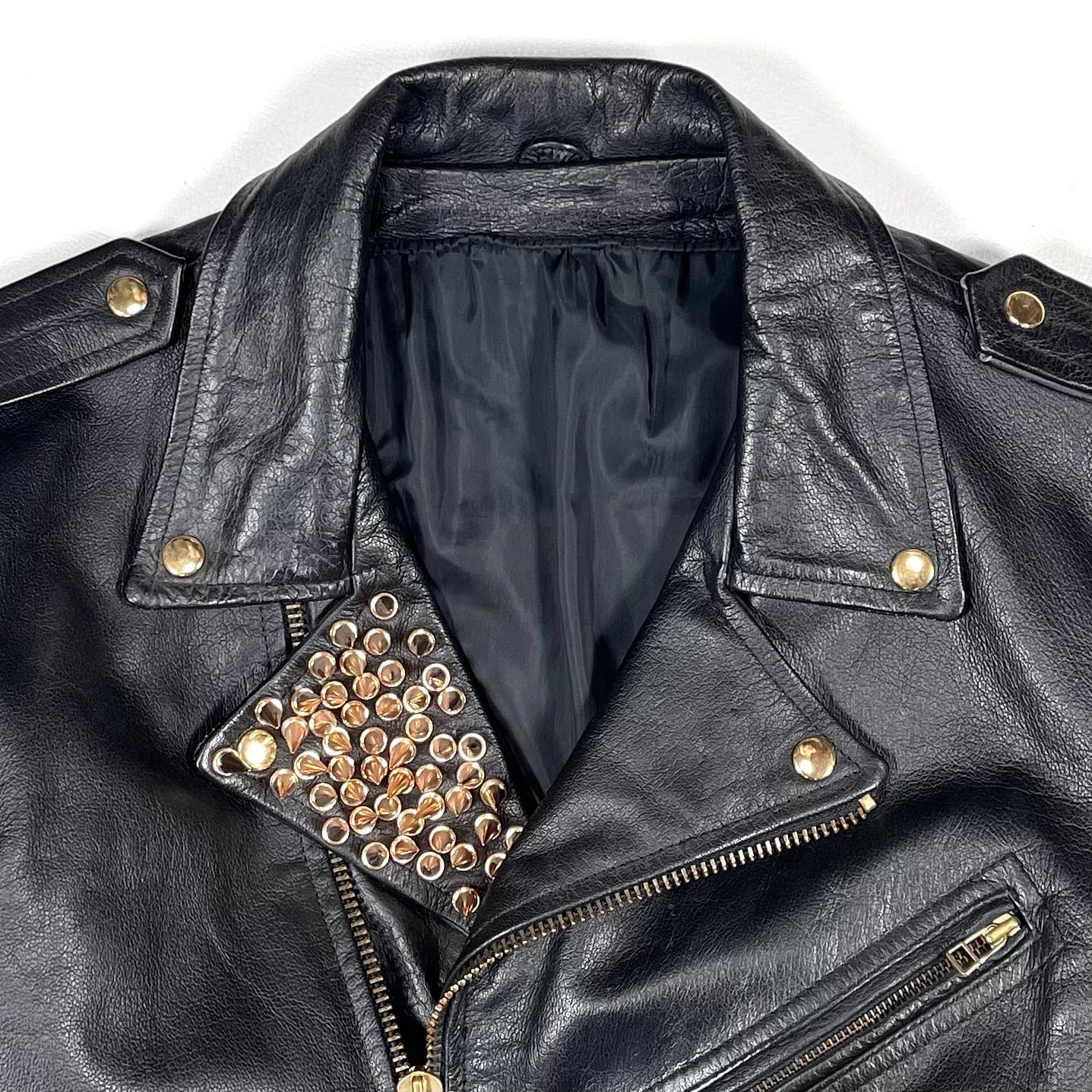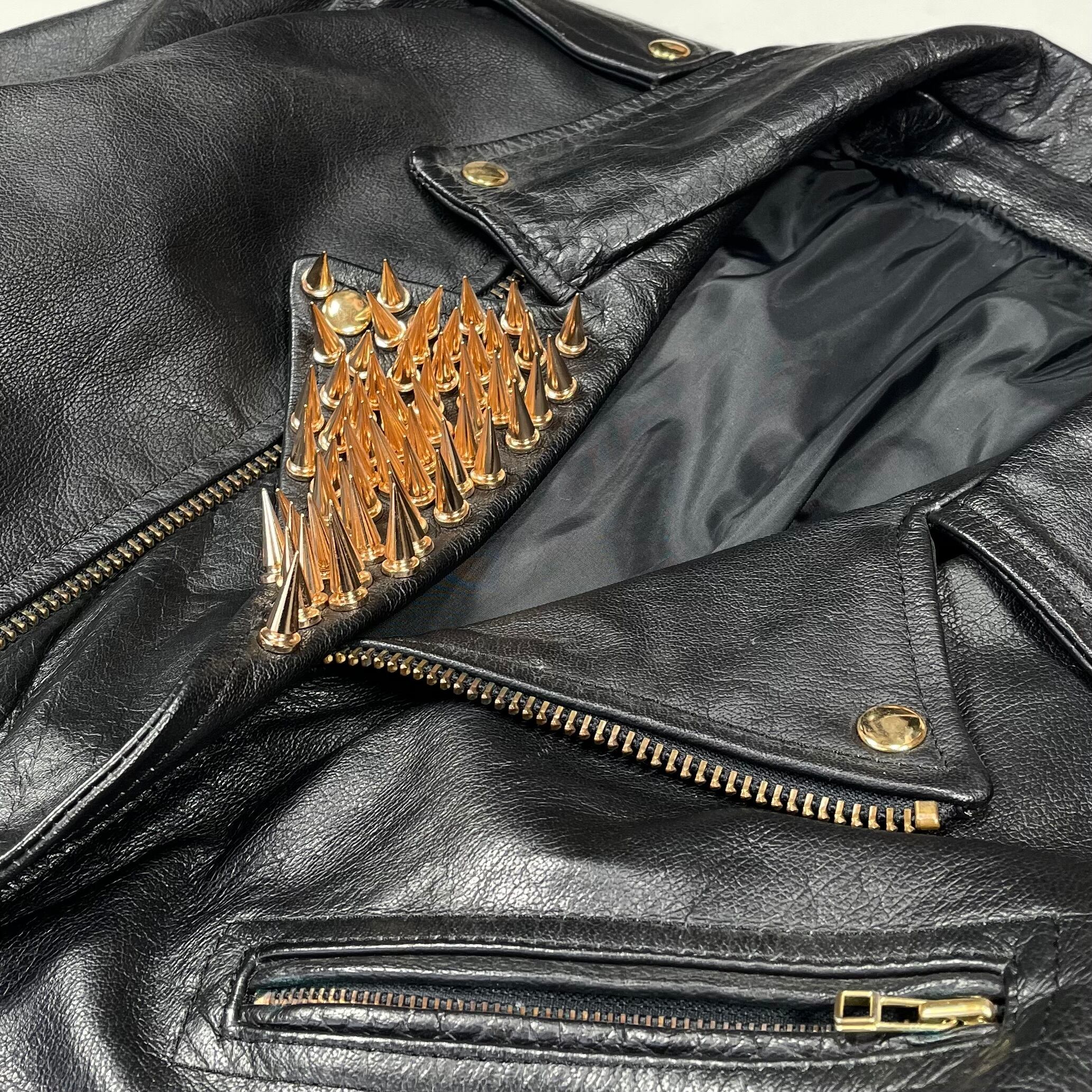 ブラックレザーにゴールドのスタッズが輝く、ハードなバイカージャケット