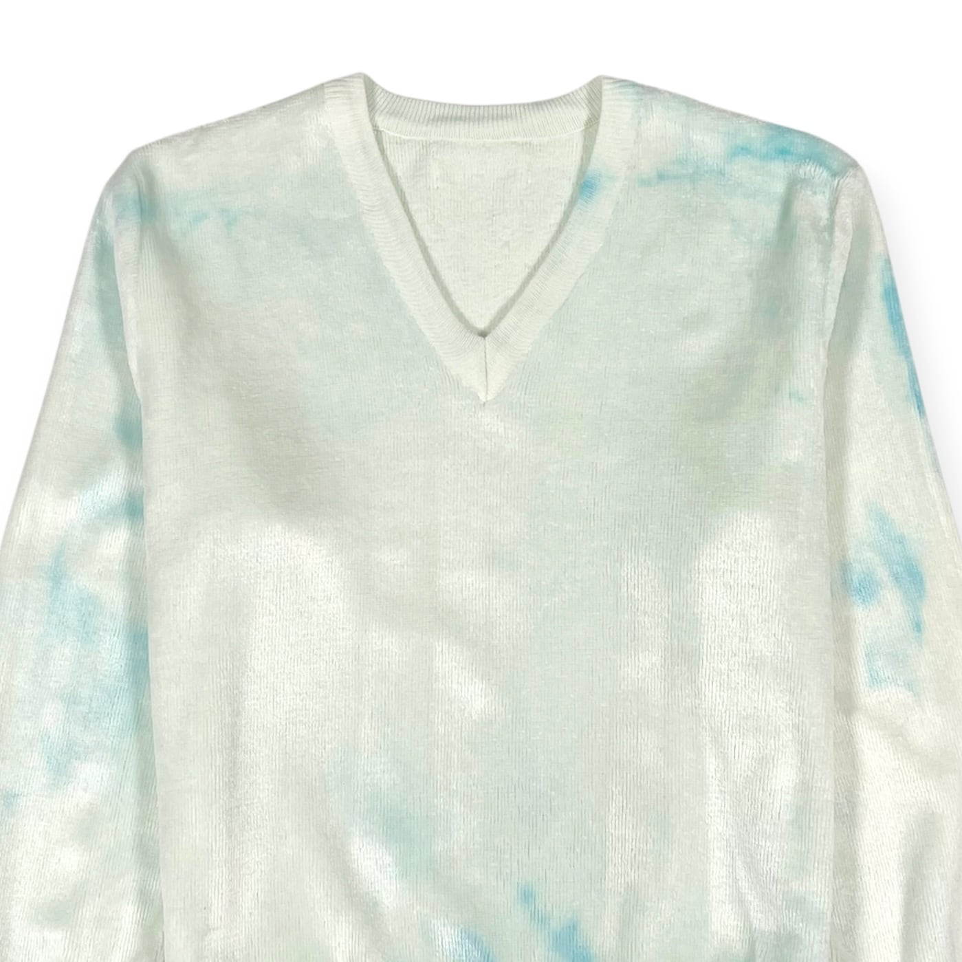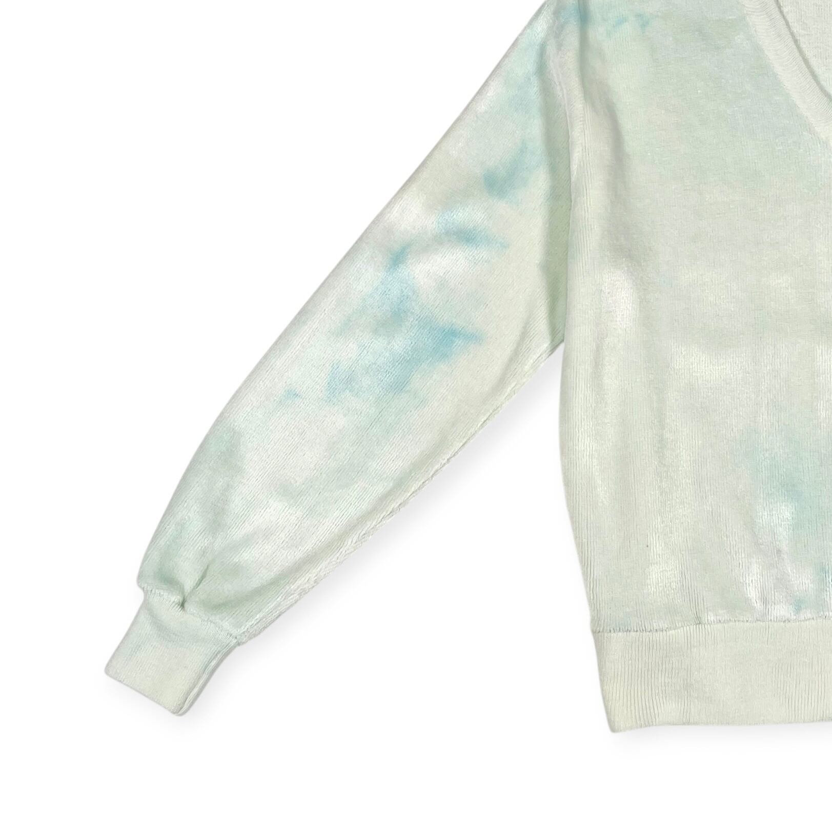 ブリーチされた様な色斑で、綺麗なブルーが部分的に残った70s〜のベロアVネックスウェット