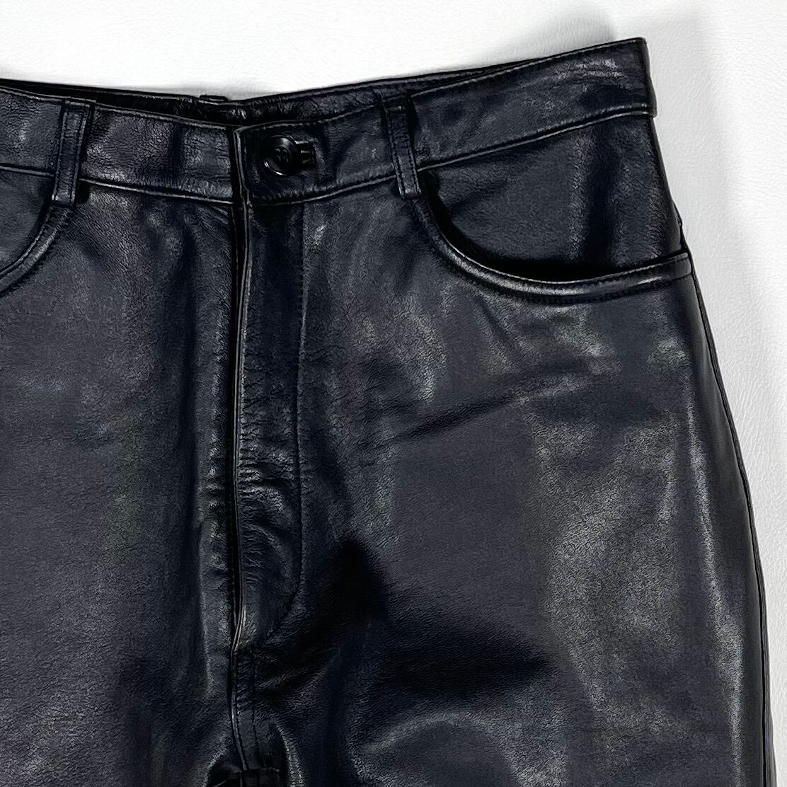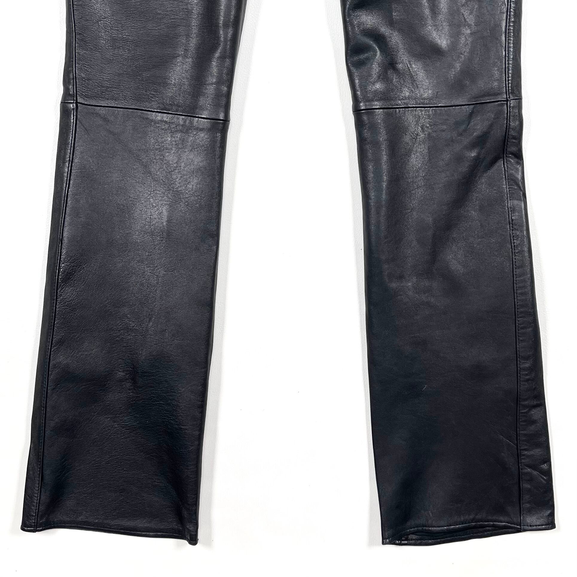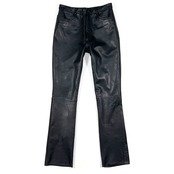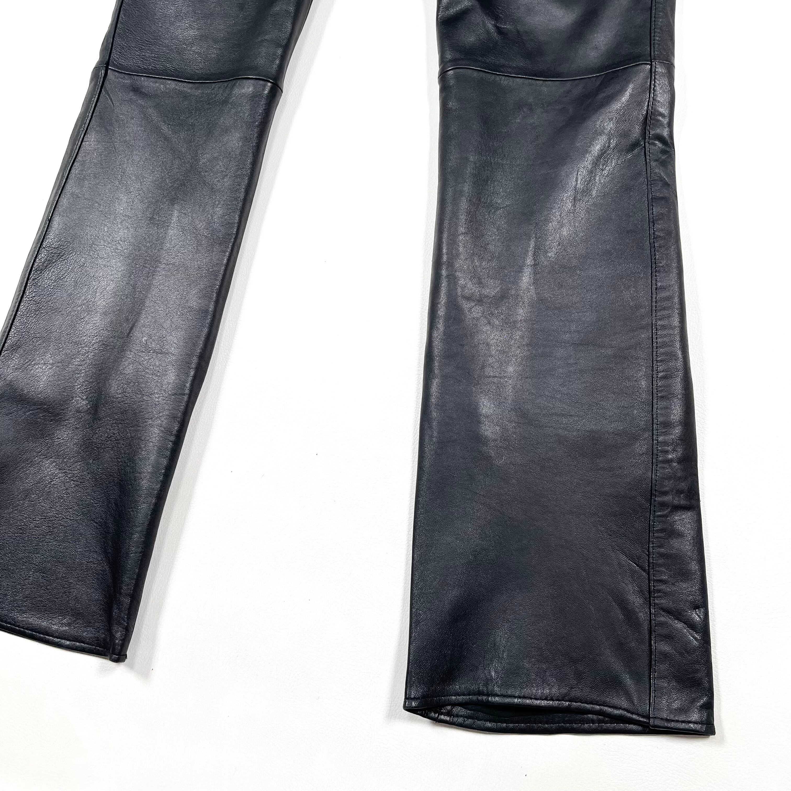 Flared jeans made from soft lamb leather. The jeans have a sleek flared silhouette, with a slim fit through the knees that slightly flares out toward the hem. The design is simple, with no back pockets.