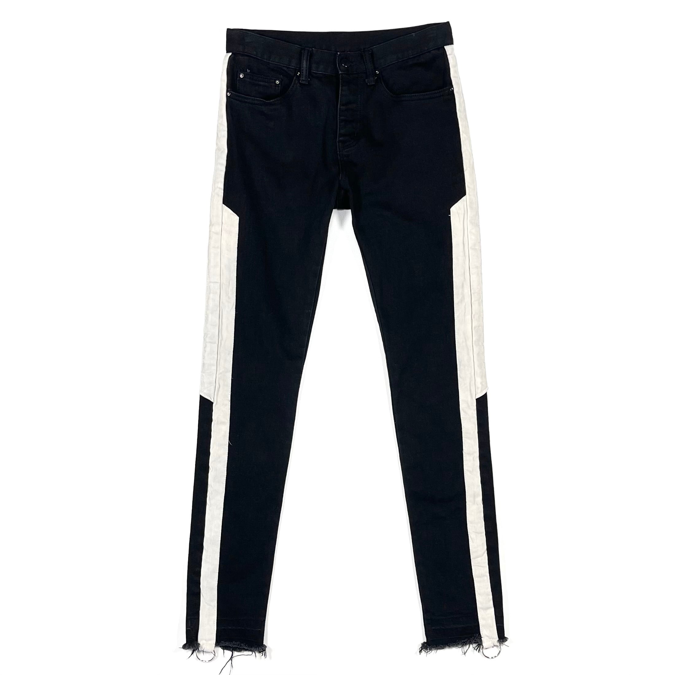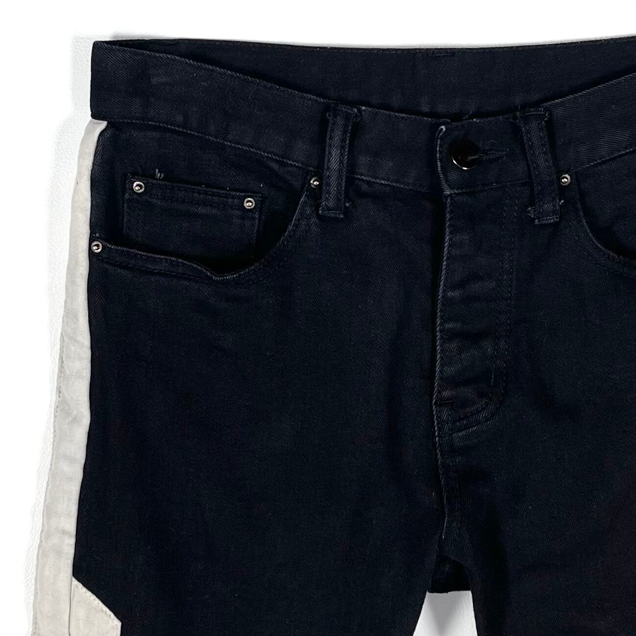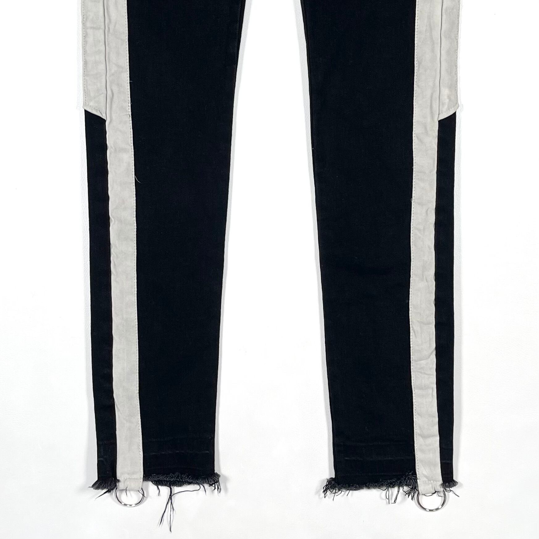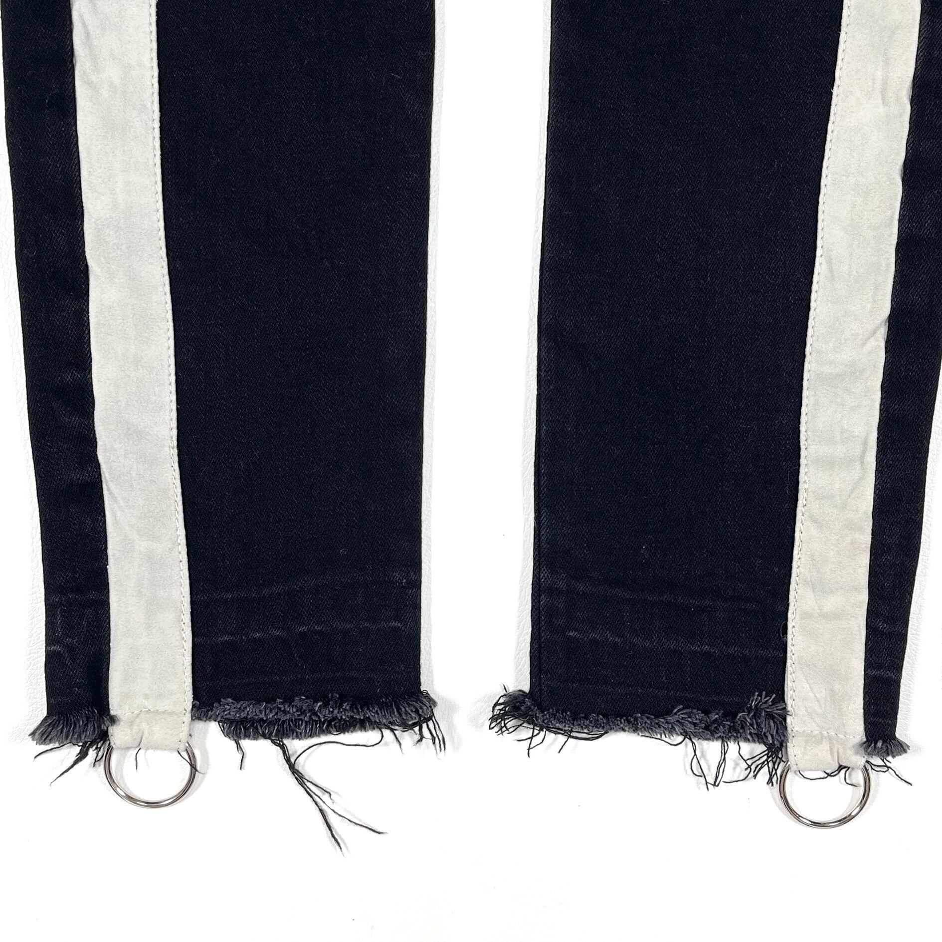 Skinny jeans with a side panel design featuring faux nubuck. The jeans are made of stretchy black denim. The hems have an unfinished look, and there is a round ring detail on the sides.