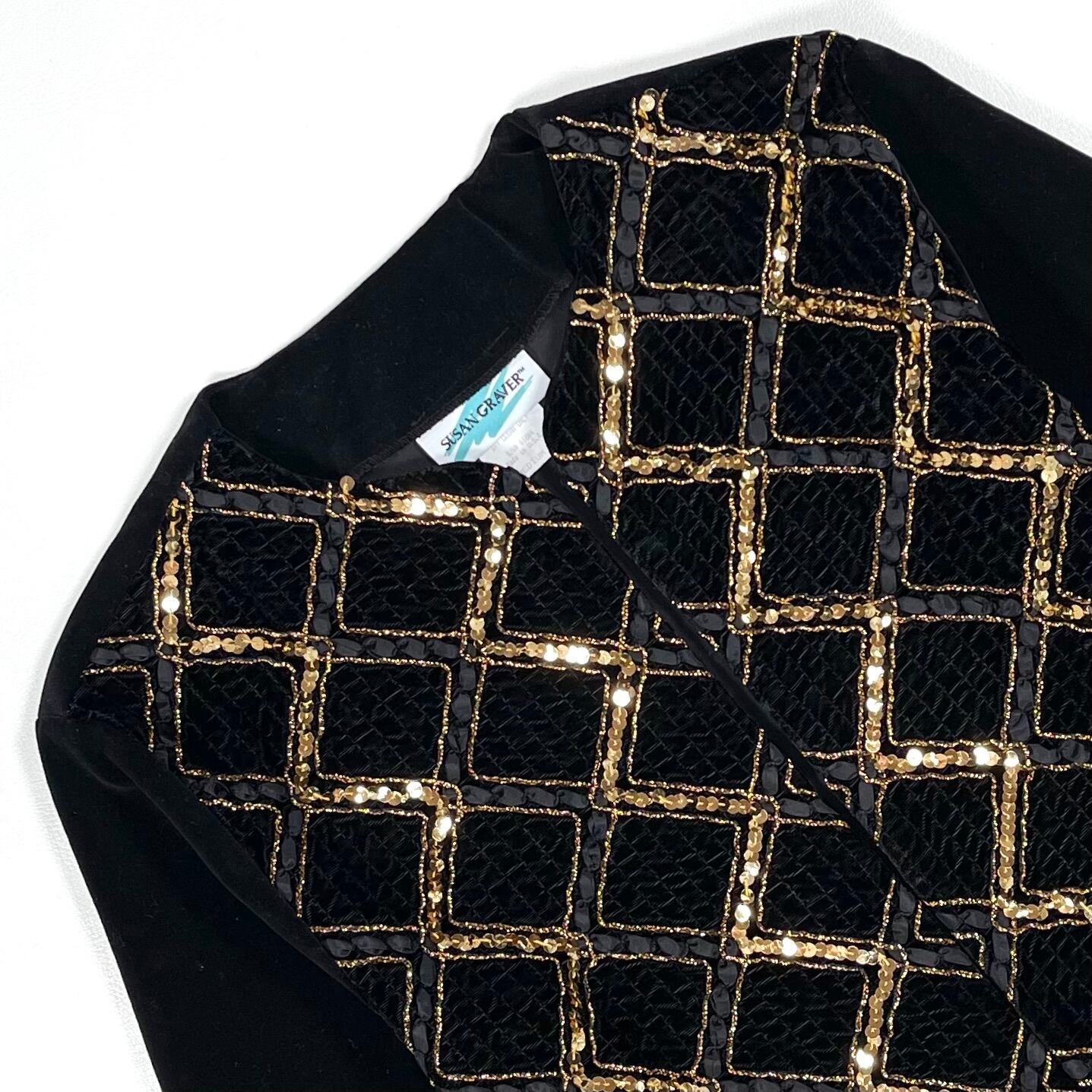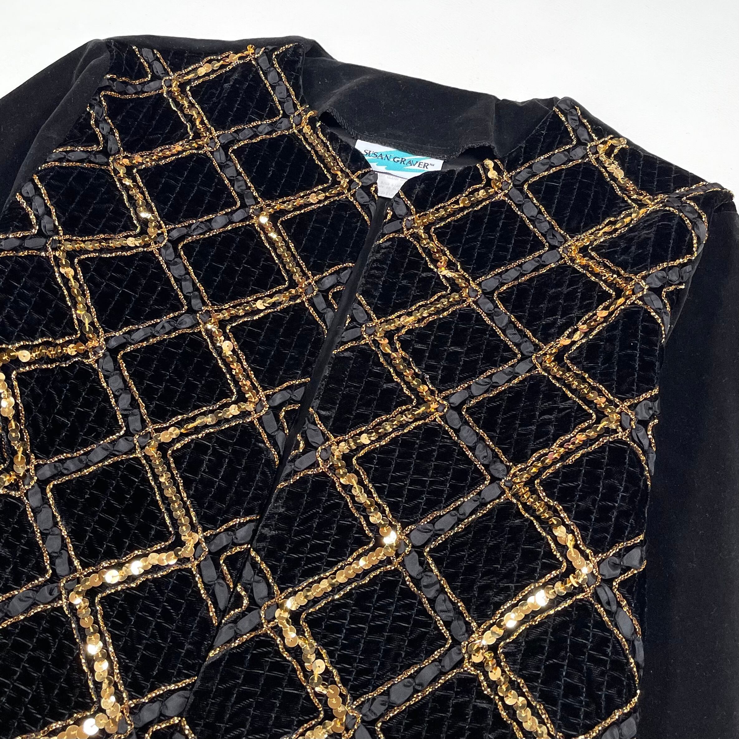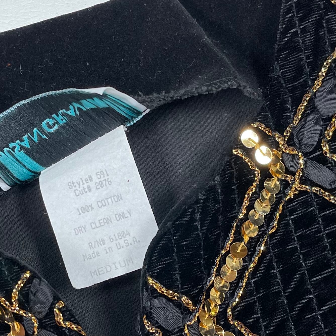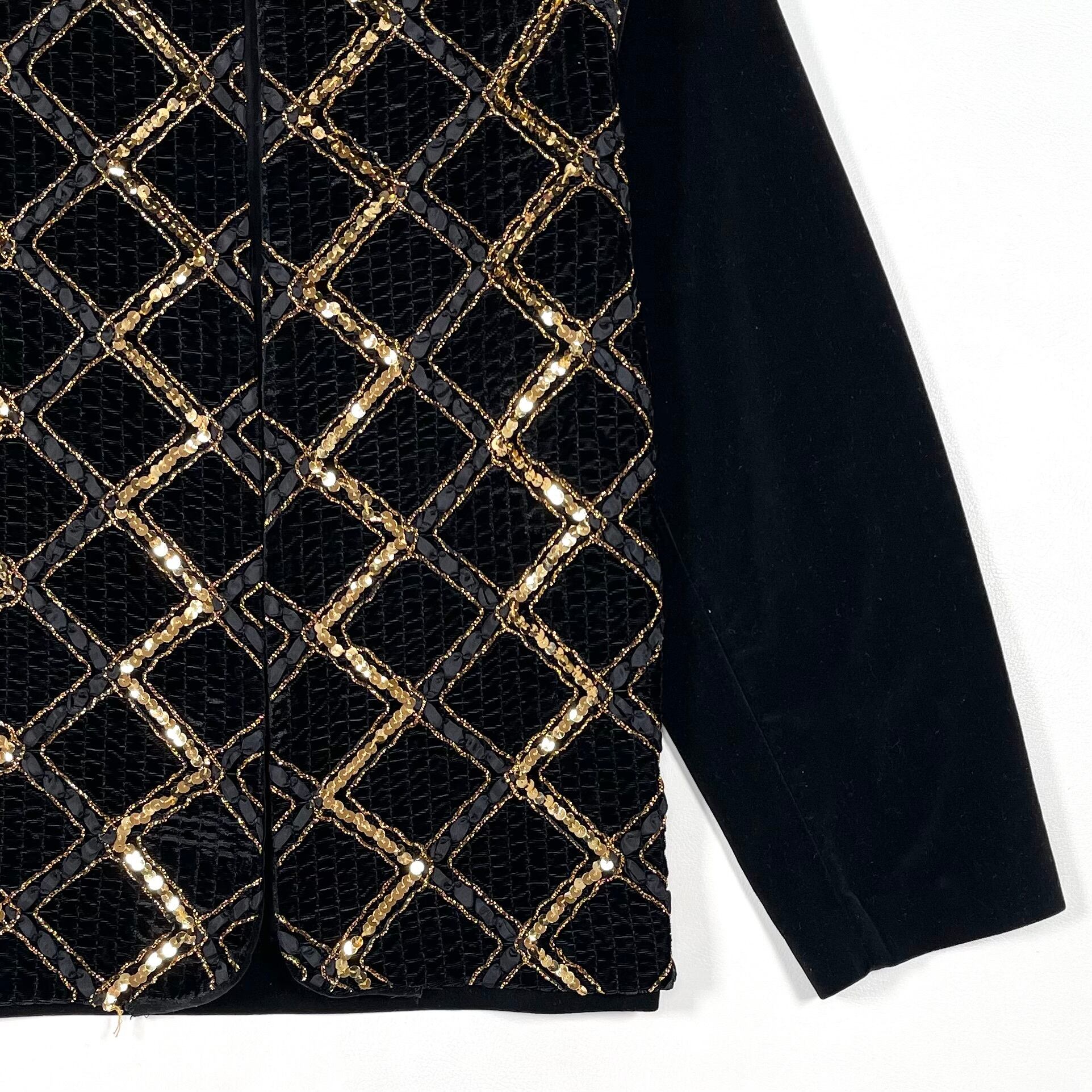 This is a no-collar cardigan jacket made from cotton velveteen material. It features a distinctive front design with sequin embroidery and braided tape. The front is open, with no hooks or zippers, and the jacket is unlined.