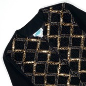 フロントにスパンコール刺繍とテープが編み込まれたデザインが特徴。