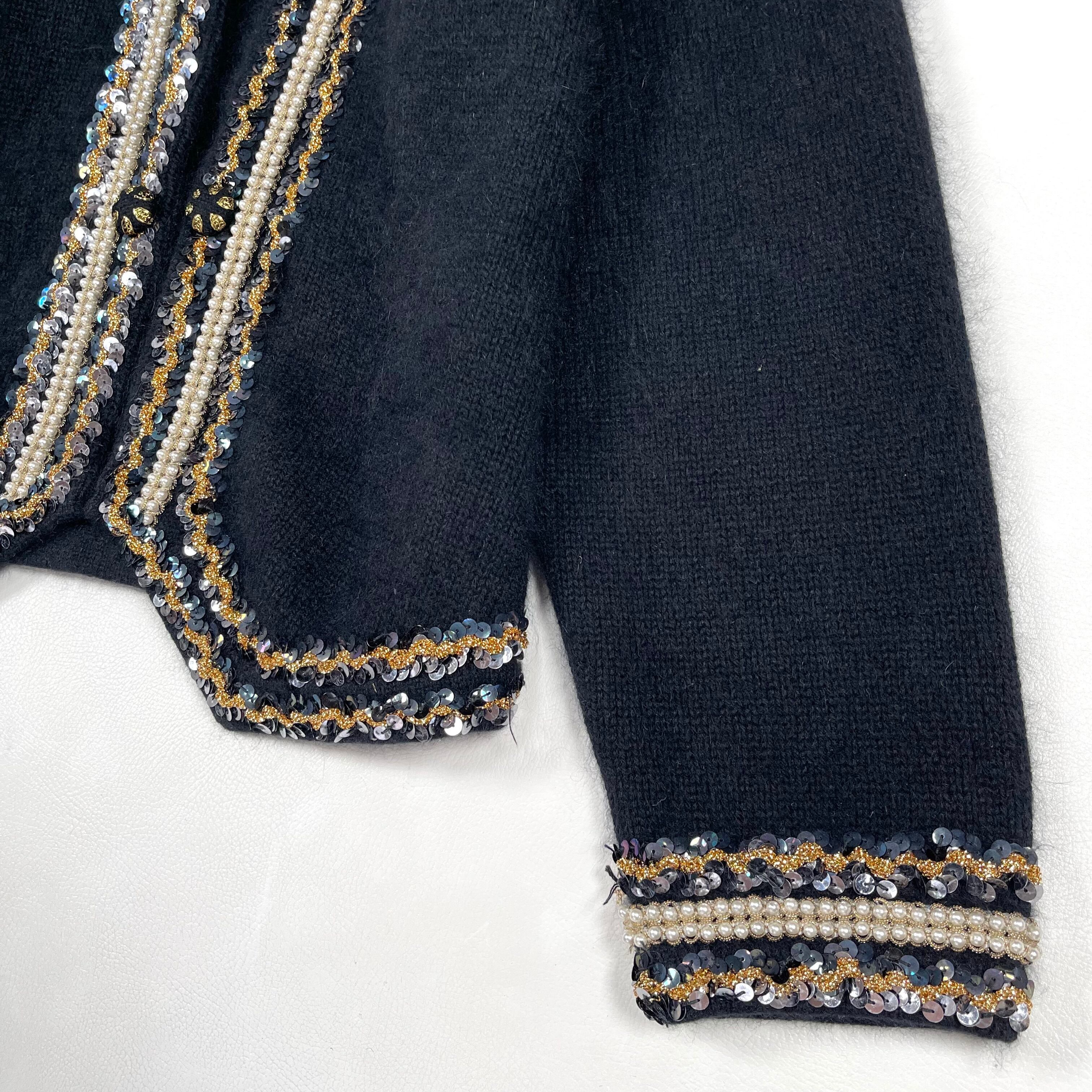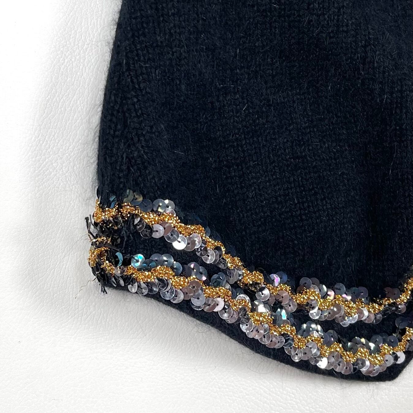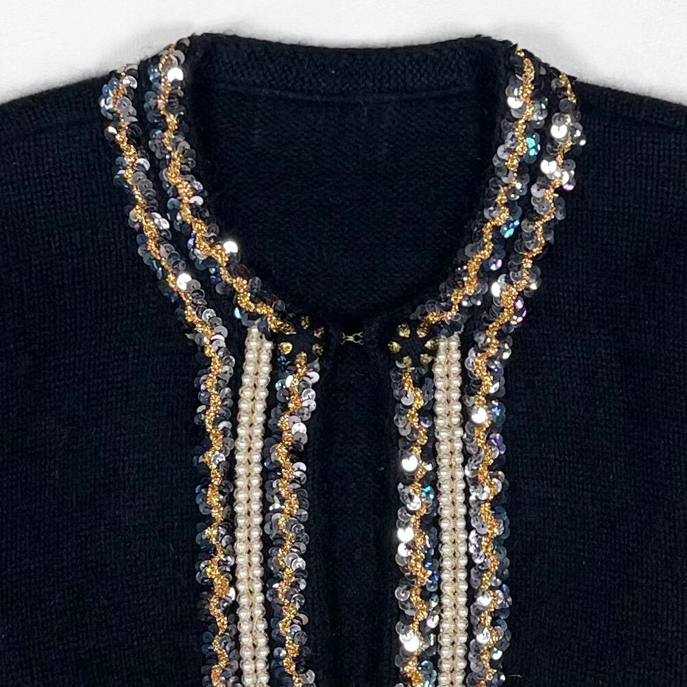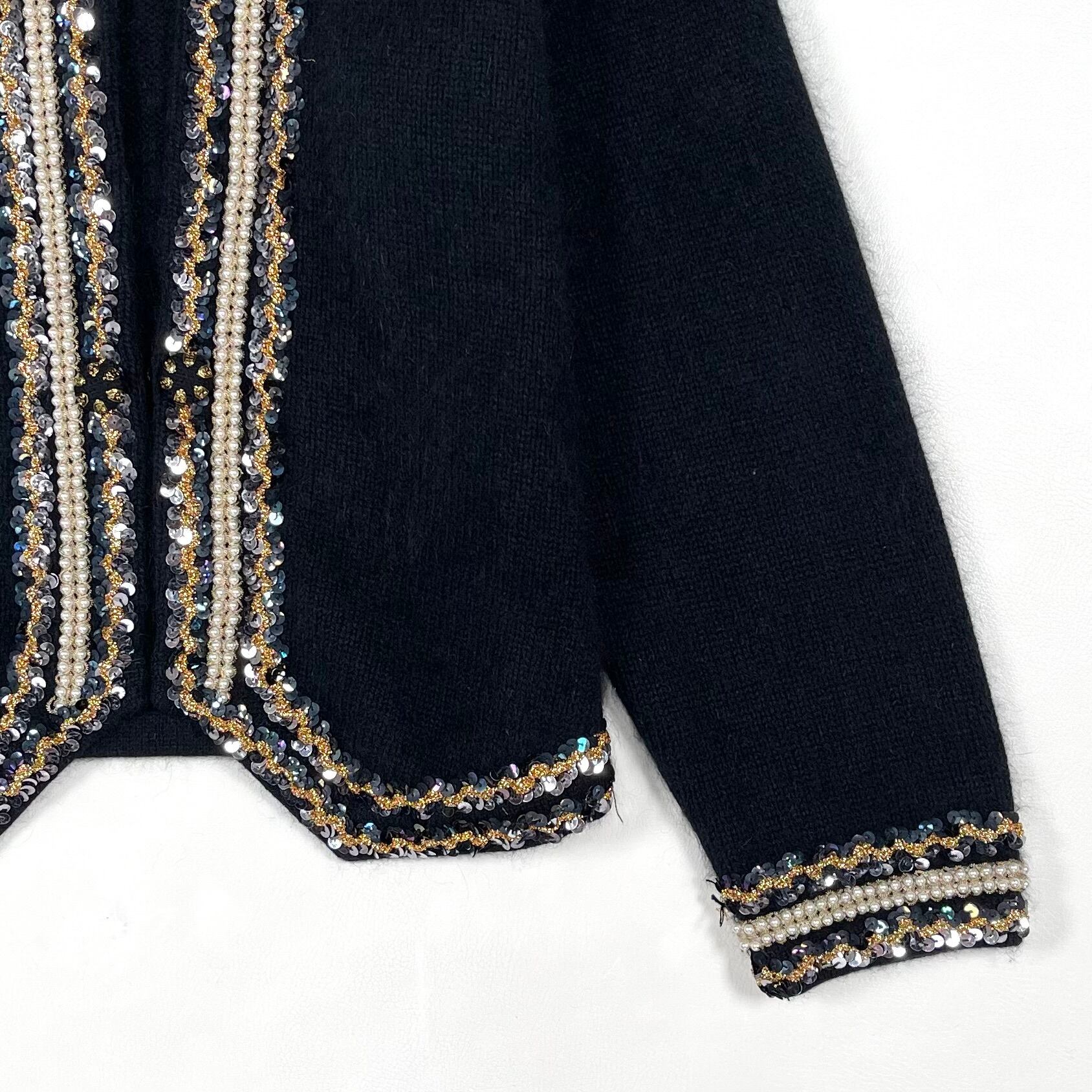 This is a cardigan with sequin embroidery. It features a no-collar design with a silhouette similar to a spencer jacket. While the material composition label is missing, it is likely made of wool, angora, and nylon. The cardigan has the characteristic fluffiness of angora. There are two hooks on the front, and there is some minor fraying in the sequin embroidery.