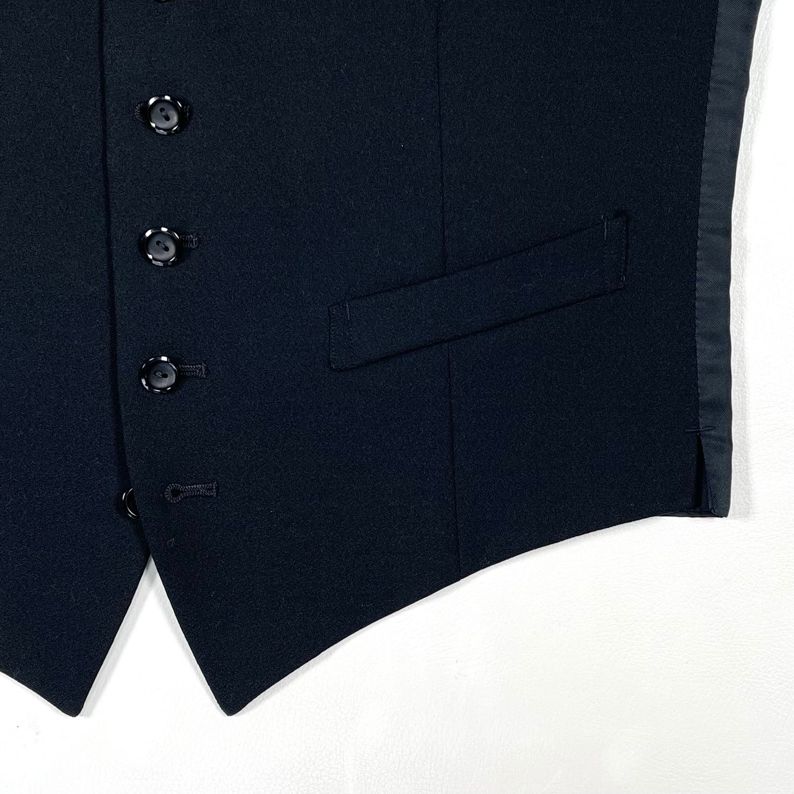 This is a classic black vest featuring a 6-button front and four pockets. It has a tight silhouette.