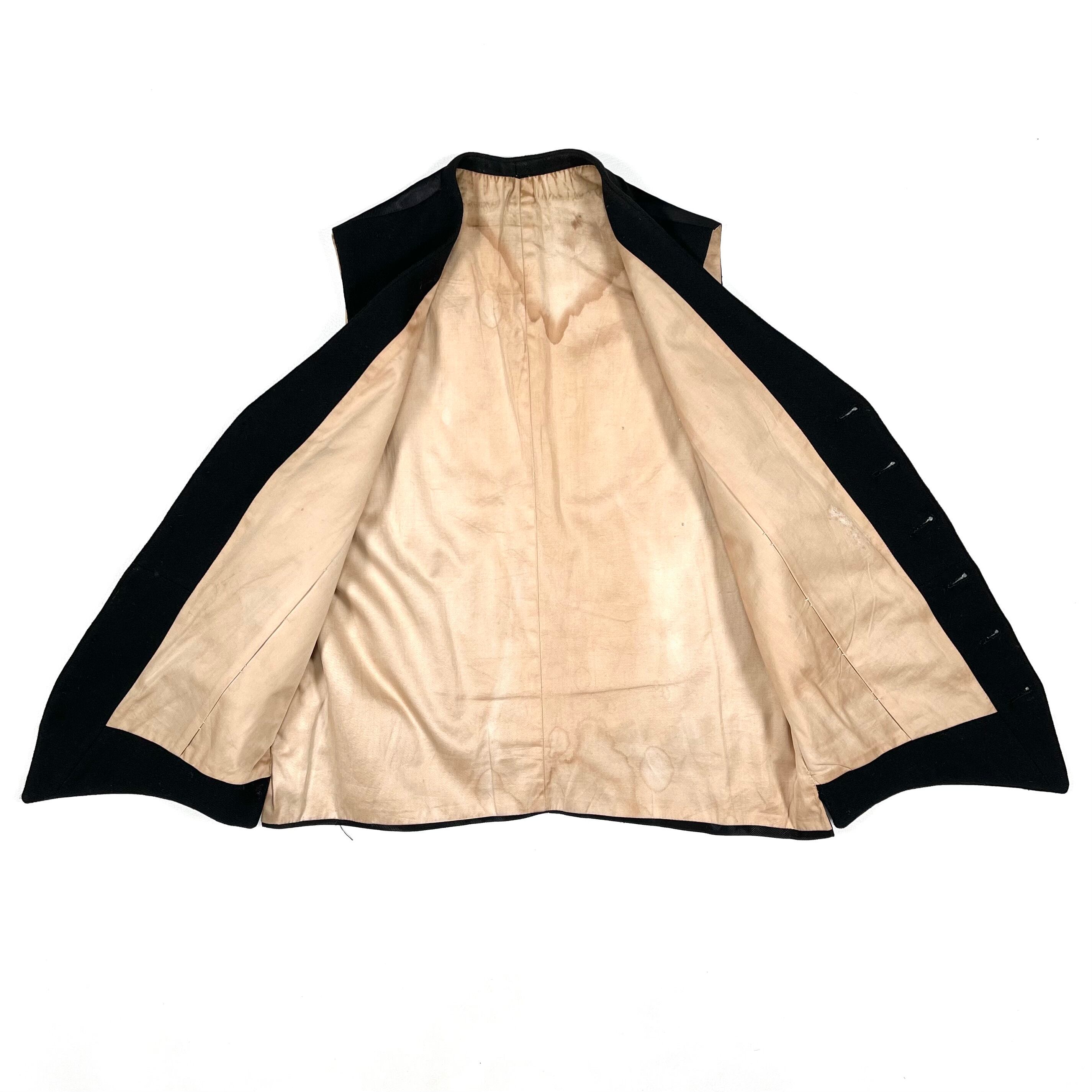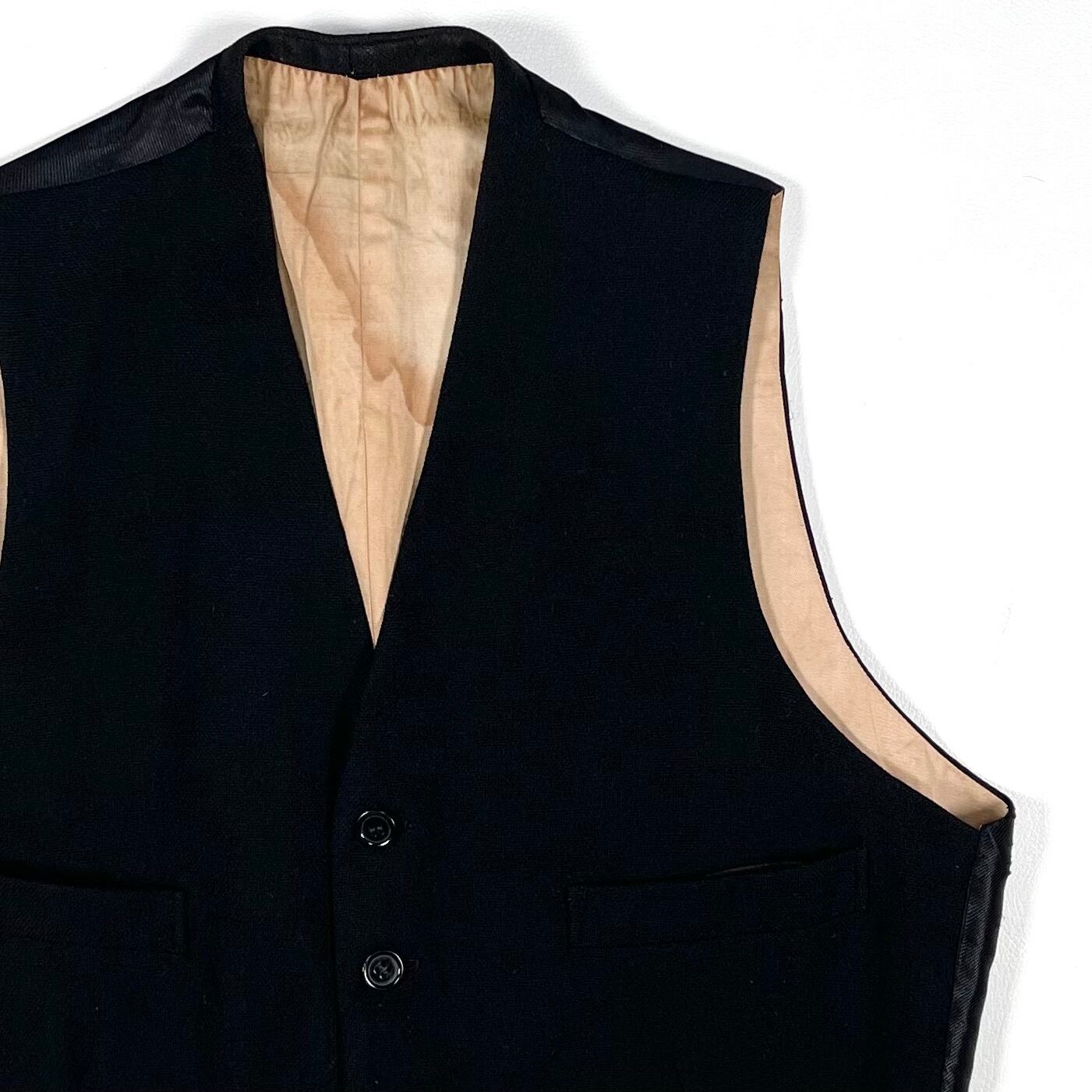 This is a classic black vest from the 1950s. It features a 4-button front and four pockets. Made from wool, the vest has a slim silhouette. Due to its age, there are stains and spots present.