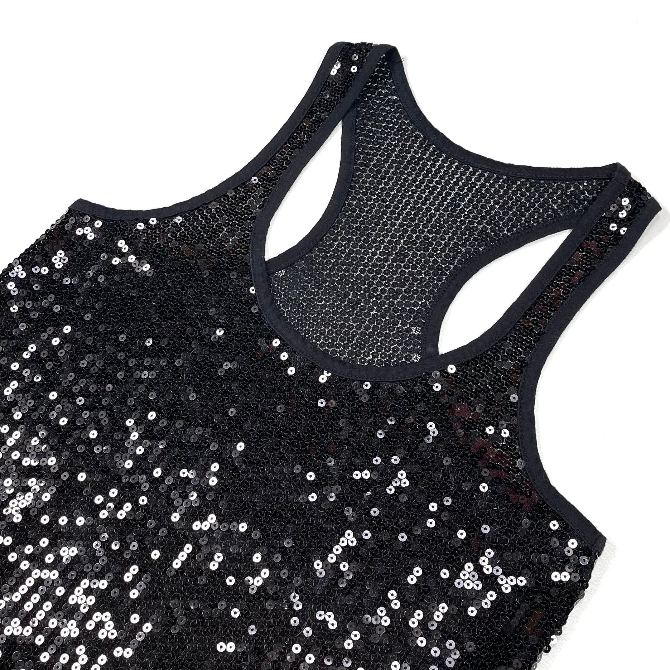 シャツやジャケットのインナー使いで、スタイリングのアクセントになるスパンコールタンクトップ