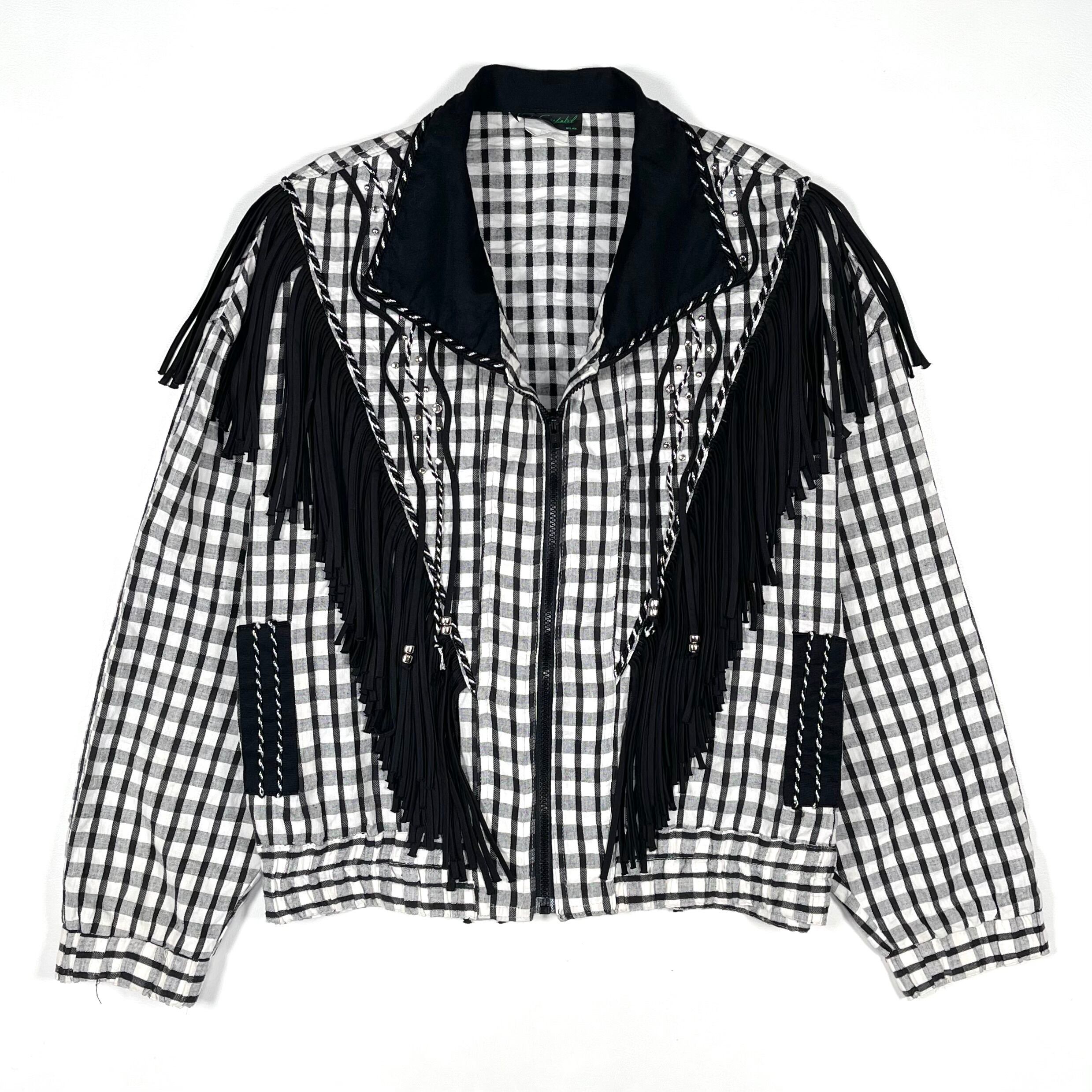 This is a loose blouson jacket with a western design. It is made from cotton seersucker fabric and features tape embroidery and fringe details. The ends of the fringe are left raw. The jacket has a relaxed, loose silhouette with drop shoulders and wide armholes. The front and back facings are made from the same fabric with a double-layer construction, while the sleeves are unlined, giving it a shirt-jacket style.