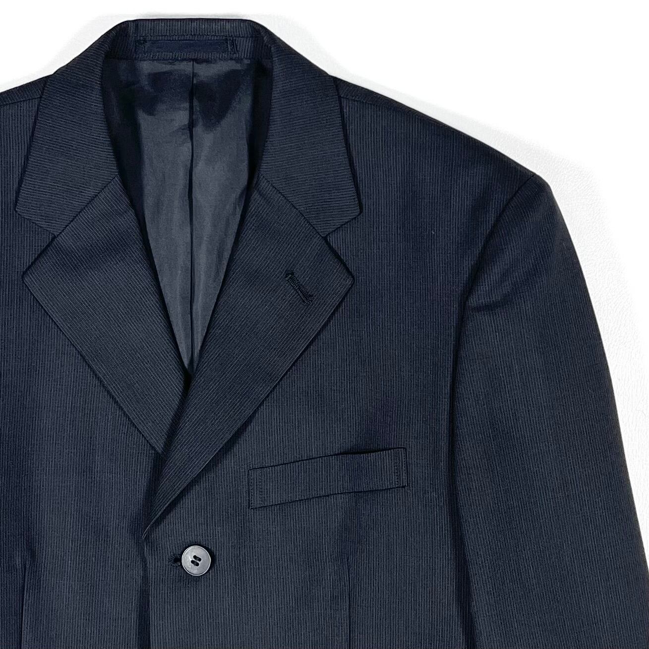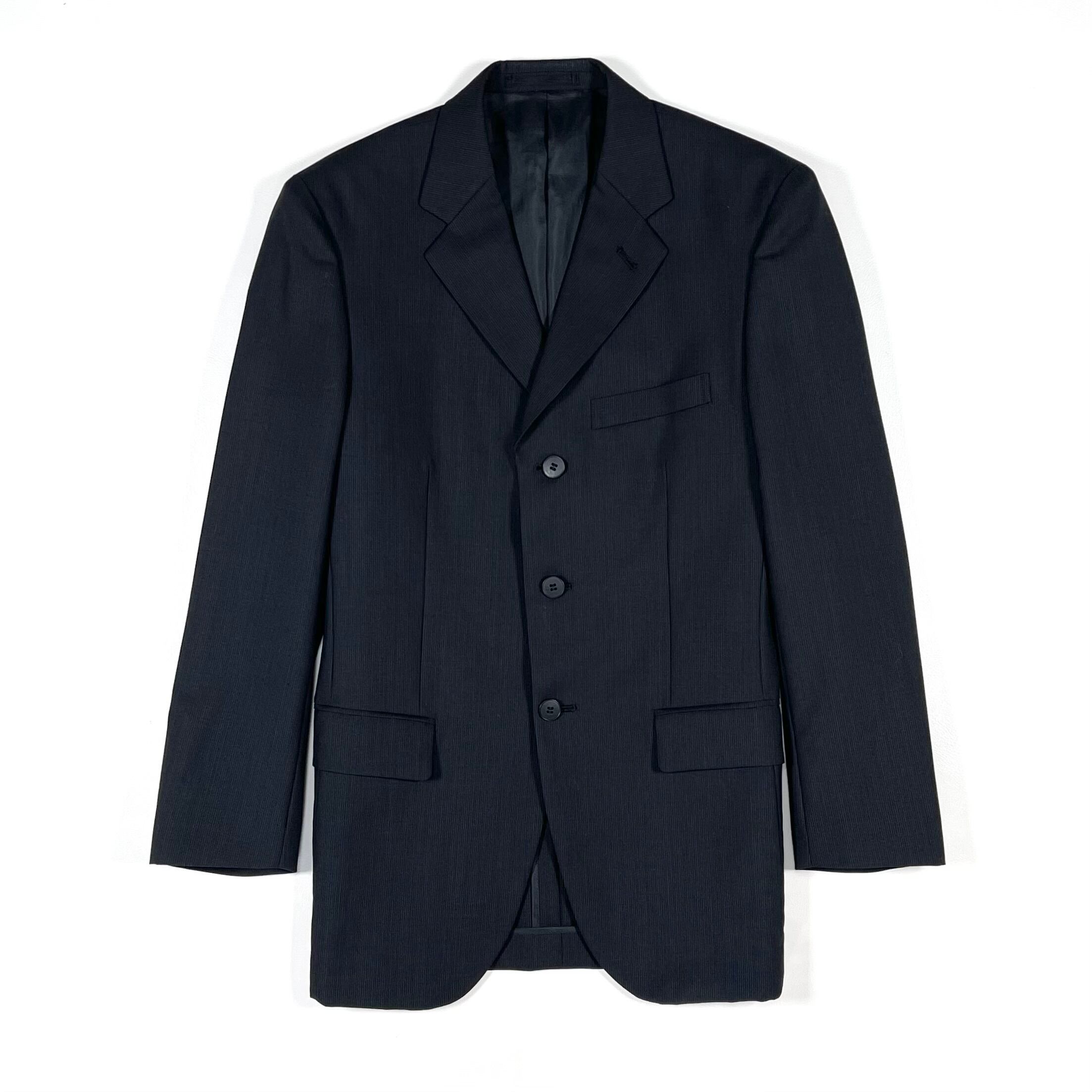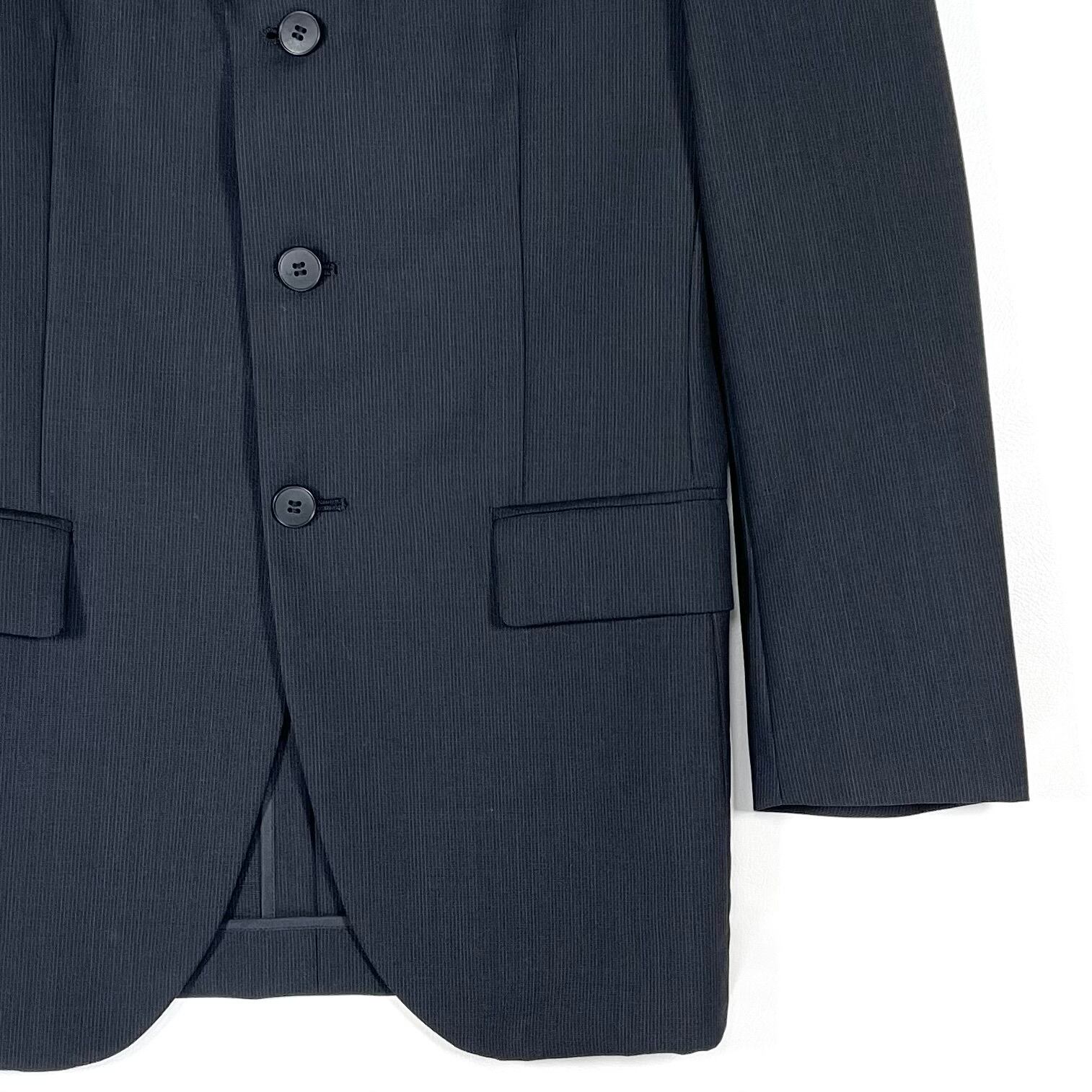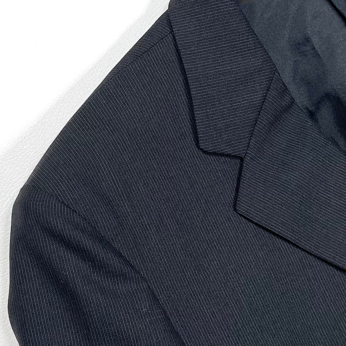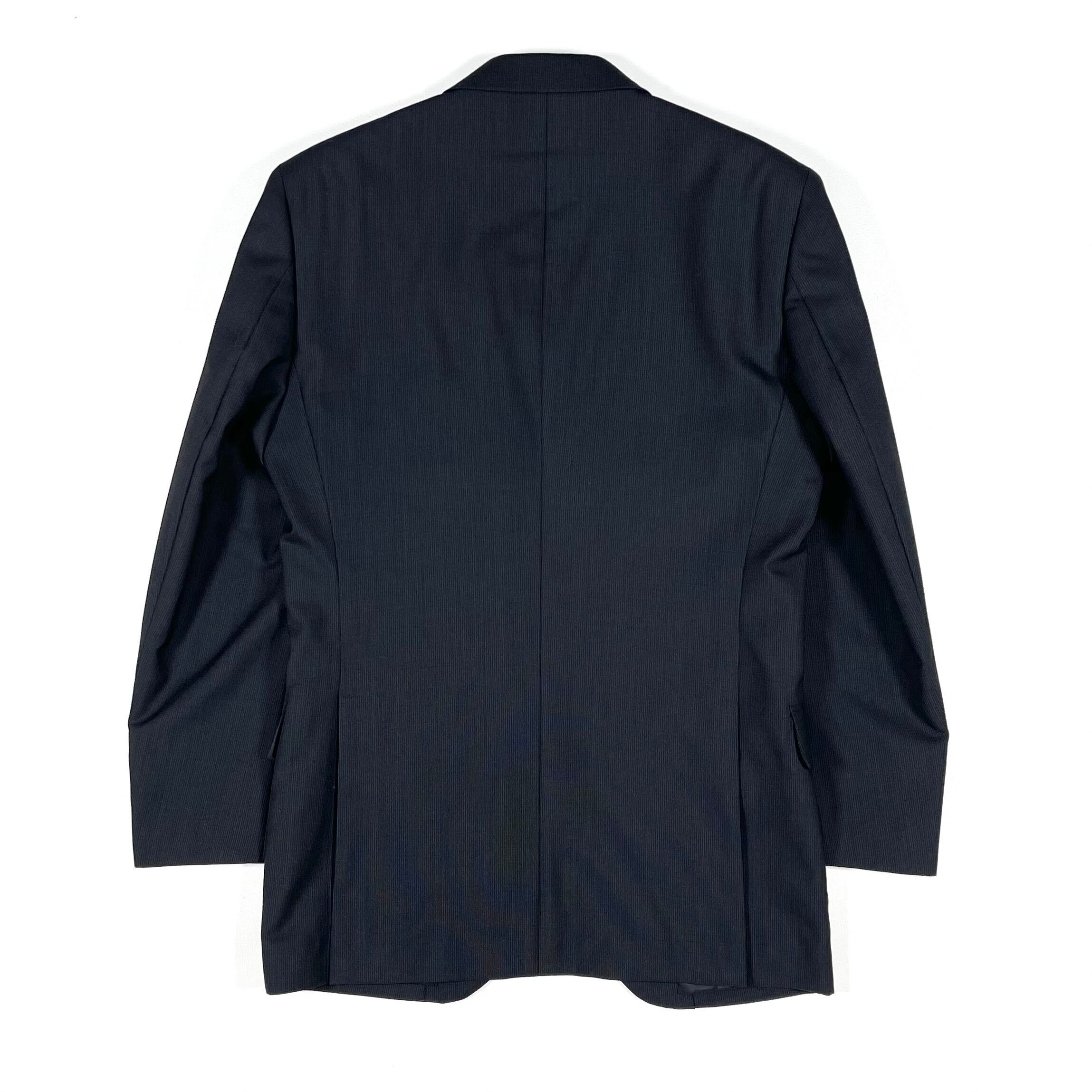 This is a classic tailored jacket in charcoal gray with a woven stripe pattern. It features a narrow V-zone with 3 buttons on the front, 4 buttons on the sleeves, and side vents. The material is a lightweight blend of wool and polyester, offering a sleek silhouette.