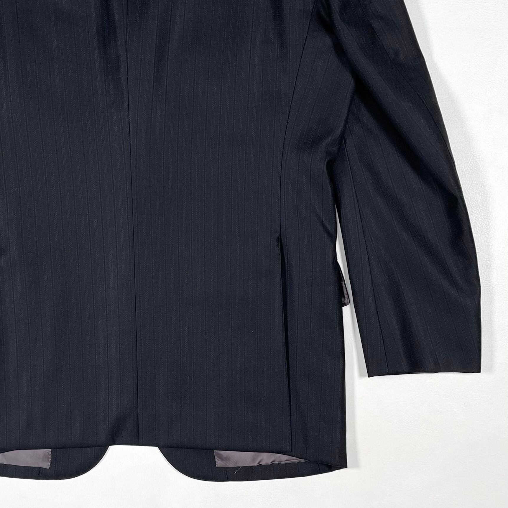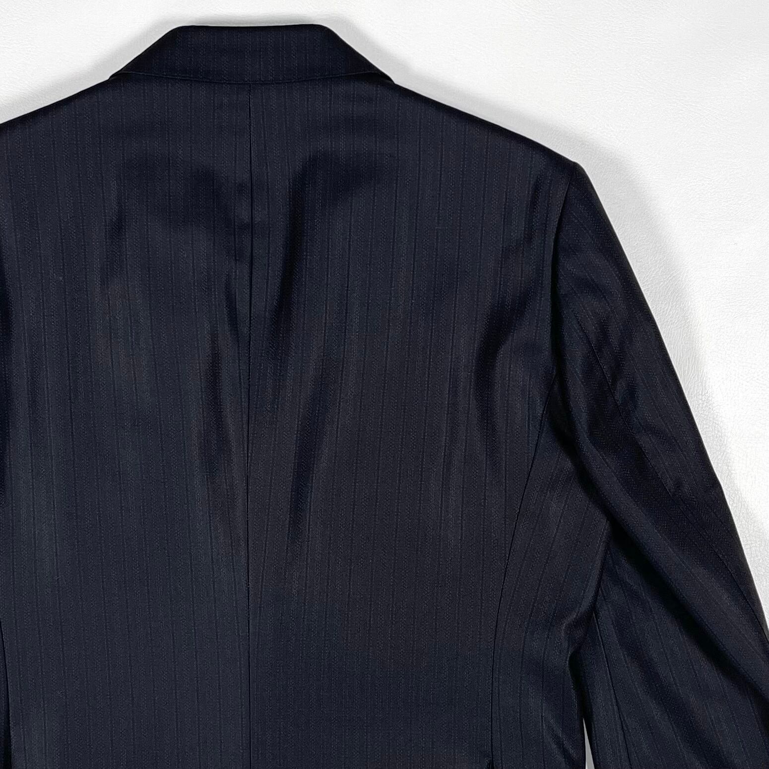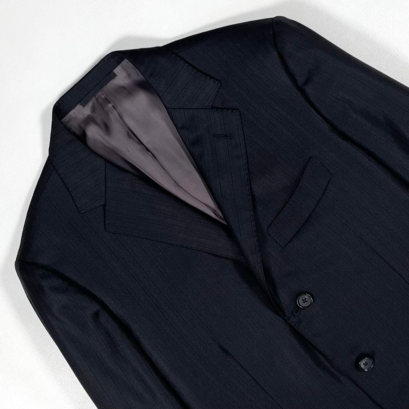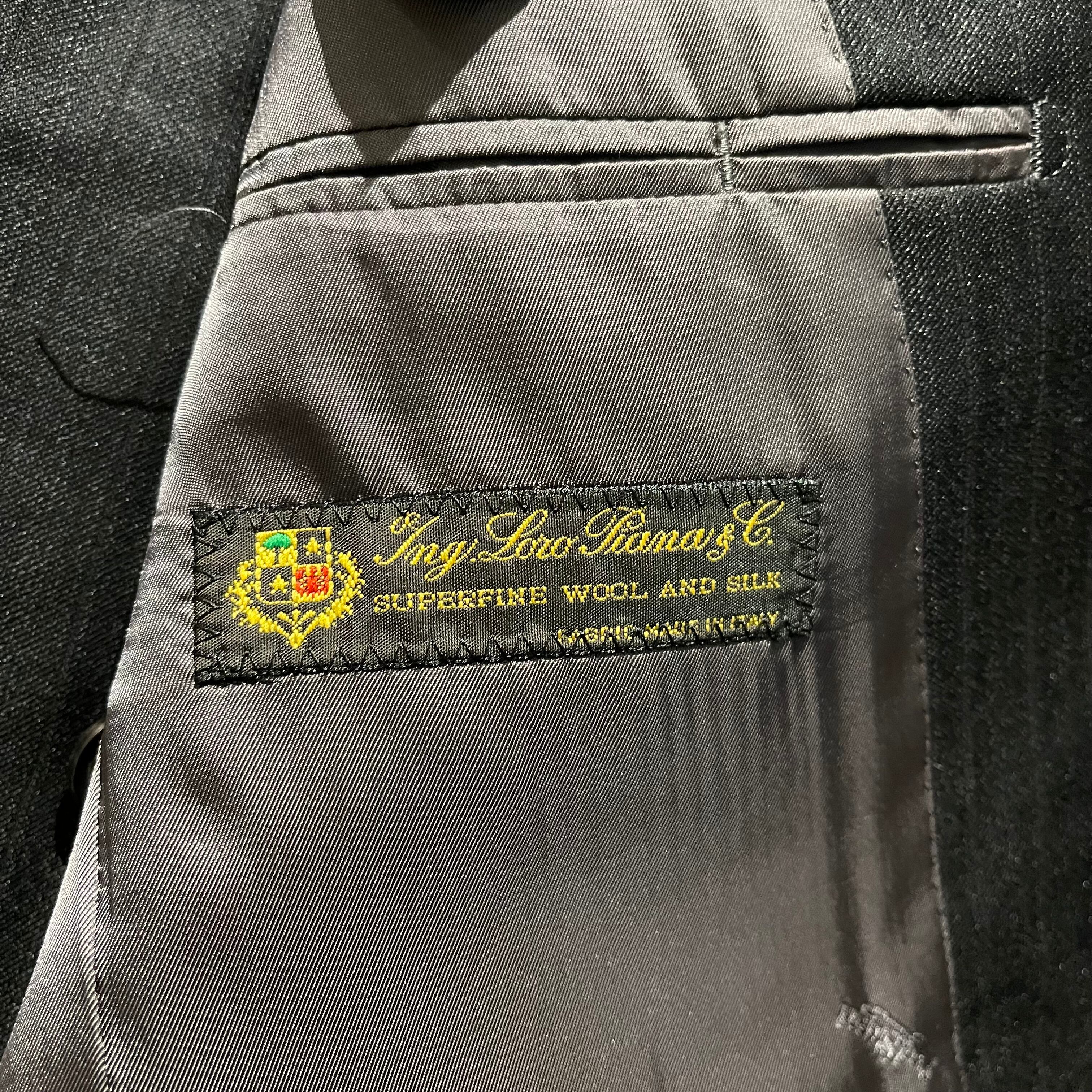This is a classic tailored jacket featuring a black woven stripe pattern. It has a narrow V-zone with 3 buttons on the front, 4 buttons on the sleeves, and side vents. The material is a blend of wool and silk by Loro Piana, giving the fabric a slight sheen.