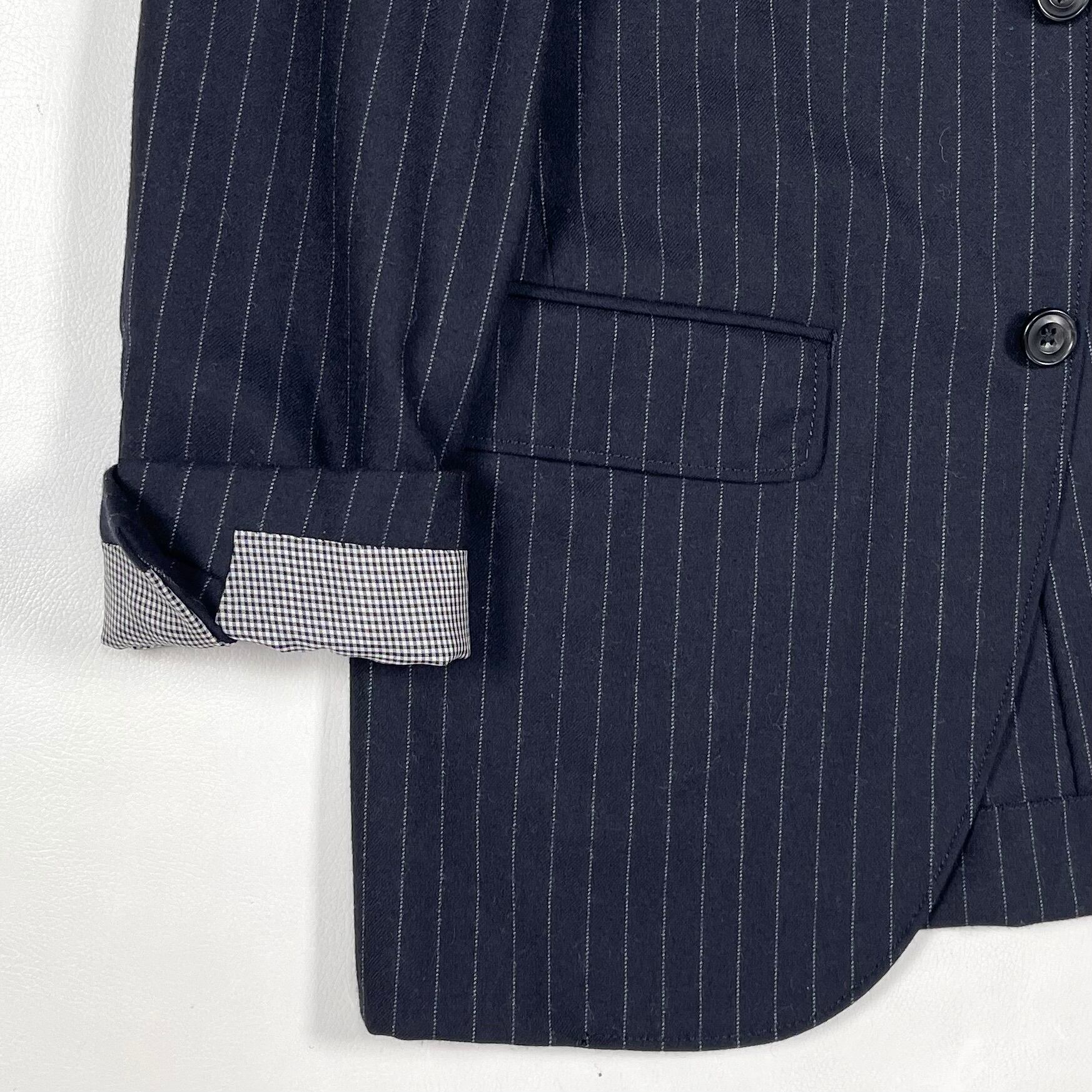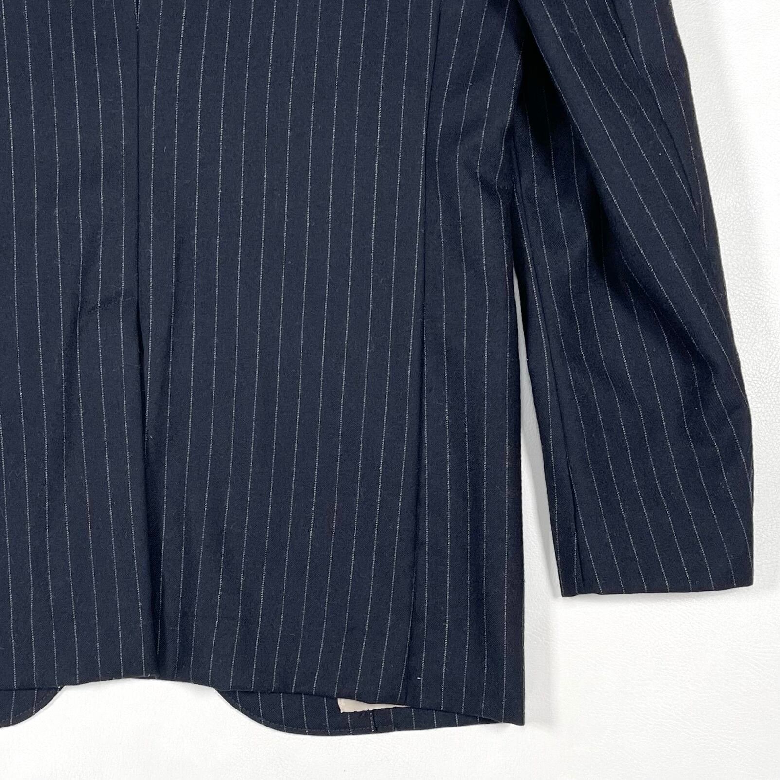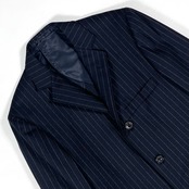 This is a classic tailored jacket in navy with white pinstripes. It features a narrow V-zone with 3 buttons on the front and 2 buttons on the sleeves. The jacket has a center vent and is made from wool. The silhouette is sleek and very tight-fitting. Although there are no shoulder pads, the front body is reinforced with a sturdy interlining, ensuring a clean silhouette when worn.