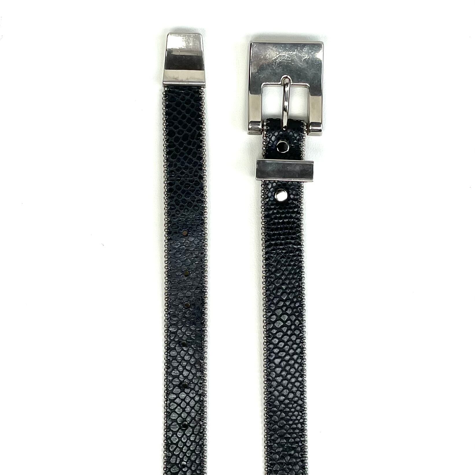 This leather belt features a square, prominent buckle and is trimmed with ball chains along the top and bottom edges. The leather has a snake-embossed texture, and there are 12 belt holes.