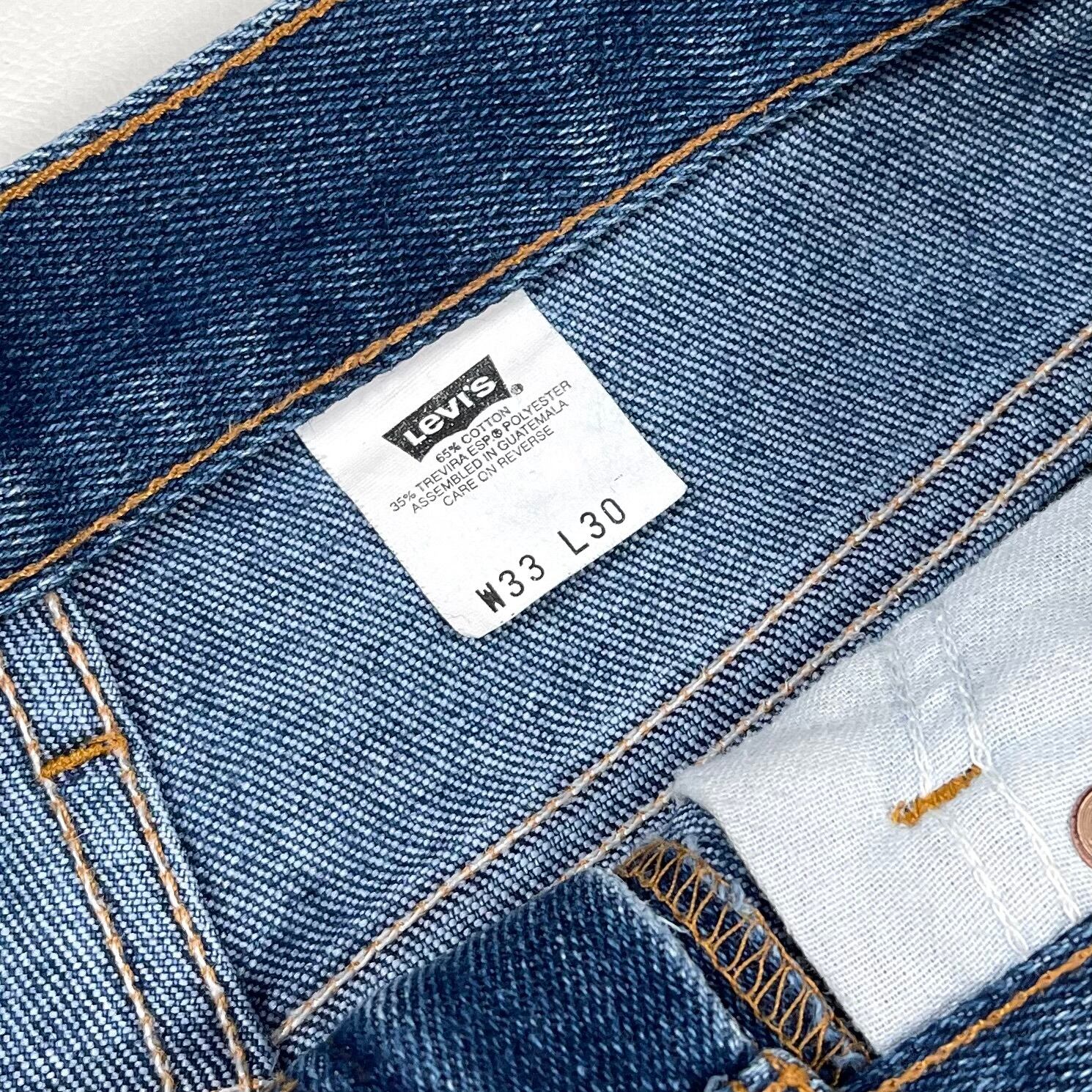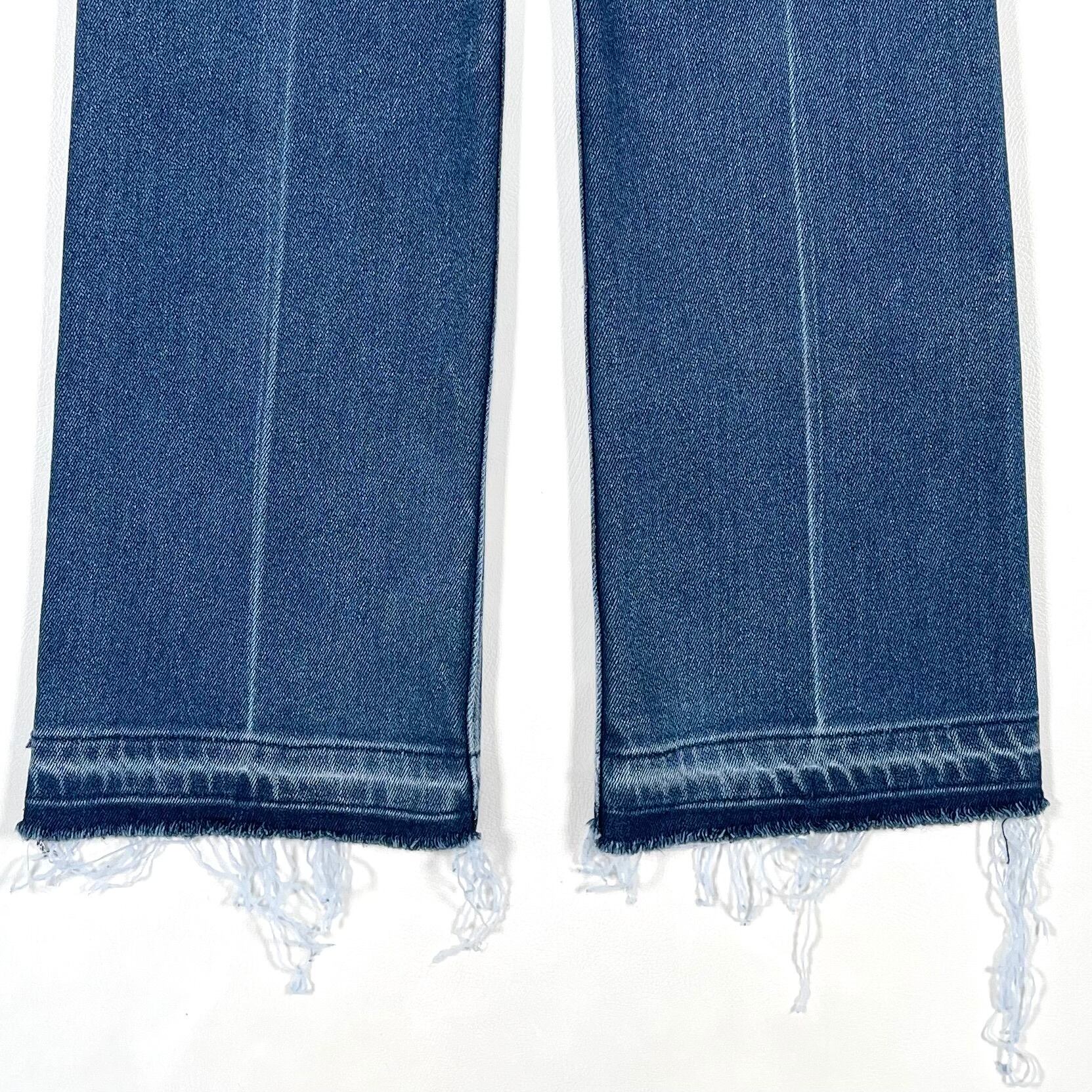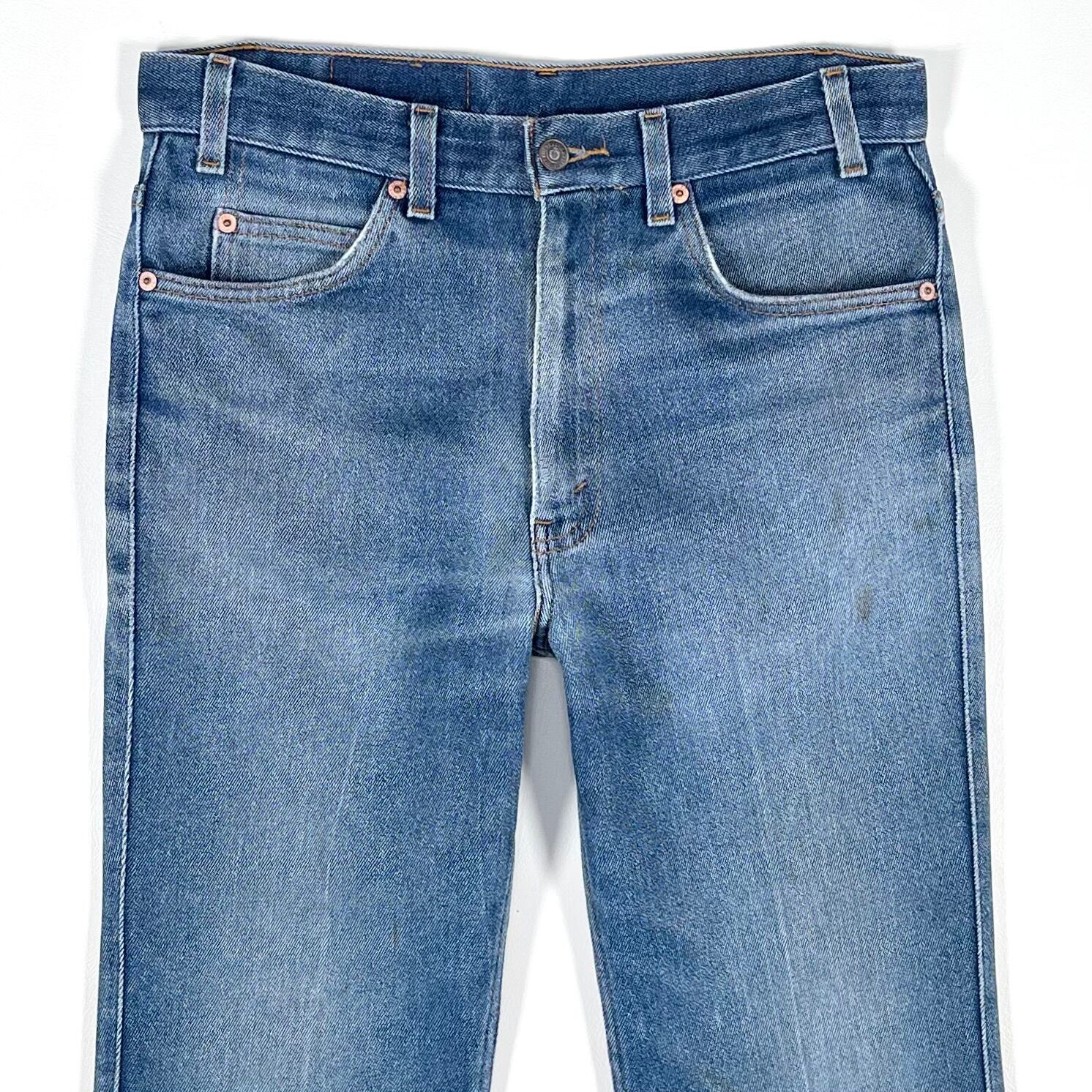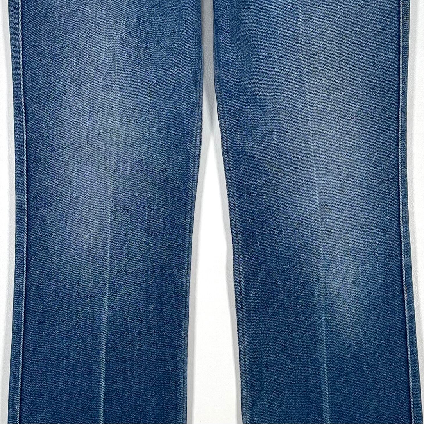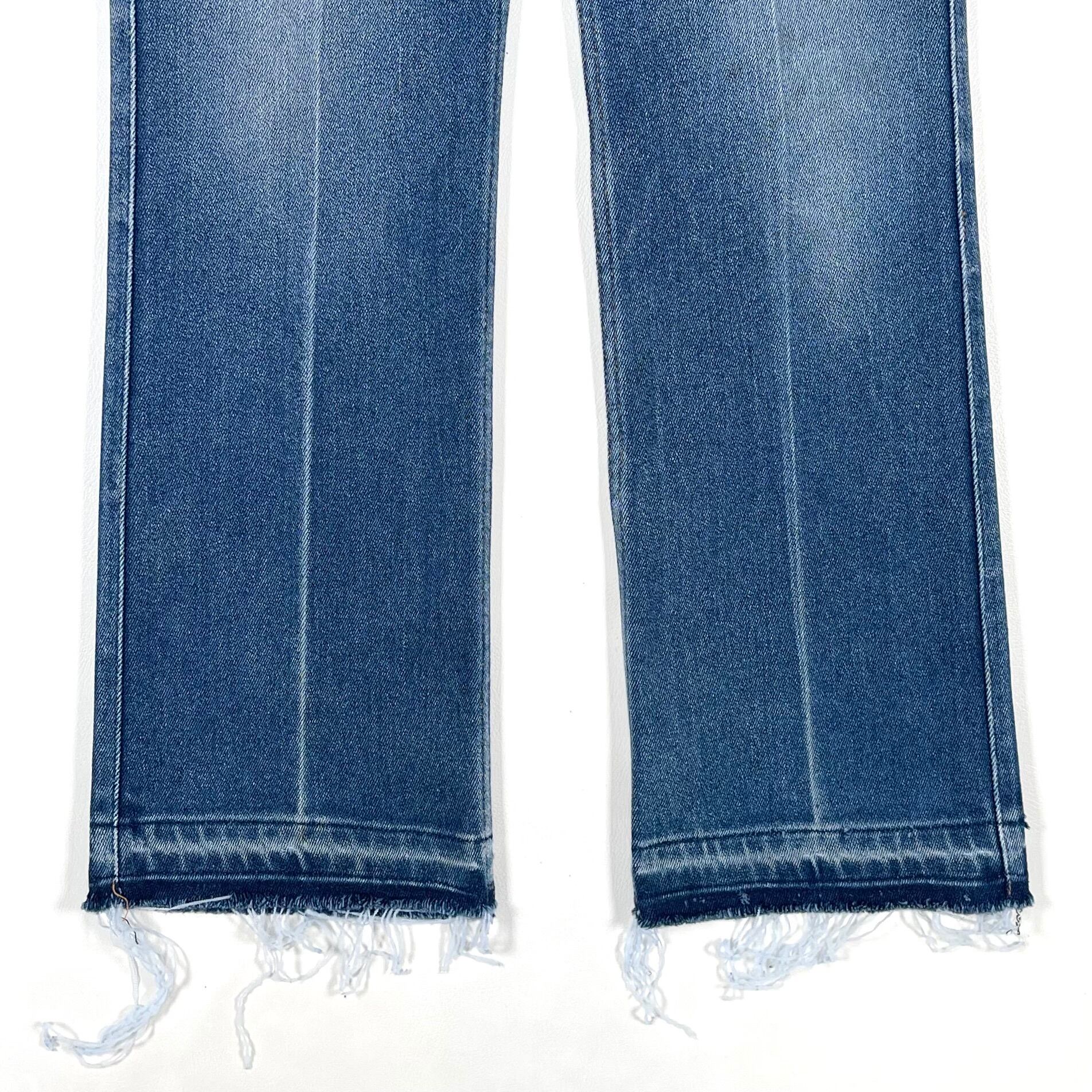 These are Levi’s 517 flared jeans made from a stretch denim blend of 65% cotton and 35% polyester. The hem stitching is undone as part of the design. The front zipper is YKK. There are stains and slight discolorations present.
