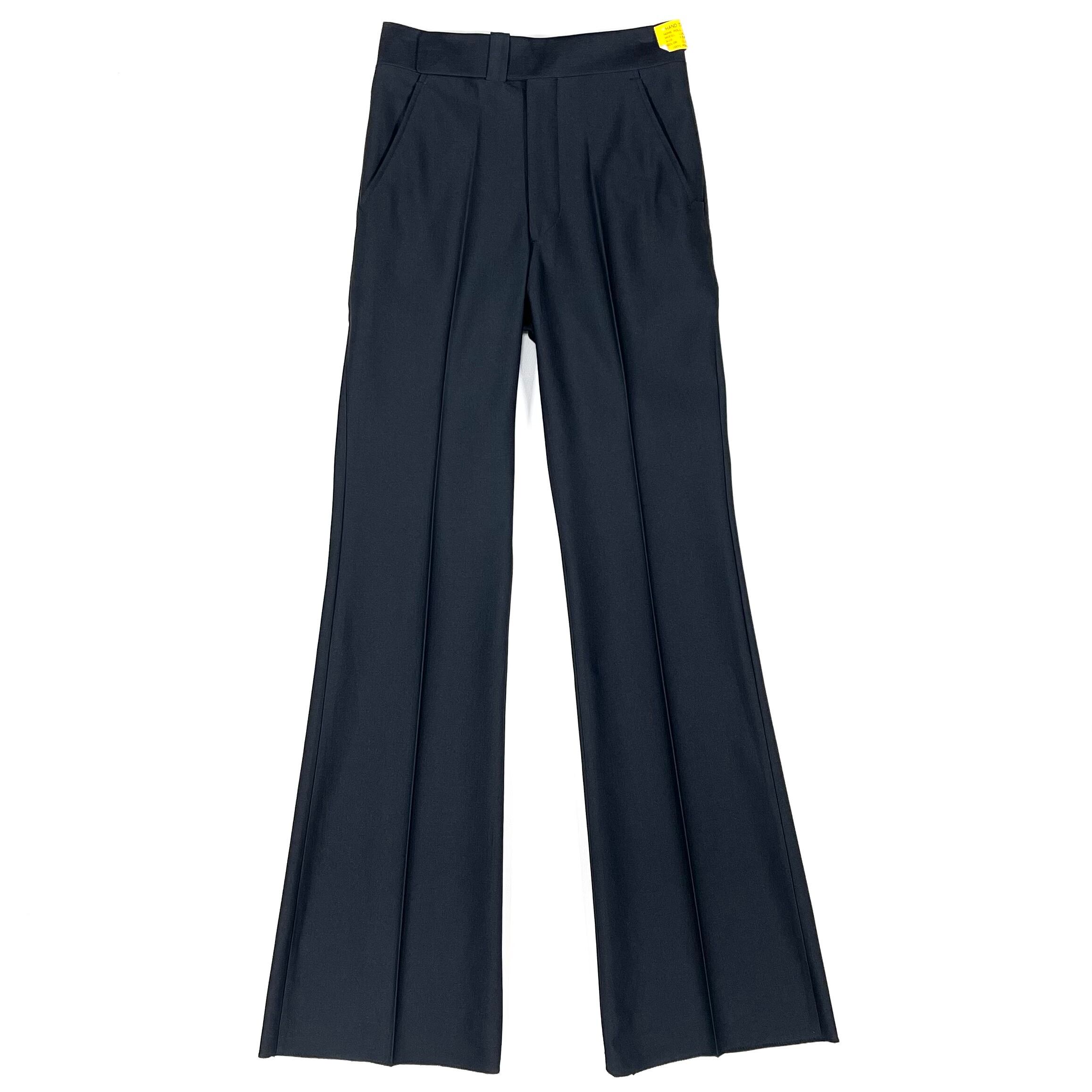 These are deadstock flared pants made from 100% polyester. The design features no belt loops at the waist. The silhouette is flared, with a narrowing at the knees and a widening towards the hem.