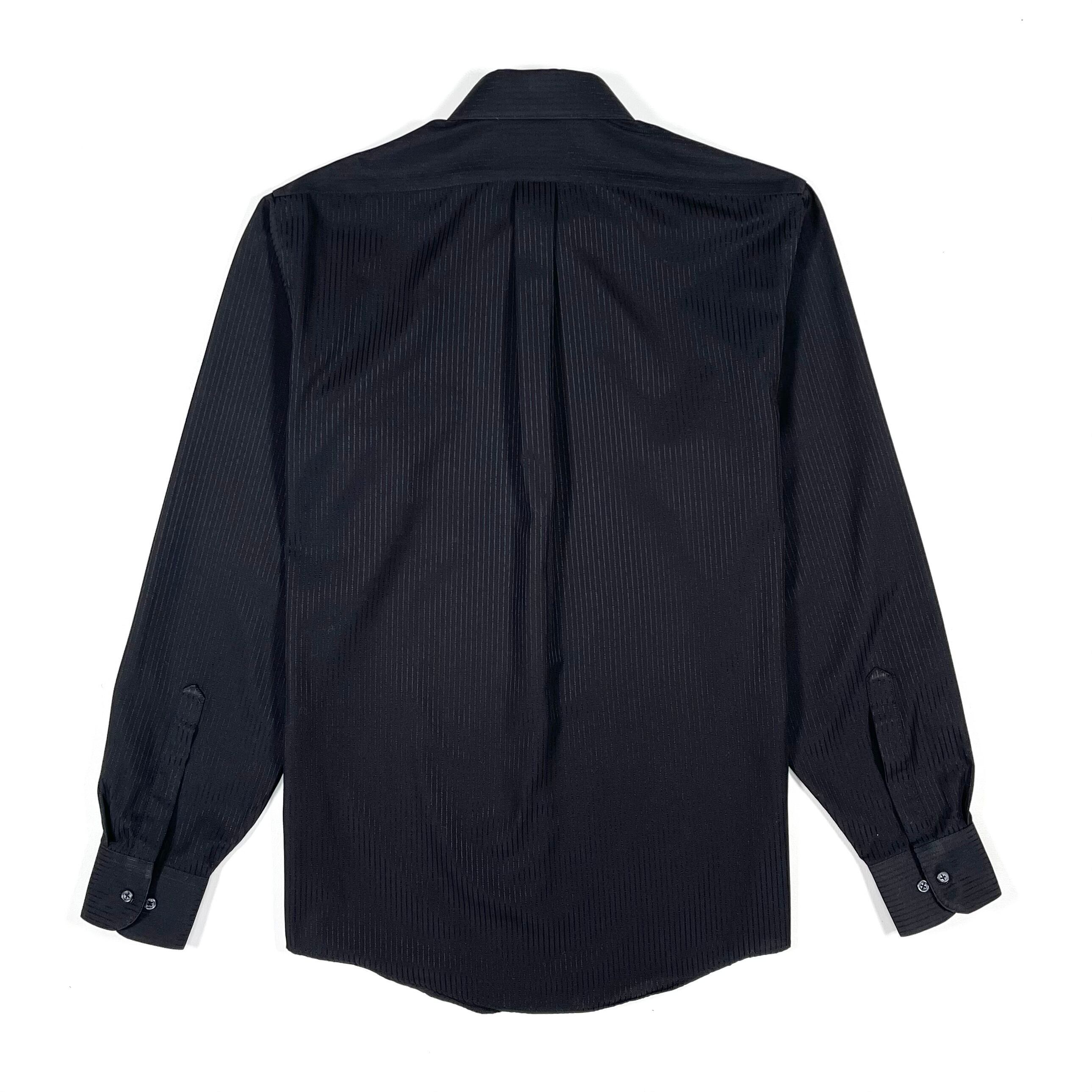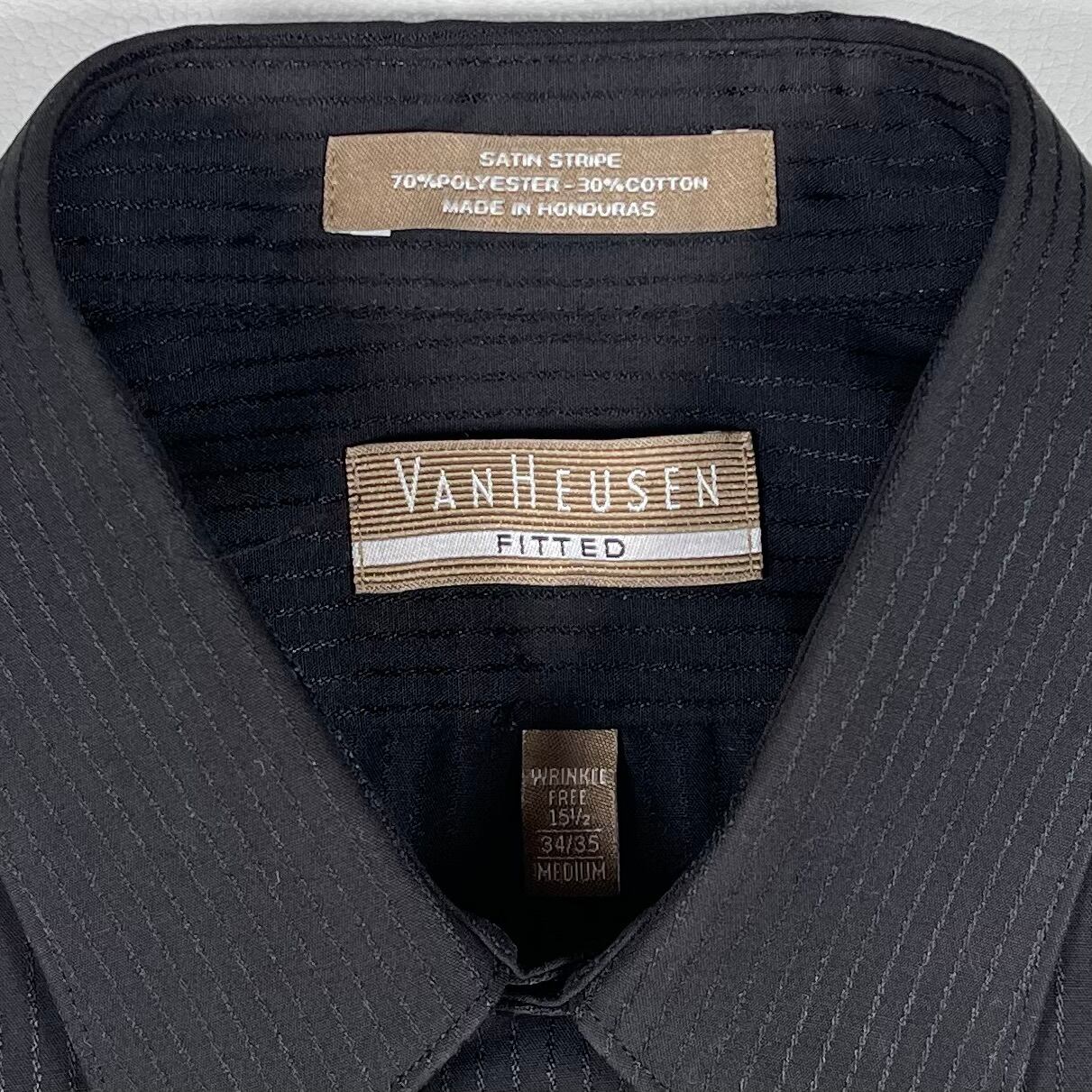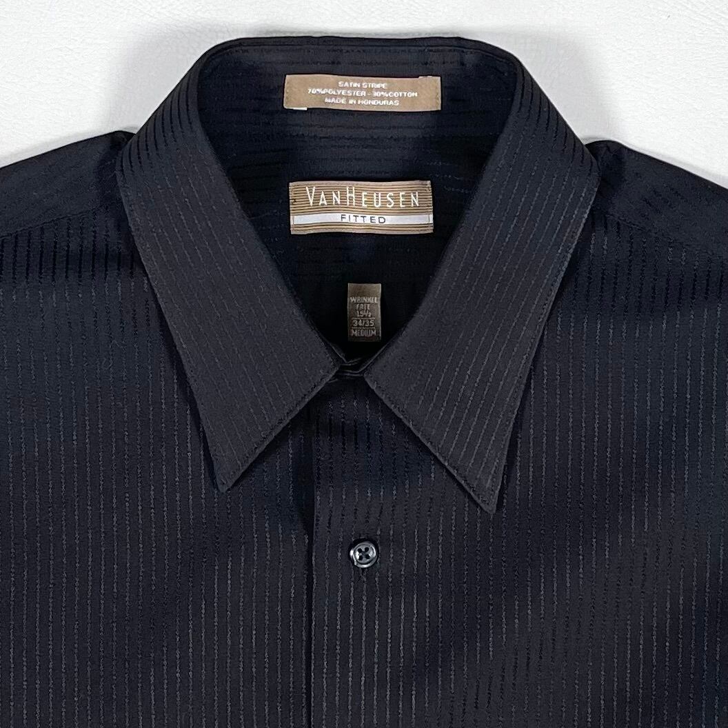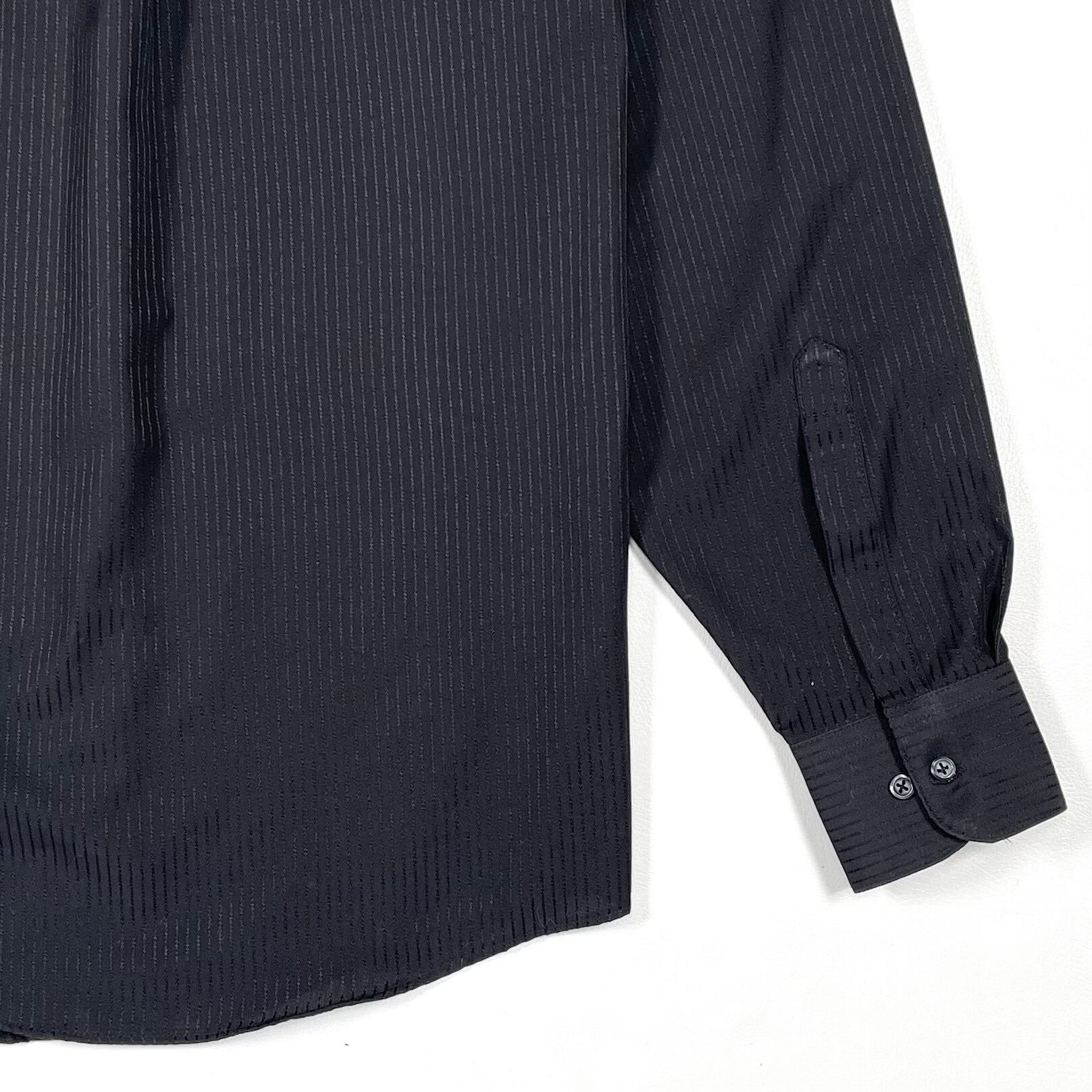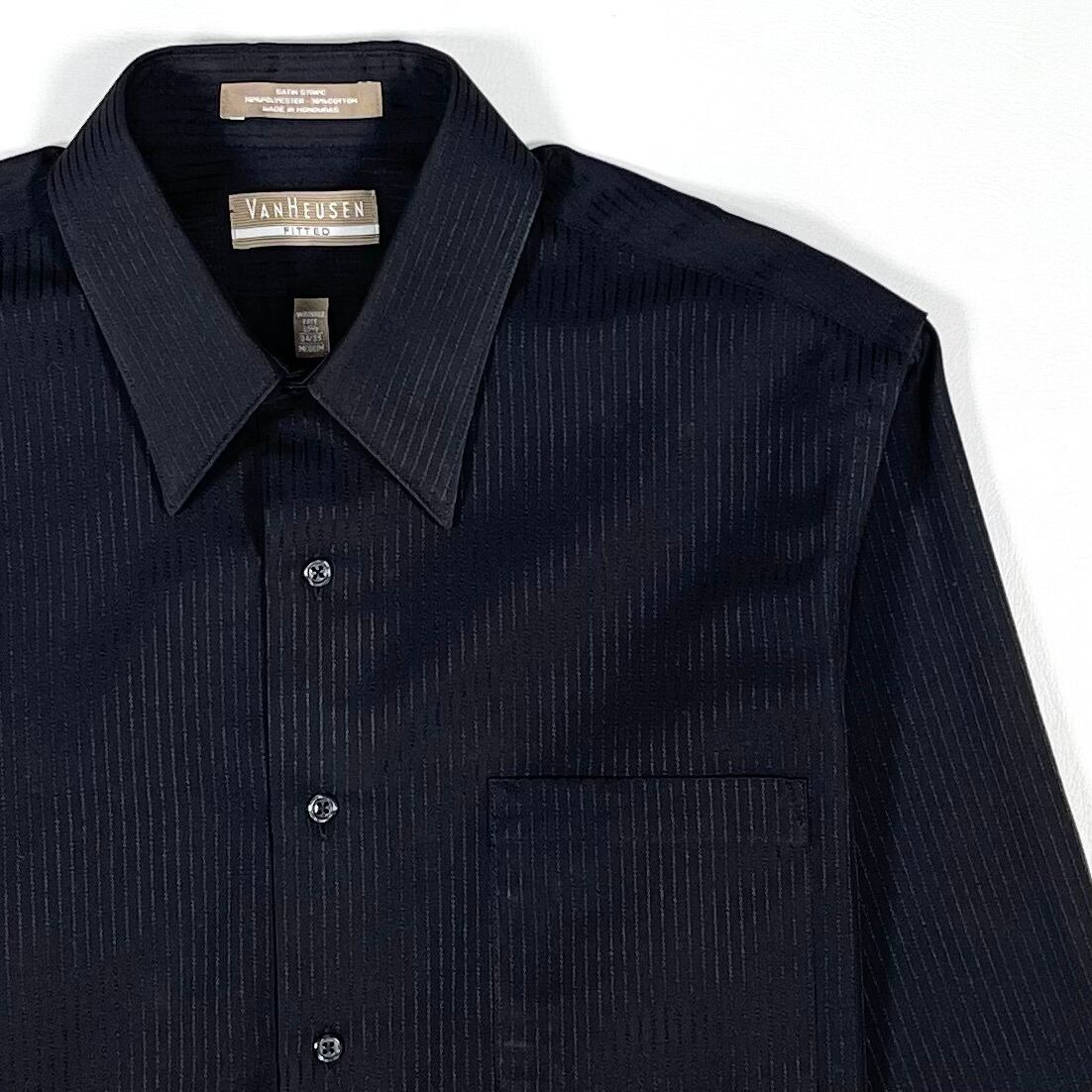 This is a regular-collar shirt by VAN HEUSEN featuring a black-on-black woven stripe pattern. It’s a basic and versatile stripe shirt made from 70% polyester and 30% cotton.