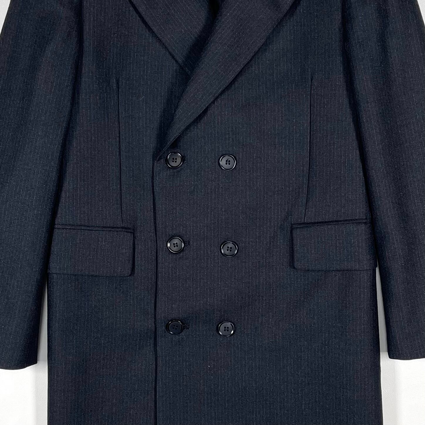 This is a six-button double-breasted coat with a classic style featuring a shallow V-zone. It has six buttons on the front and three buttons on the sleeves. The back has no vent, resulting in a straight silhouette. The coat features a charcoal gray fabric with white pinstripes, made from wool suiting fabric in a long jacket style. It has a very small and tight silhouette.