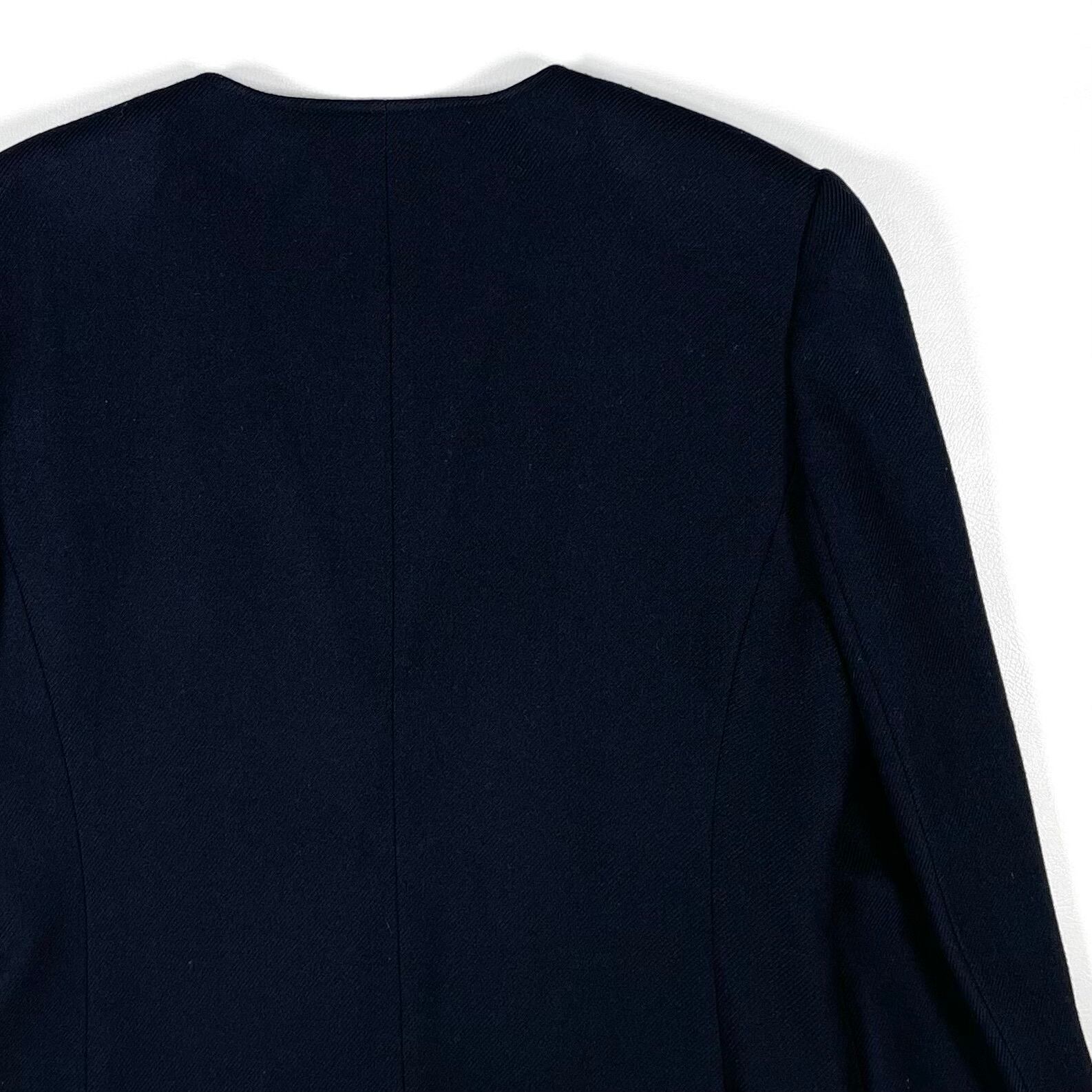 This is a collarless jacket with a classic design. It features two buttons on the front and two buttons on the sleeves. There is a welt pocket on the chest and flap pockets on the sides. The jacket is made from wool and comes in classic black.