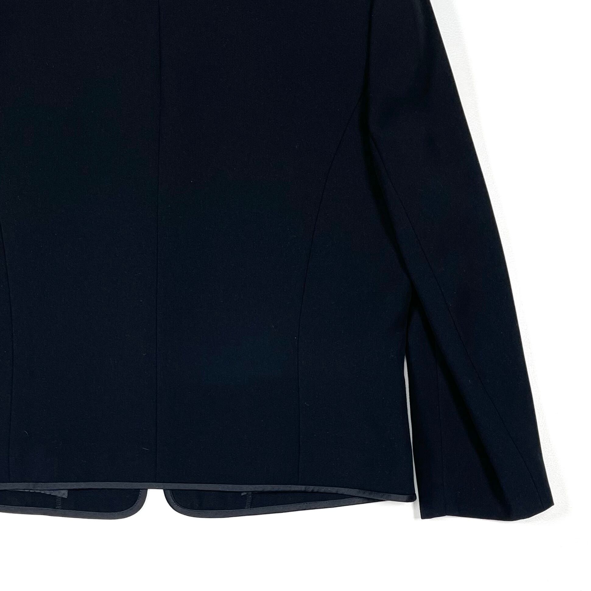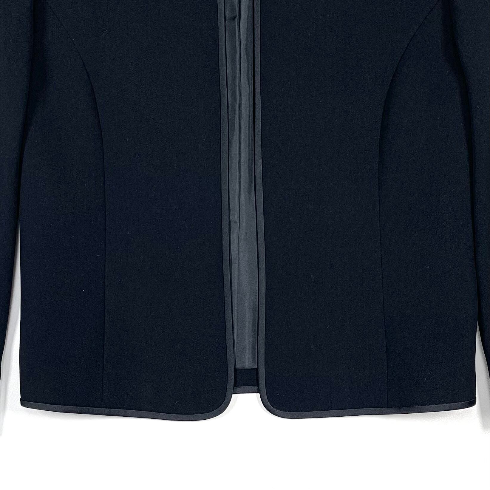 This is a collarless classic jacket. It features satin trimming along the neckline down to the hem. The jacket has a short length and a compact silhouette design. The material is a smooth polyester.