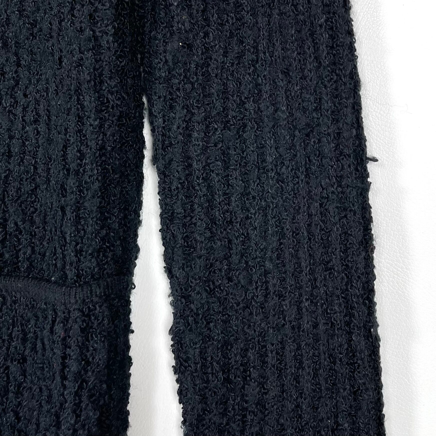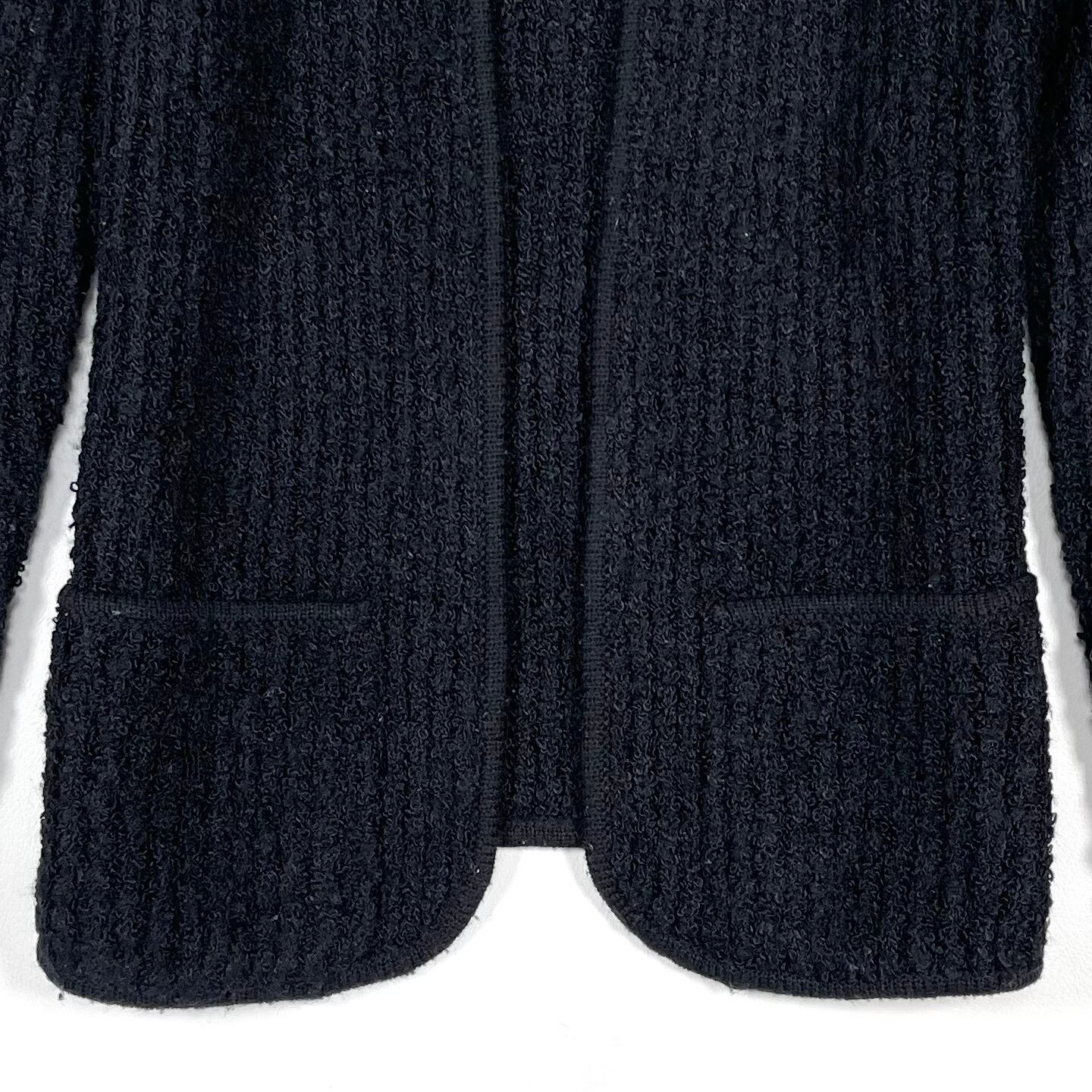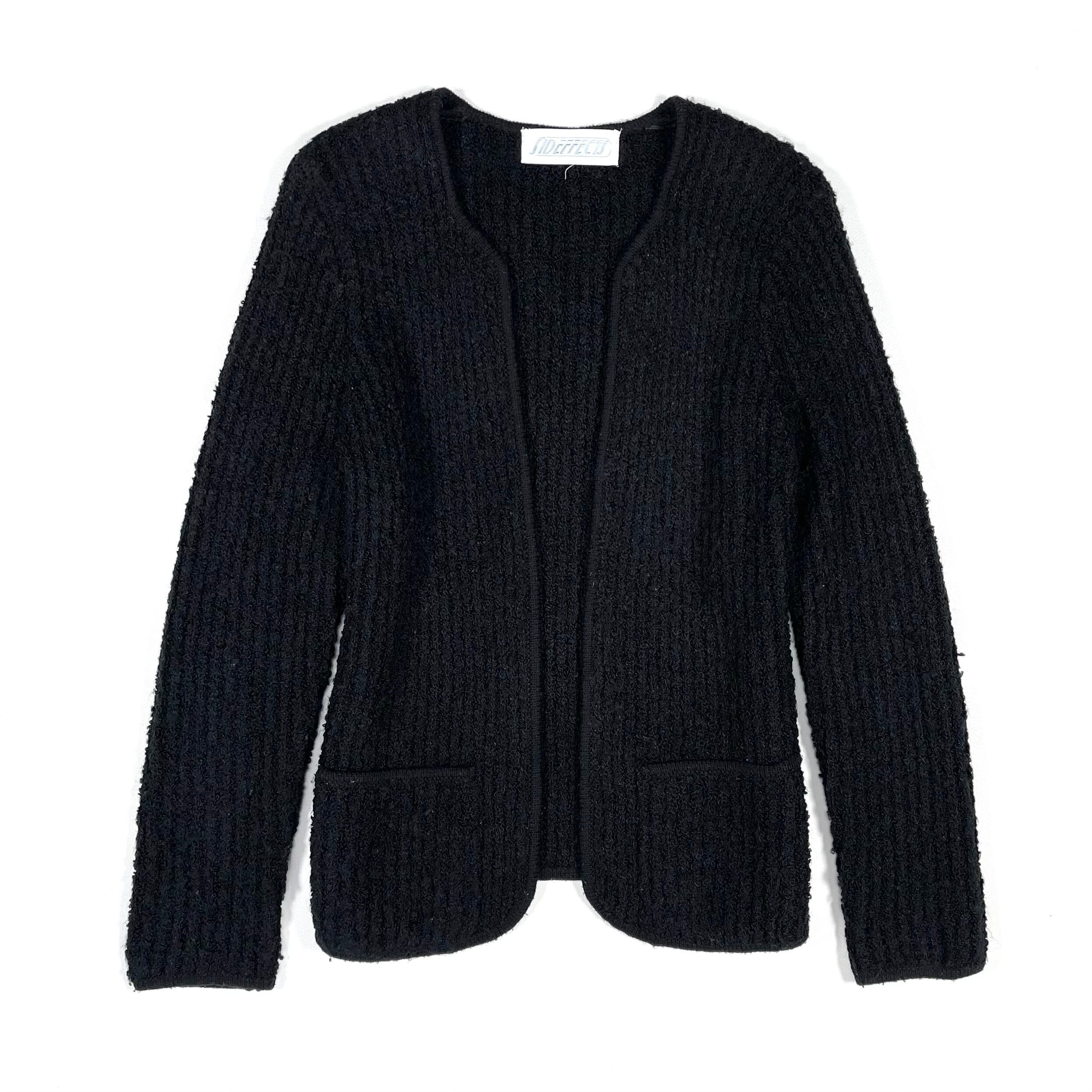 This is a collarless cardigan. The design features an open front with no fastenings and side pockets on both sides. It has a slim, compact silhouette and is made from an acrylic knit material. There is some characteristic fuzziness due to wear.