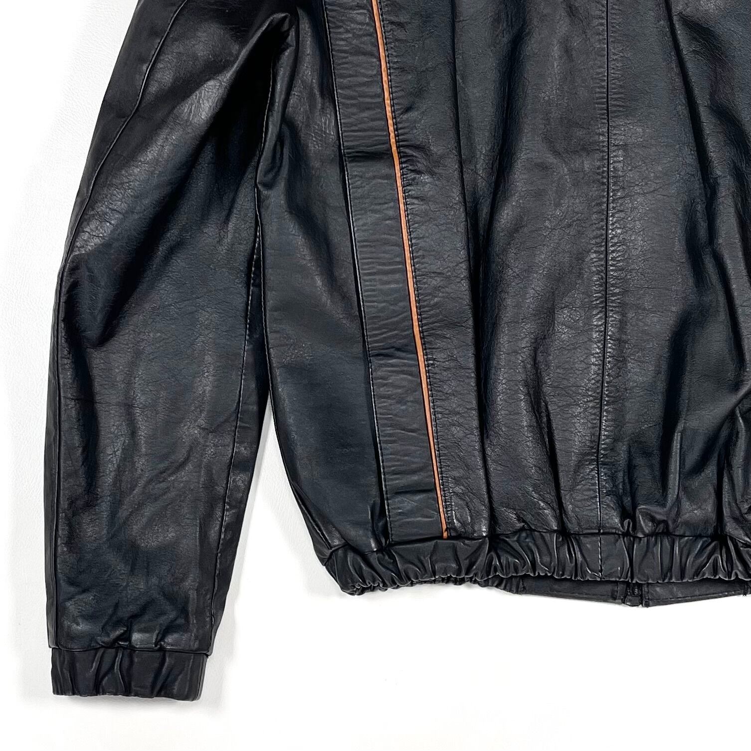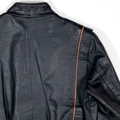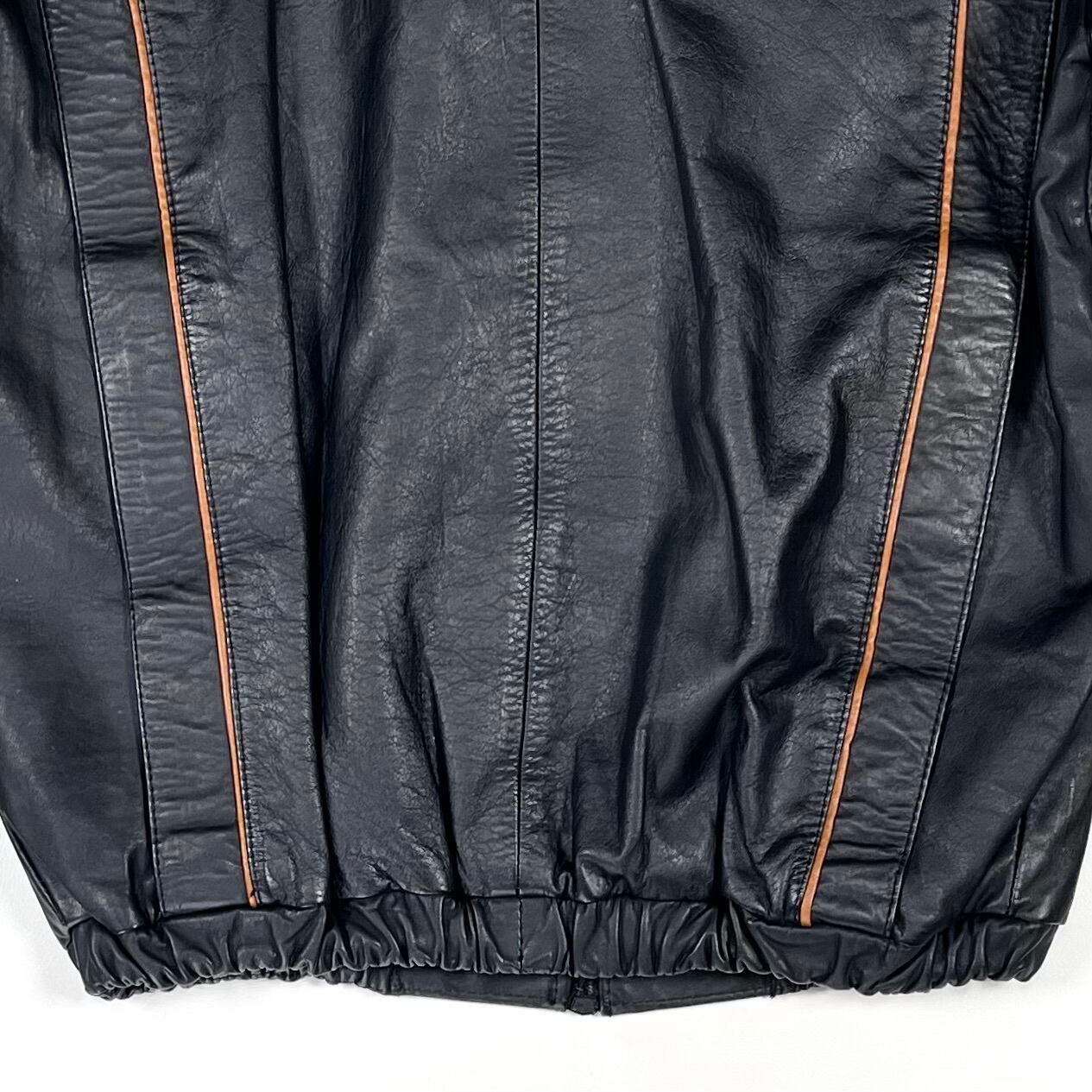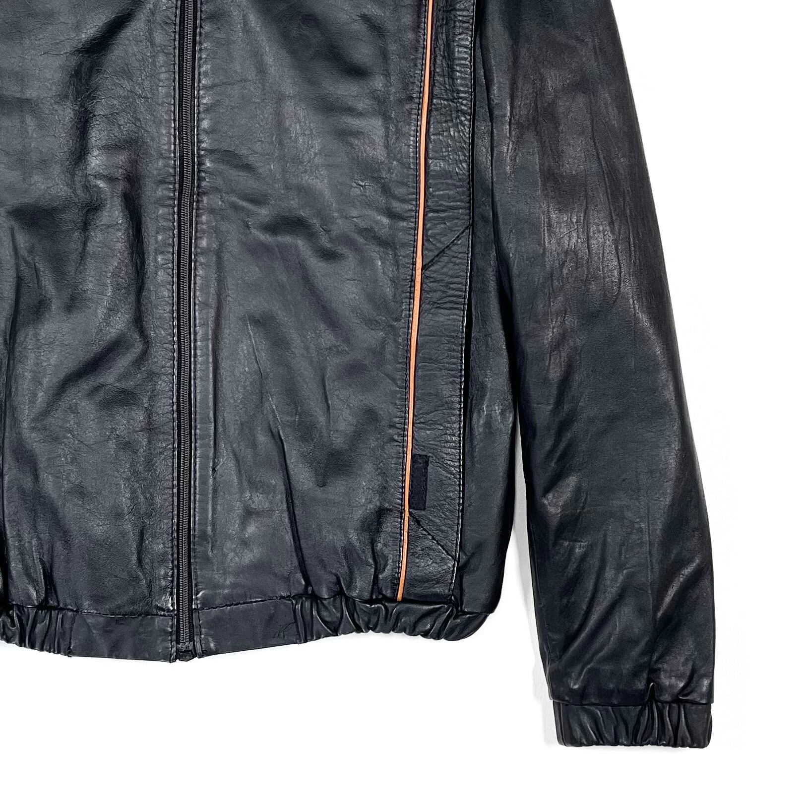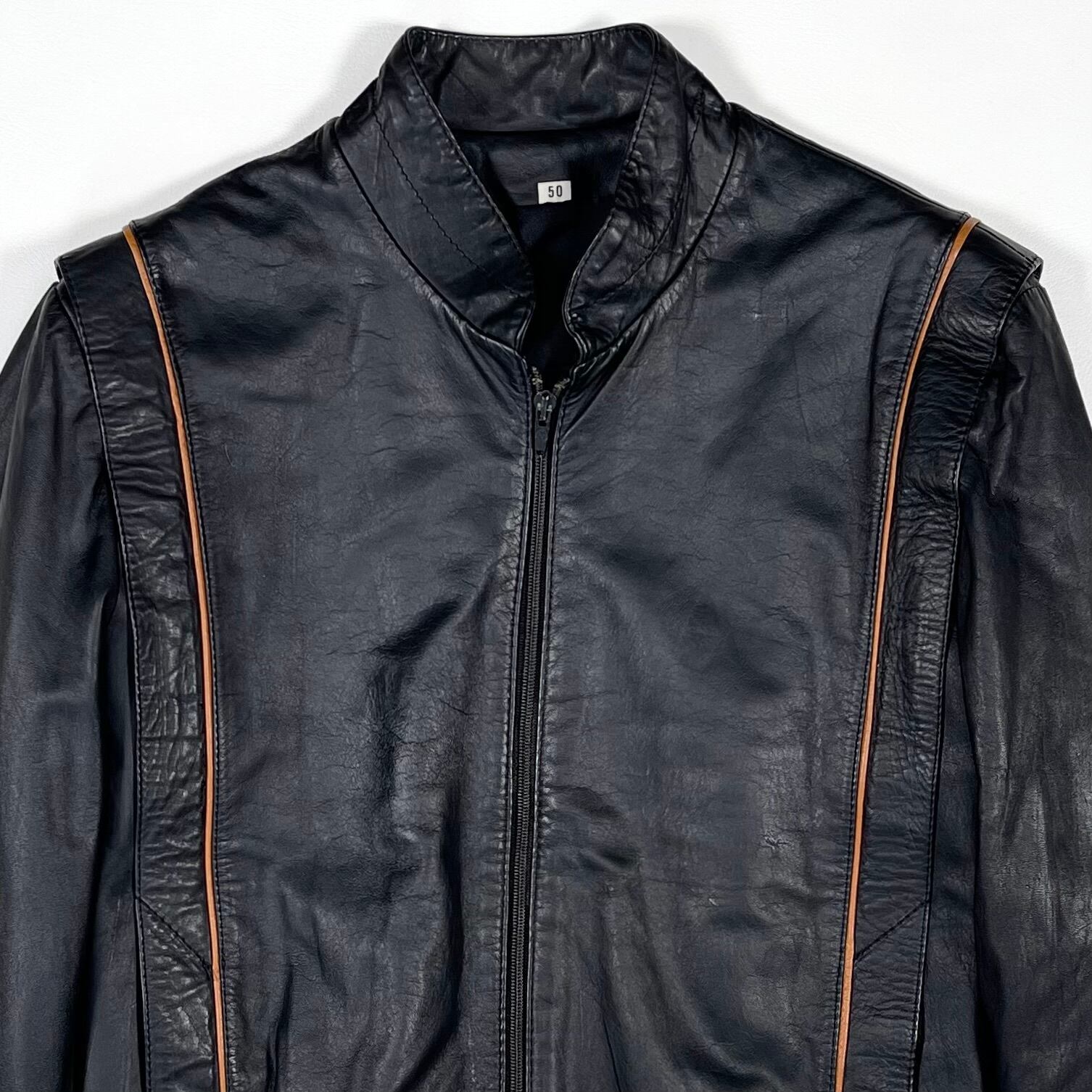 This is a stand-collar leather blouson featuring distinctive orange-brown piping on the front and back. The design is sporty, resembling a track jacket. The cuffs and hem are elasticated. The leather blouson has a well-balanced design, though there are visible stitch marks on the collar.