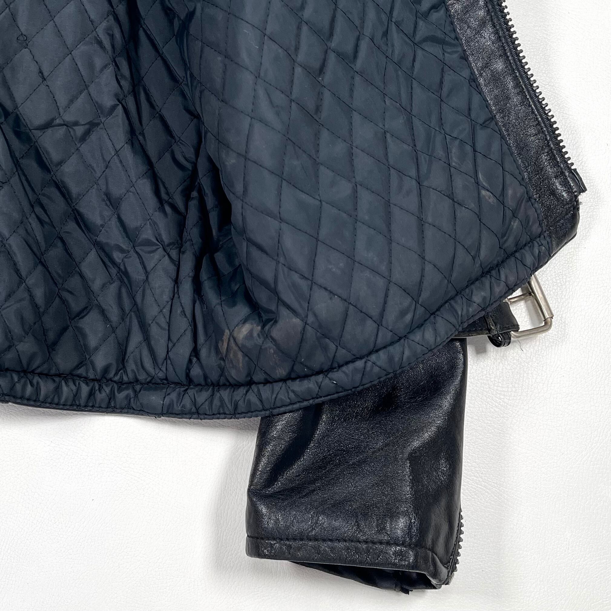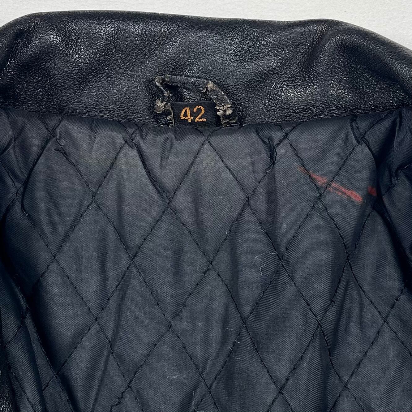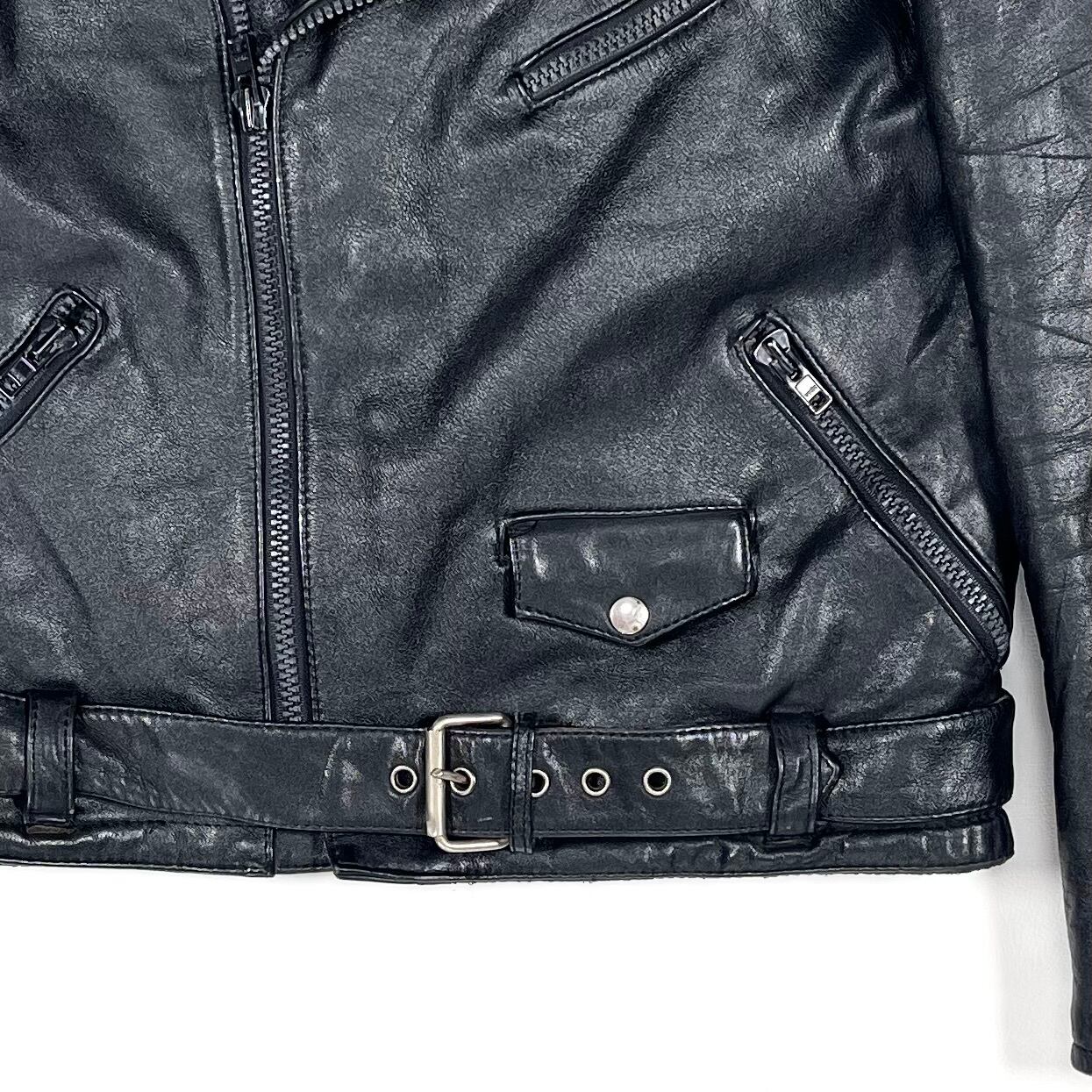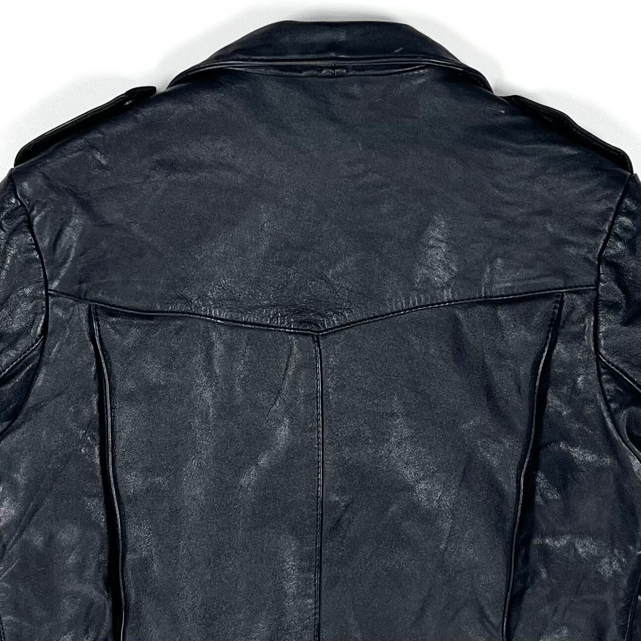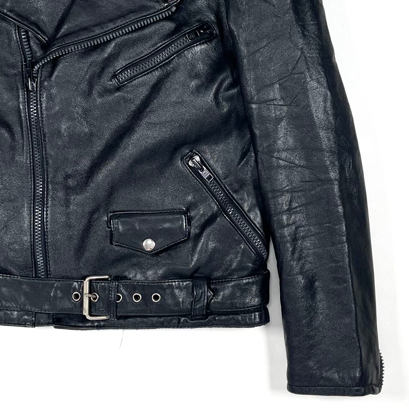 This is a classic biker jacket featuring the standard biker jacket design. It has all-black zippers, giving it a different look compared to the usual silver zippers. Made from cowhide leather, the jacket shows wrinkles and scuffs from wear.