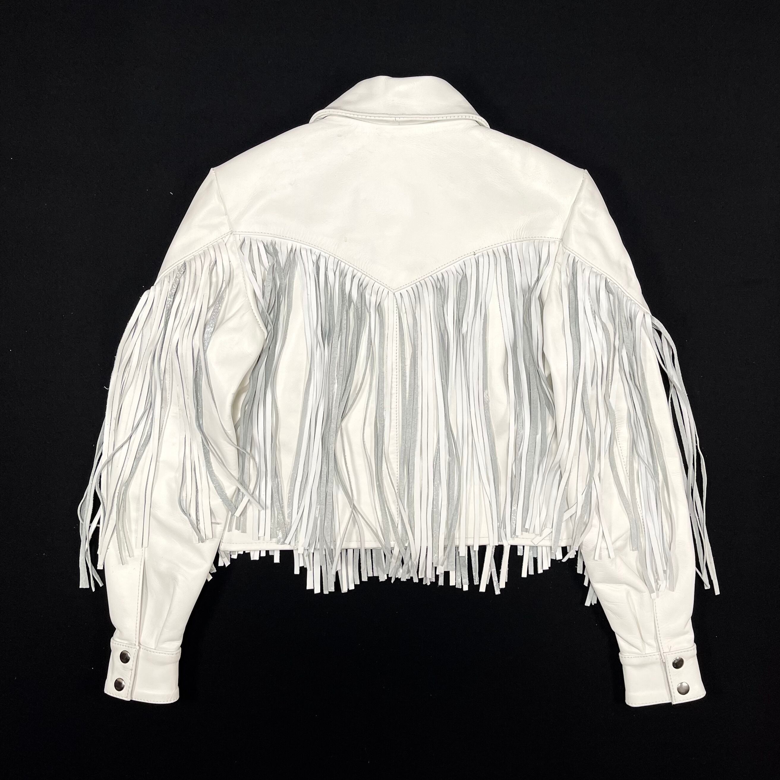 This is a leather Western jacket, featuring a distinctive design with long fringes on white leather. It has a narrow shoulder width and a tight silhouette, with a short length that gives it a compact silhouette balance.