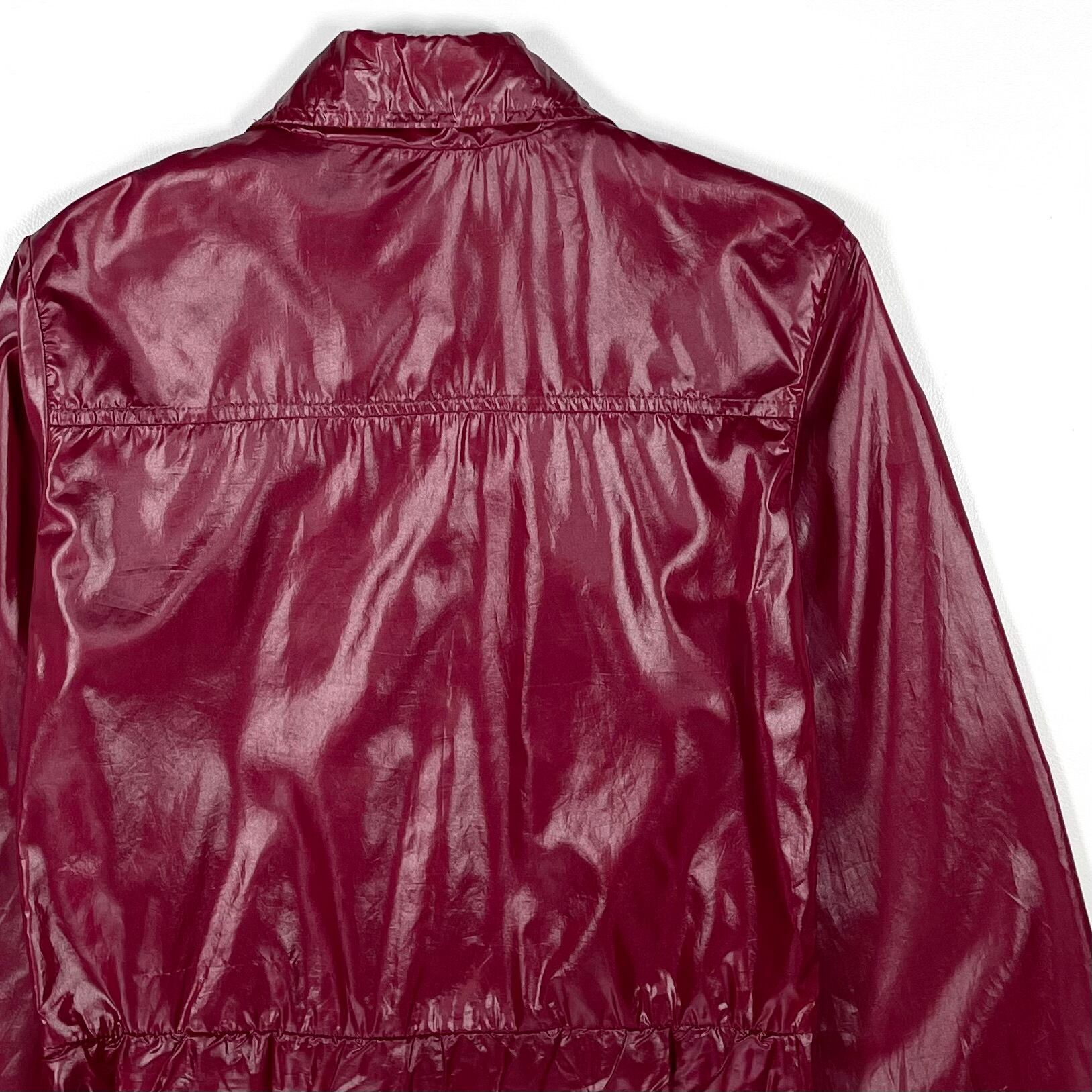 This is a 70s nylon jacket featuring a long collar that is emblematic of the era. The jacket has a tight silhouette with narrow shoulder and chest widths, and a short, compact length. It is a shirt-style nylon blouson with no lining. The elastic in the sleeves is loose and does not provide a tight fit.