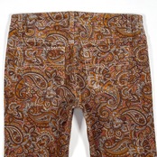 These are corduroy skinny jeans made from stretchy cotton. The fabric features a fine-wale corduroy with a brown paisley print. The jeans have a low-rise fit with a shallow front rise. There is some damage on the inside of the waistband.