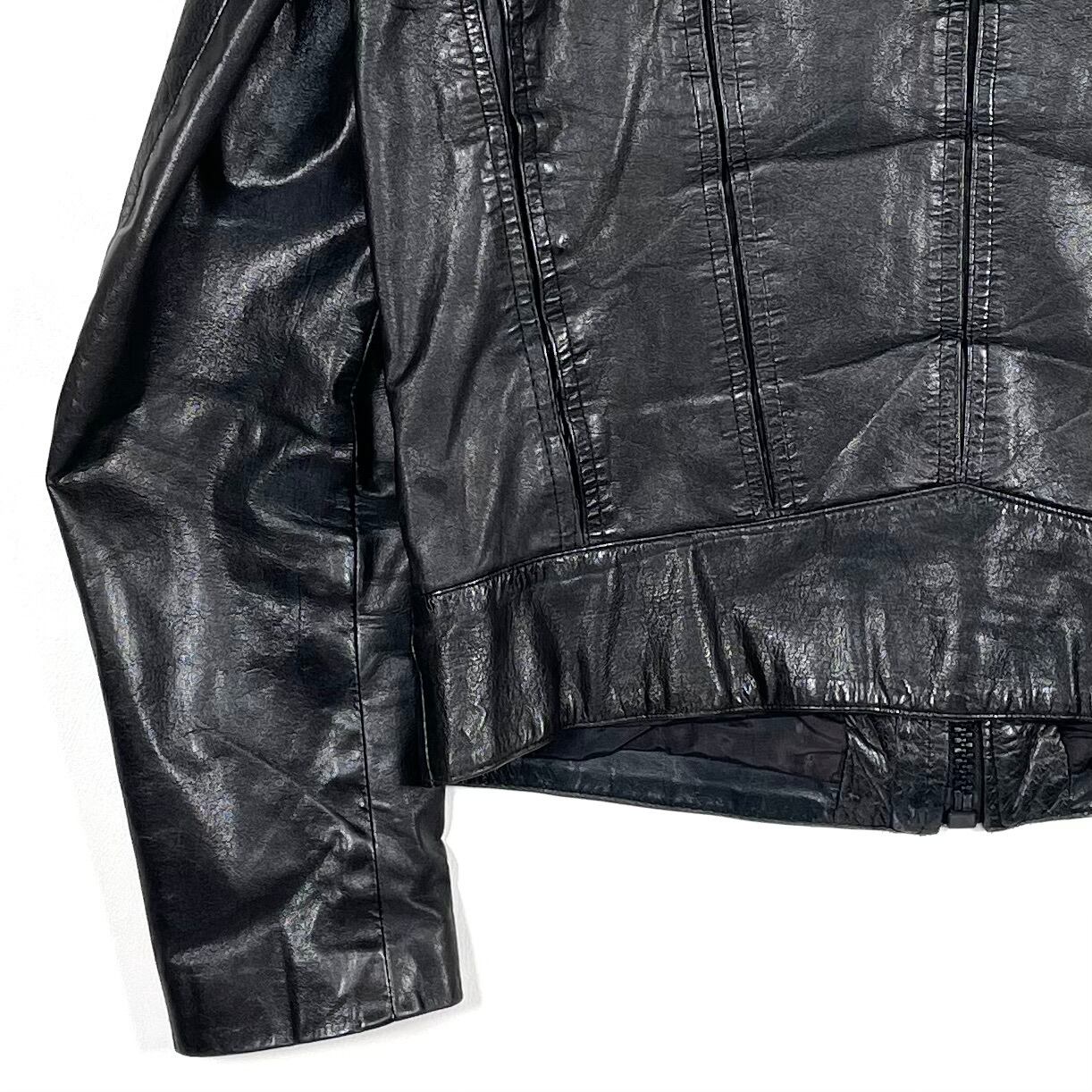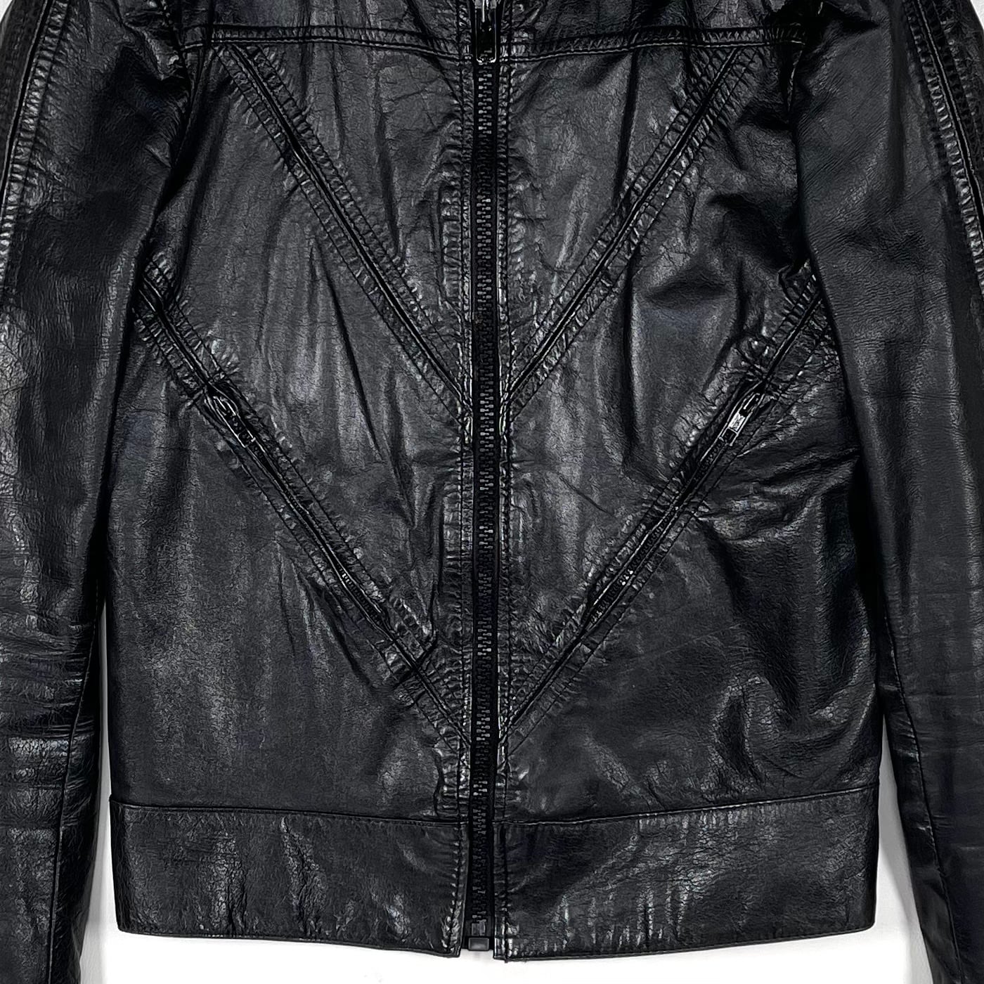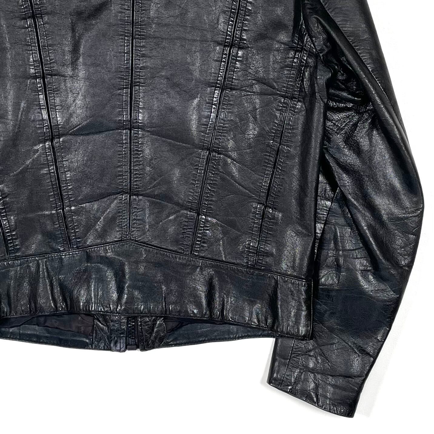 This leather jacket features a straight silhouette with a front black zipper. The front design includes a V-shaped seam with side pockets, and the seam creates a gusseted construction. The jacket is made from thin, soft lamb leather that has been well-worn, giving it a textured, wrinkled look with a lot of character. There is some damage to the lining.