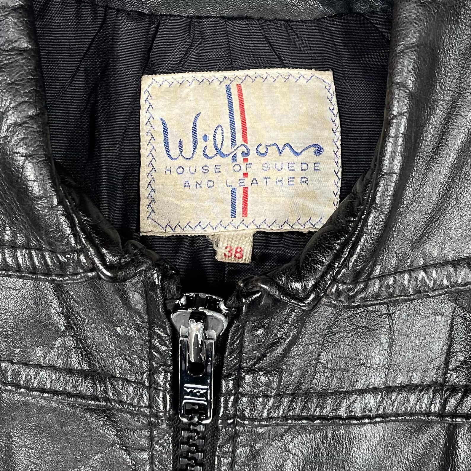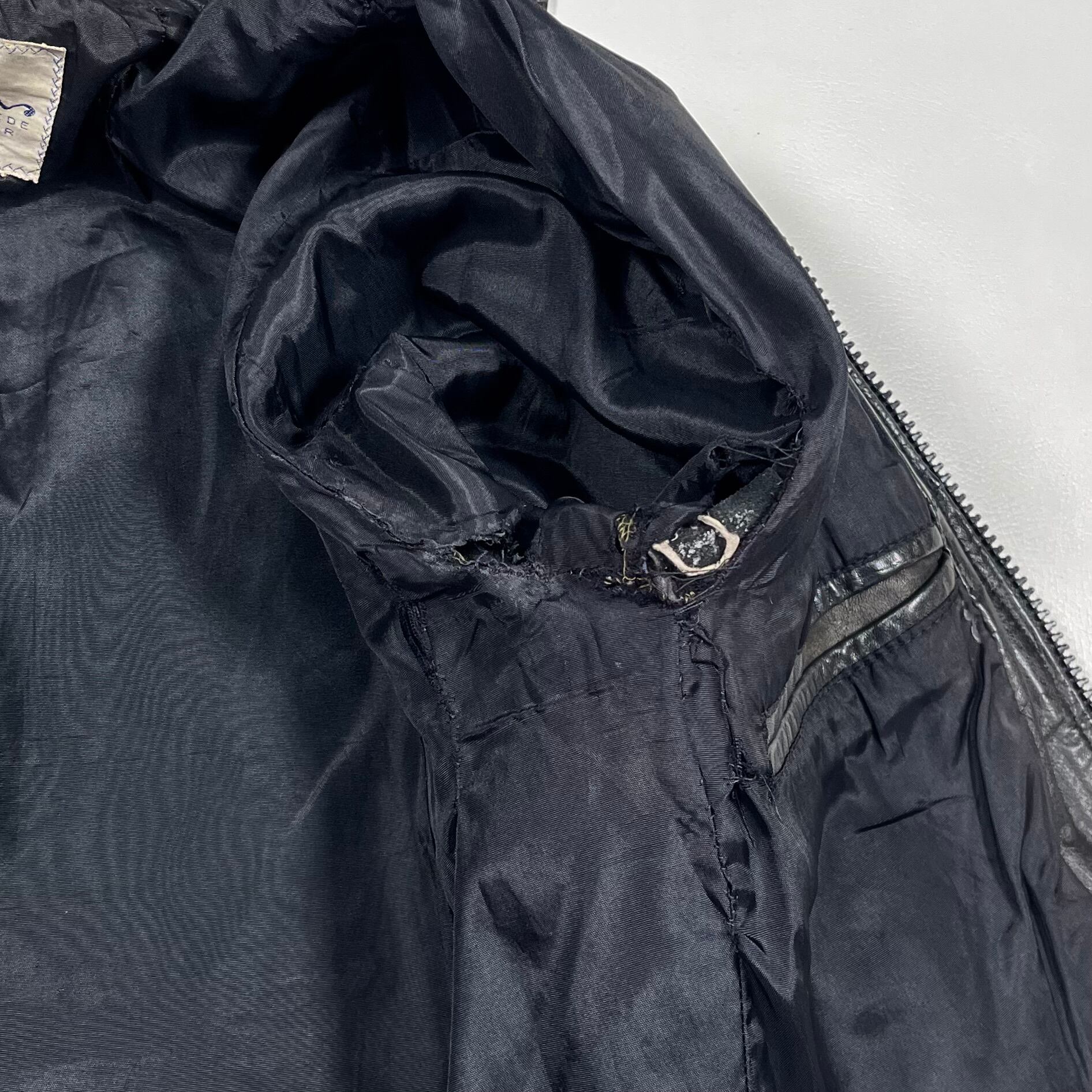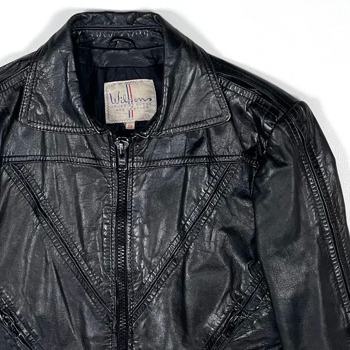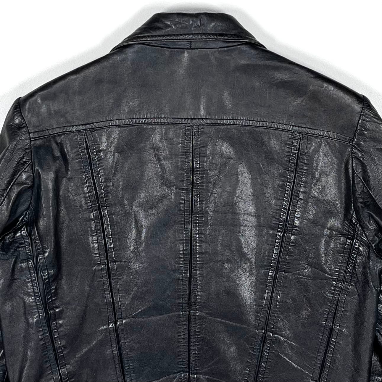 This leather jacket features a straight silhouette with a front black zipper. The front design includes a V-shaped seam with side pockets, and the seam creates a gusseted construction. The jacket is made from thin, soft lamb leather that has been well-worn, giving it a textured, wrinkled look with a lot of character. There is some damage to the lining.