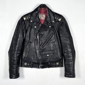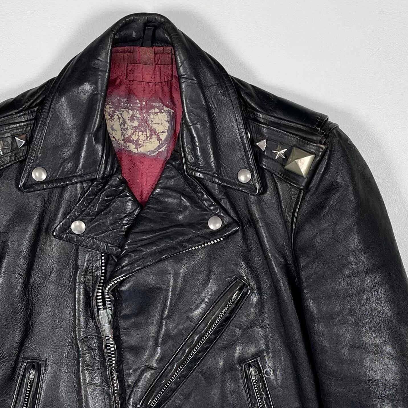 50s classic biker jacket. This jacket features high-quality leather with a brown core, giving it a rich, aged patina that adds to its character. It is adorned with star studs and a balanced mix of large and small pyramid studs, making it a unique and high-quality item. Due to its age, the leather shows wrinkles and wear from use, and some studs have tarnished or developed a green patina.