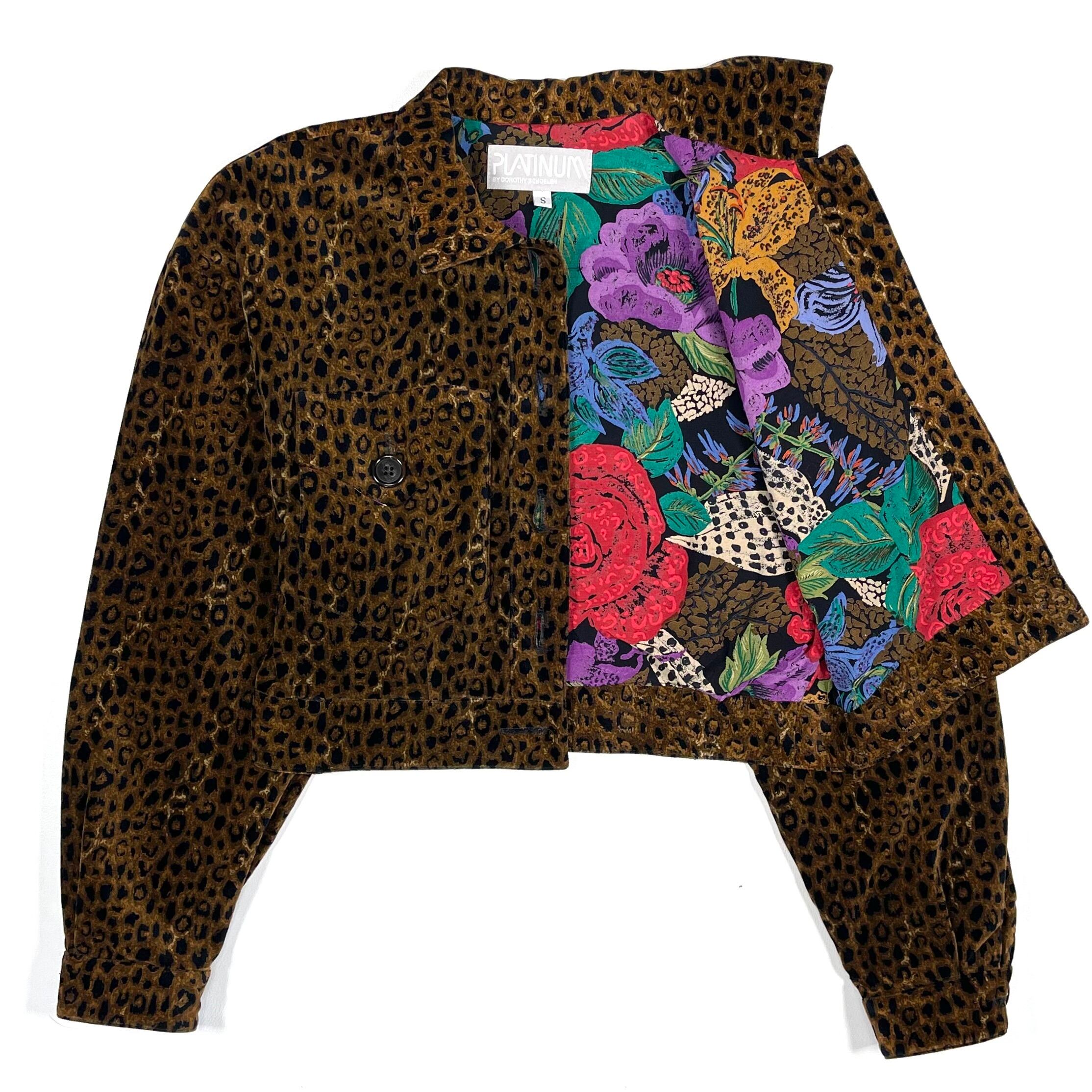 Leopard print trucker jacket with a flower print on the back.