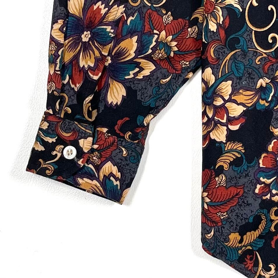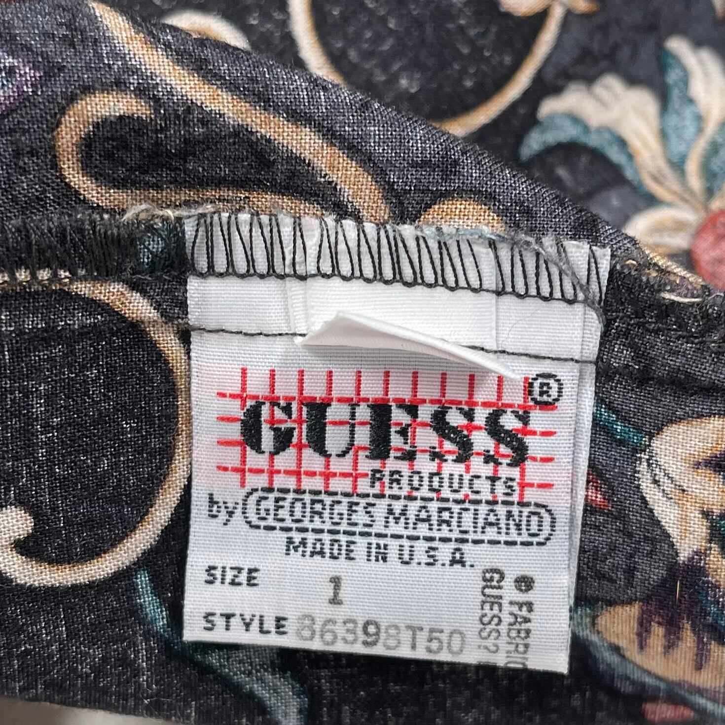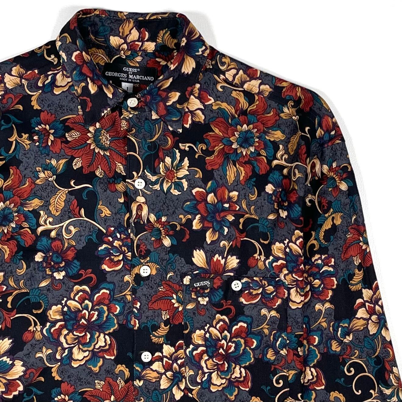 This is a rayon shirt by GUESS featuring a rich botanical pattern. It includes a chest pocket with a GUESS label attached. The shirt has a loose silhouette with extra room in the shoulders and chest. The tag indicates it was made in 1990, and the shirt is made in the U.S.A. There is a small, inconspicuous mark near the cuff buttons.