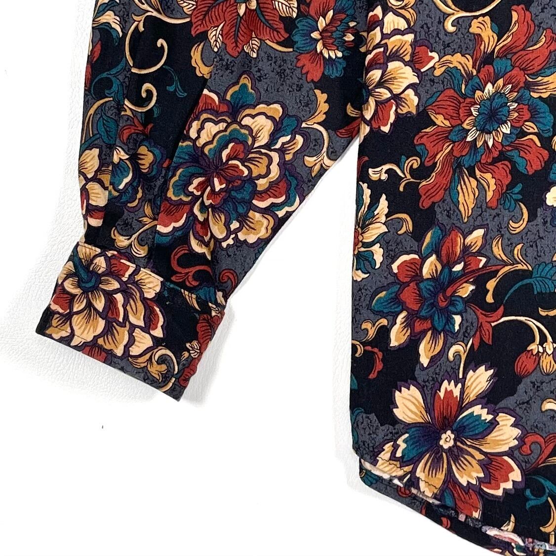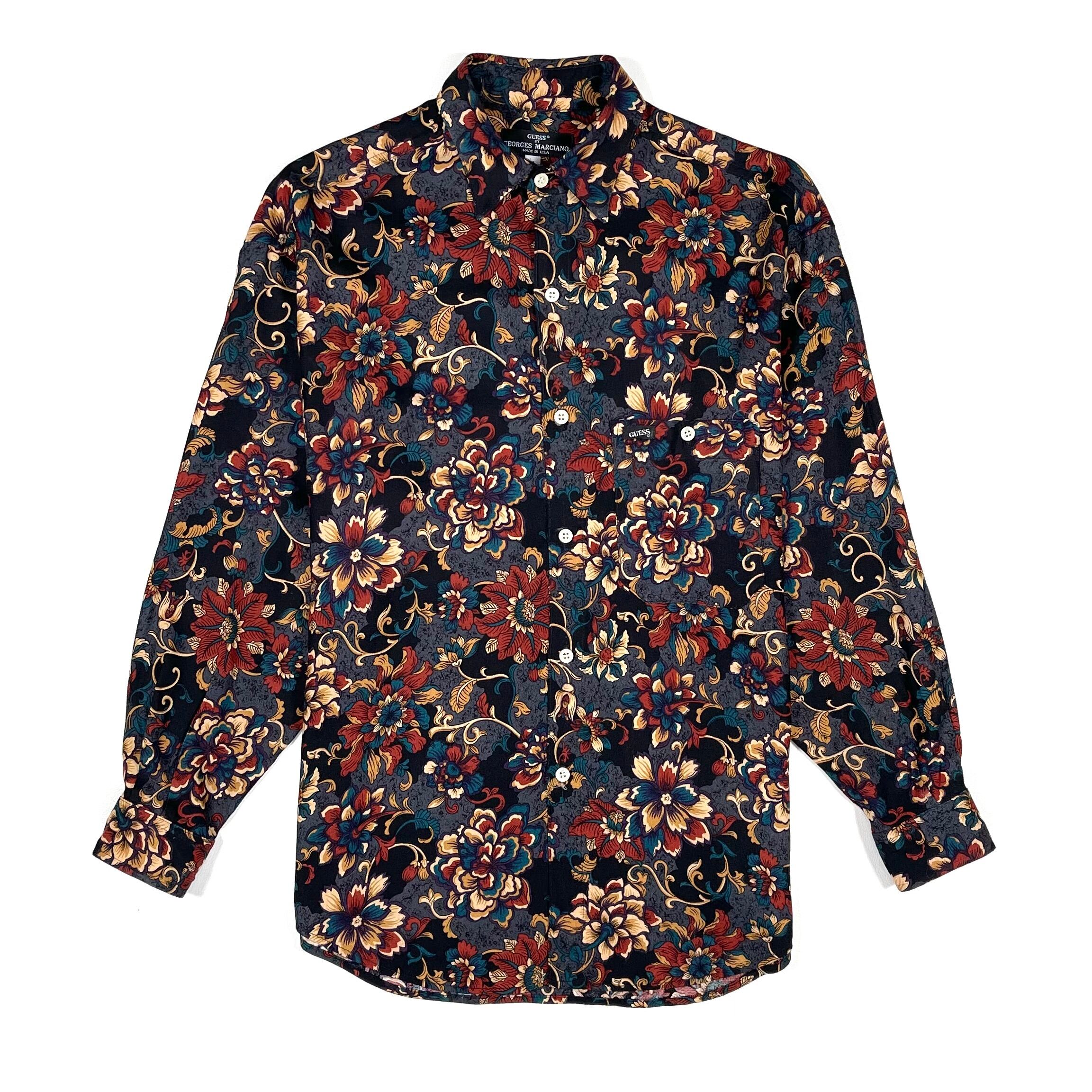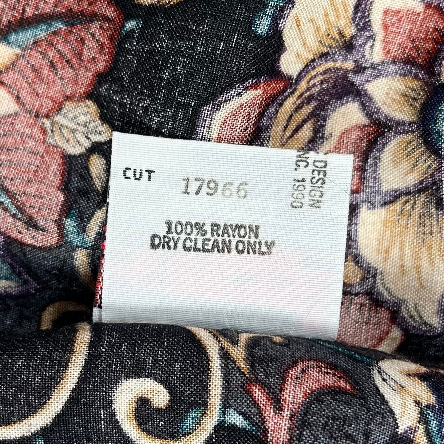 This is a rayon shirt by GUESS featuring a rich botanical pattern. It includes a chest pocket with a GUESS label attached. The shirt has a loose silhouette with extra room in the shoulders and chest. The tag indicates it was made in 1990, and the shirt is made in the U.S.A. There is a small, inconspicuous mark near the cuff buttons.