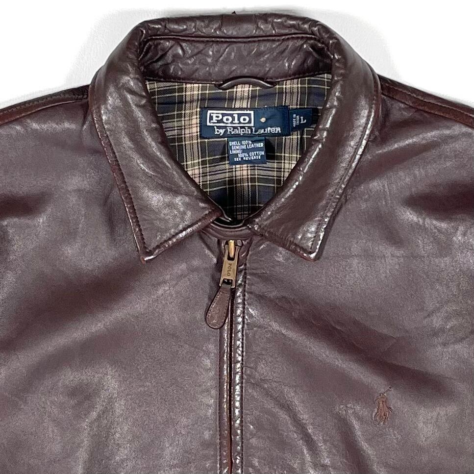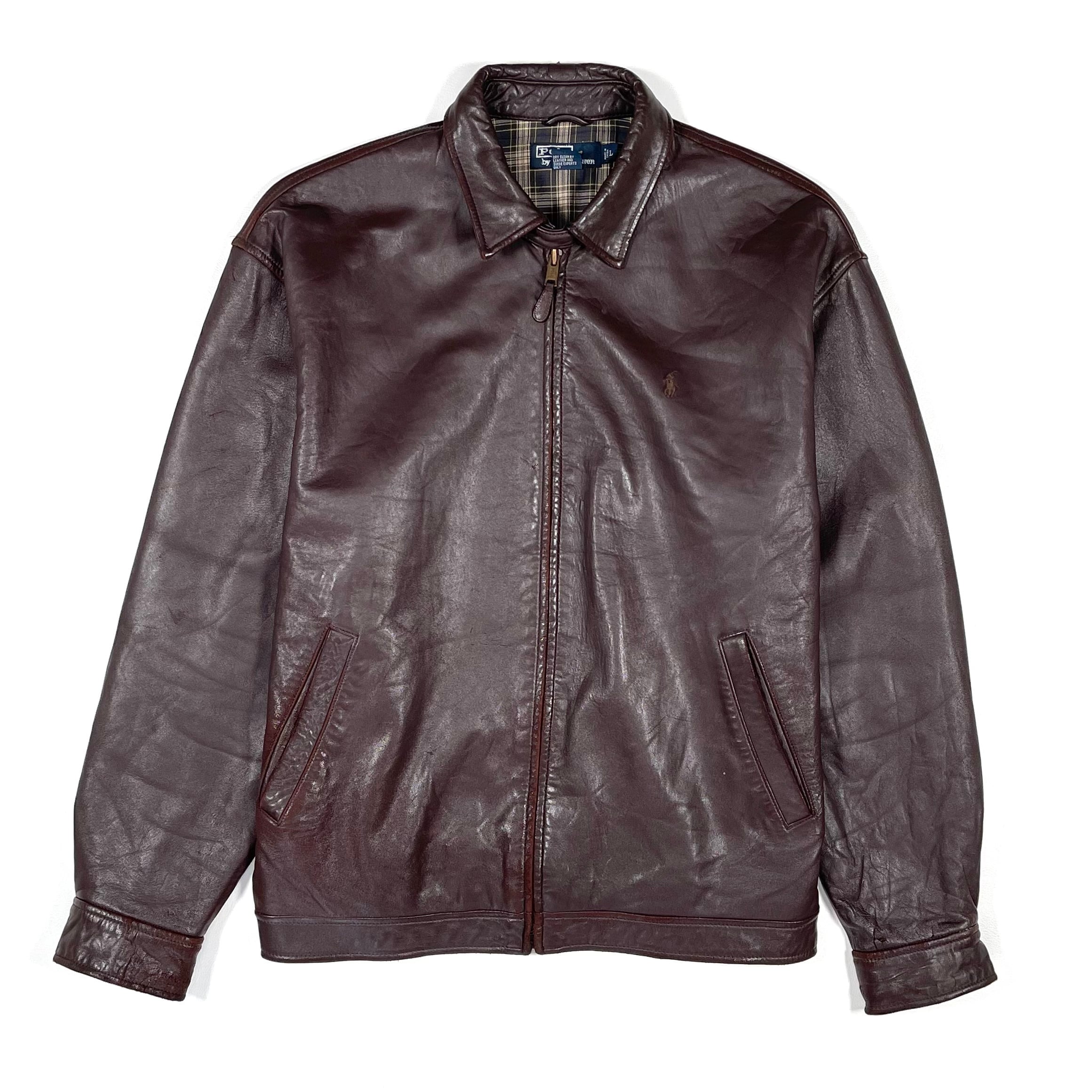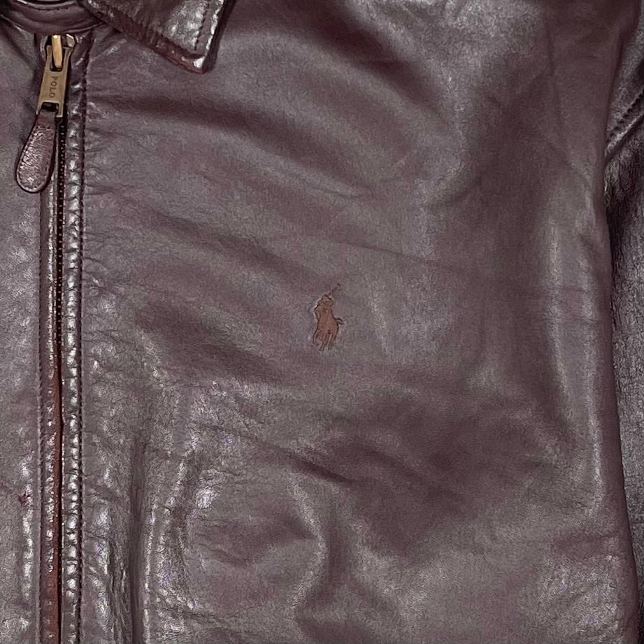 This is an oversized jacket by Polo by Ralph Lauren, made from soft brown lamb leather. It features the iconic Polo logo embroidery on the chest. The jacket has a roomy, oversized silhouette, and the worn leather gives it a great vintage look. There are some scuffs and small scratches from wear, adding character to the jacket. Note that the sleeve buttons are usually two on each side, but one button is missing from each sleeve, leaving stitching marks behind.