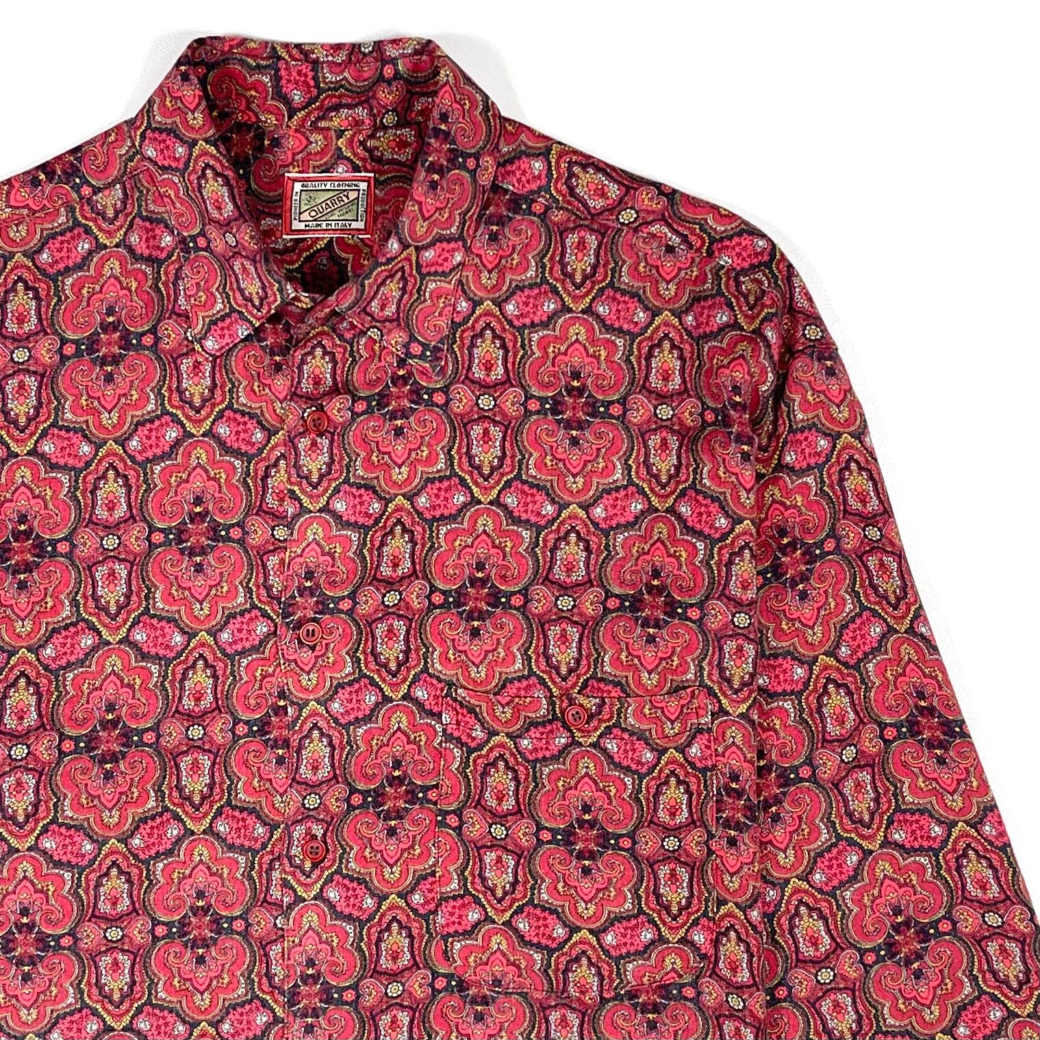 A loose-fitting shirt with an oriental pattern. The color palette features coral, yellow, and charcoal gray, beautifully outlined to highlight the oriental design. The fabric is a drapey rayon material, offering a relaxed and comfortable loose silhouette. Made in Italy.