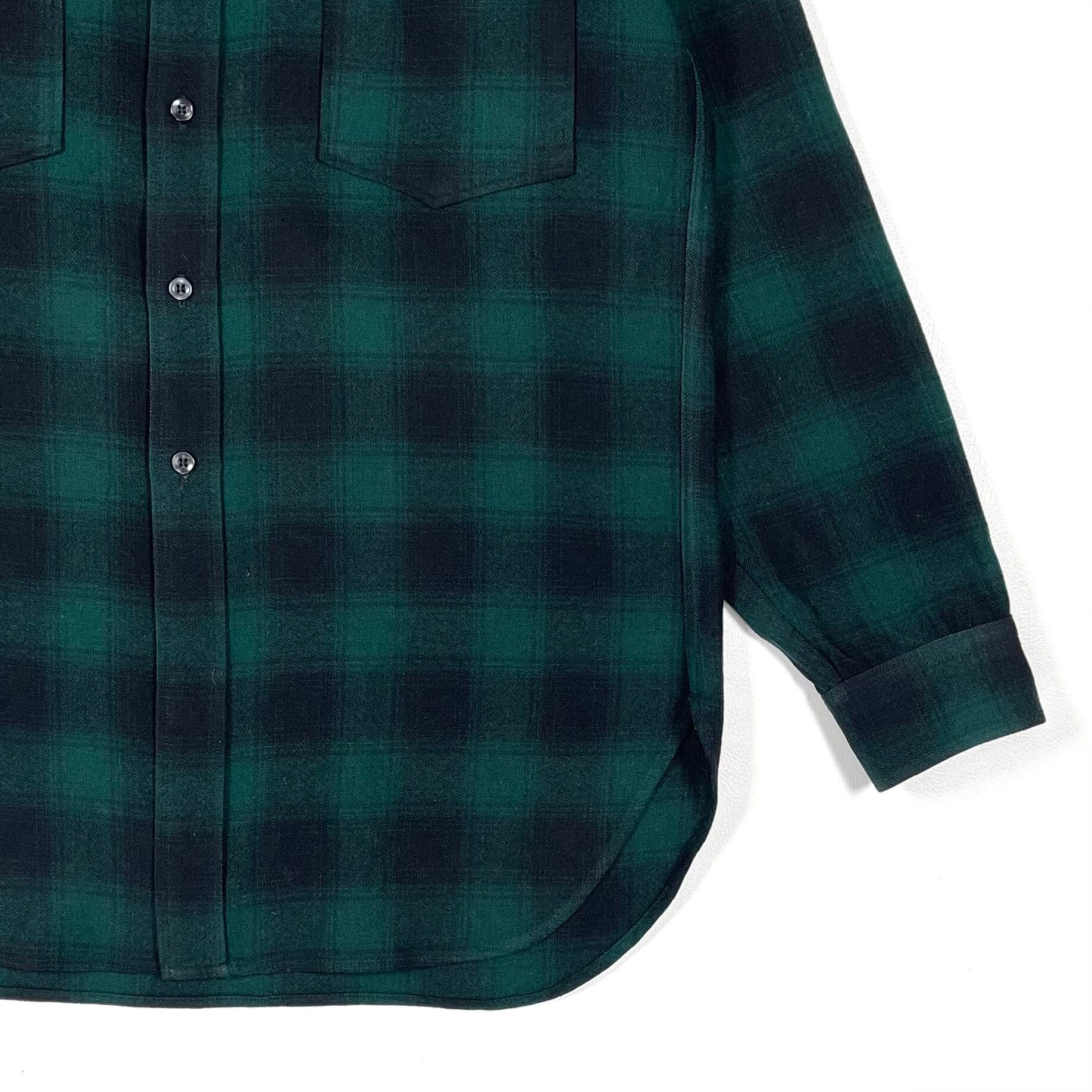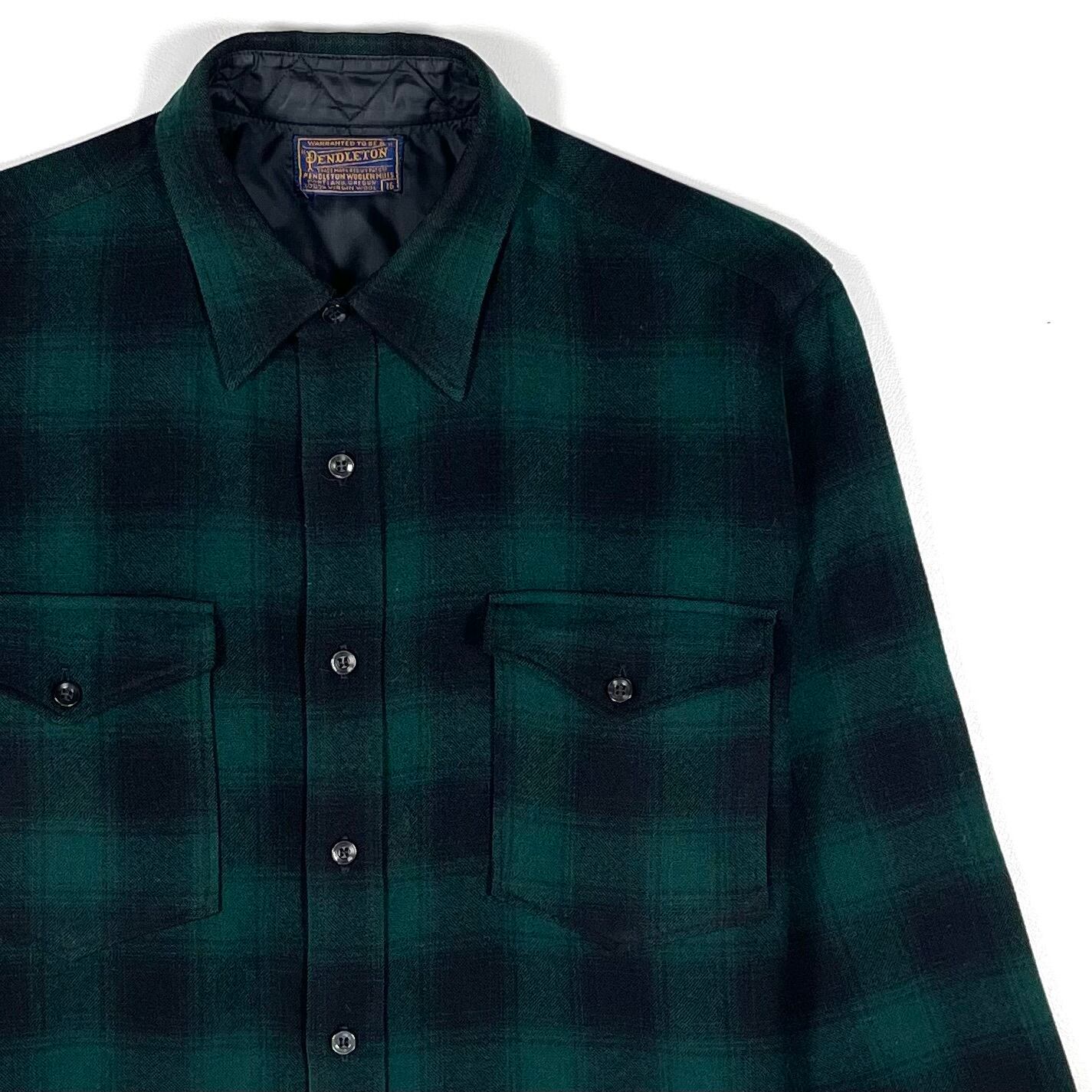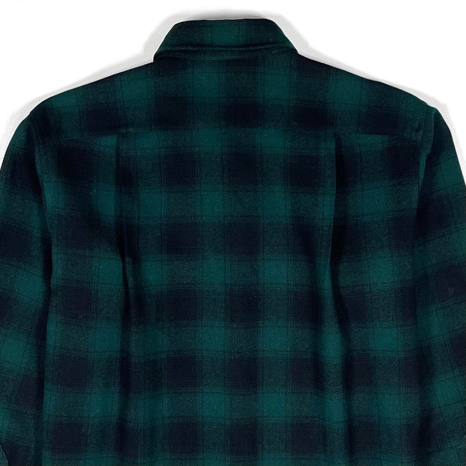 A 50s PENDLETON wool check shirt made from 100% VIRGIN WOOL. It features a green and black check pattern. There is some damage to the collar and a small pinhole near the button on the left front side.
