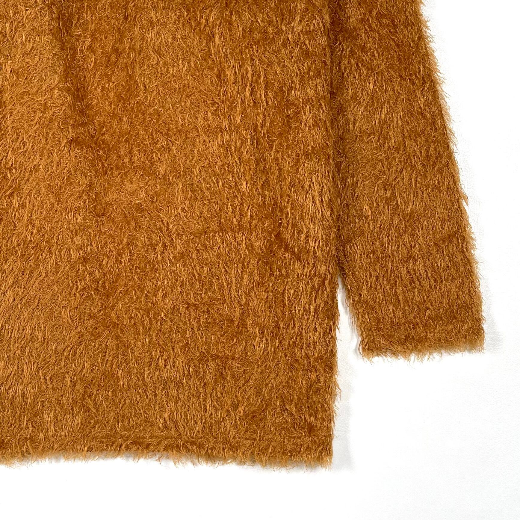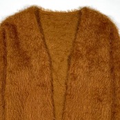 Shaggy cardigan made from an acrylic knit material with a soft, fluffy texture. The color is a camel with an orange hue. This cardigan features an open front with no buttons, making it an easy and lightweight layering piece in a lovely color.