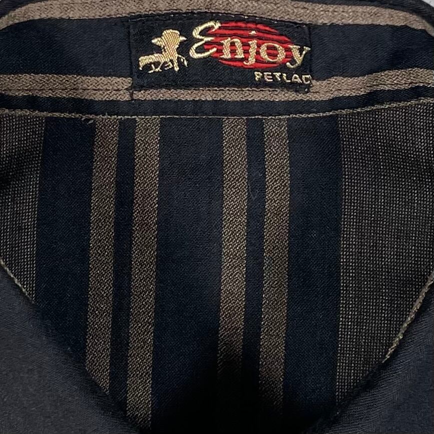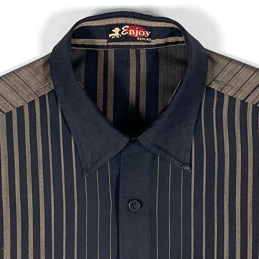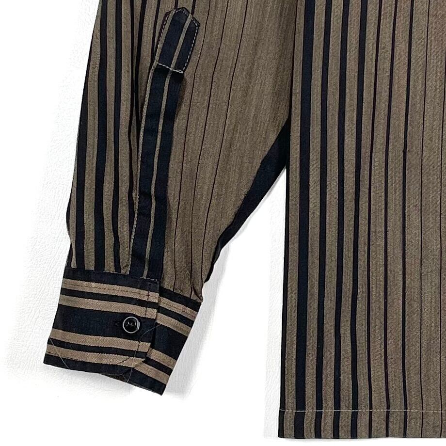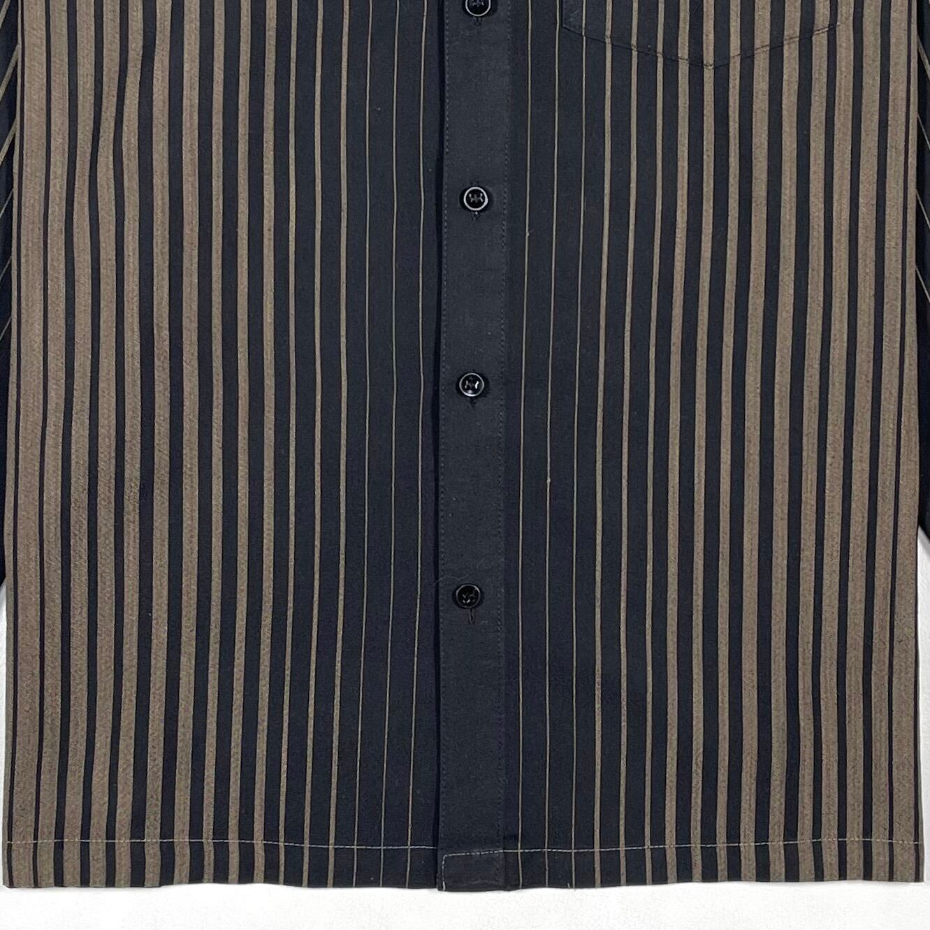 Classic striped shirt with a khaki brown and black gradient stripe pattern. Made of polyester and cotton. This stripe shirt perfectly matches a classic style. While there are no major damages, there are minor, unnoticeable weaving imperfections.