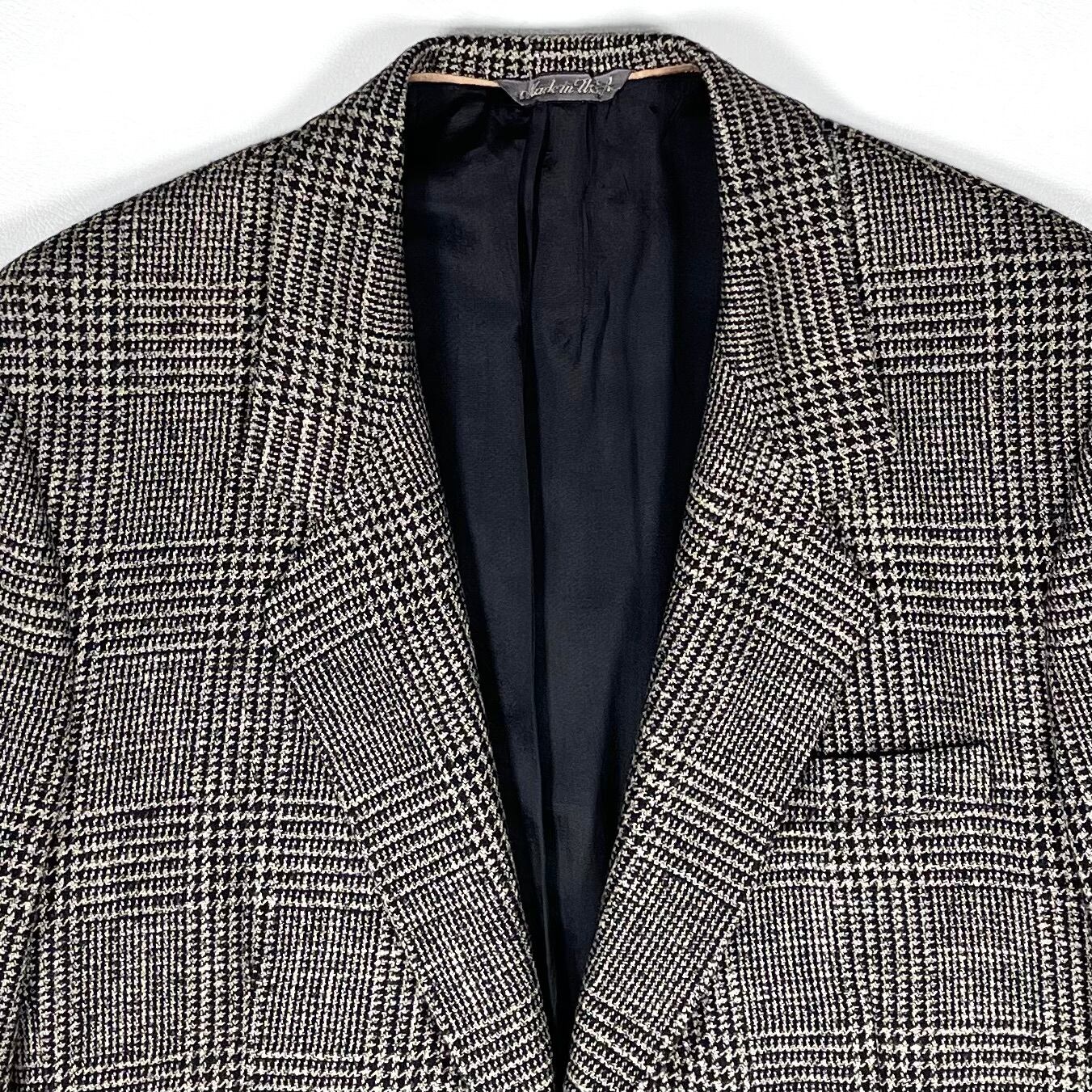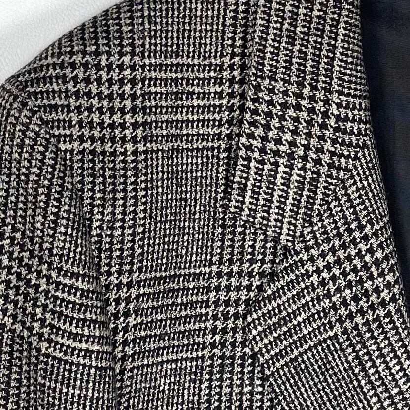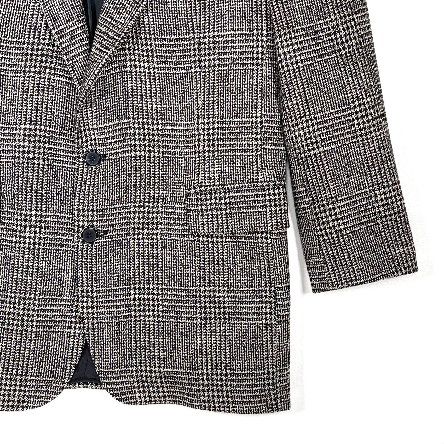 A loose-fitting tailored jacket featuring a sand beige and black glen check pattern. The front has two buttons, and the sleeves have four buttons. No vent. The shoulders slightly drop, giving a boxy silhouette. The long length adds balance to the silhouette of this long jacket. The material feels soft, likely a wool blend with silk. Made in the U.S.A.